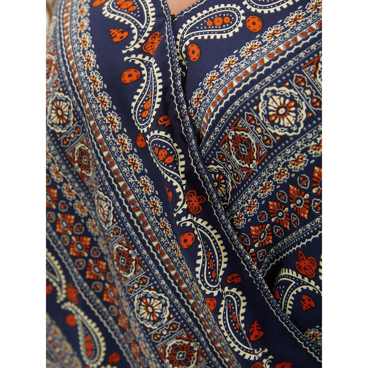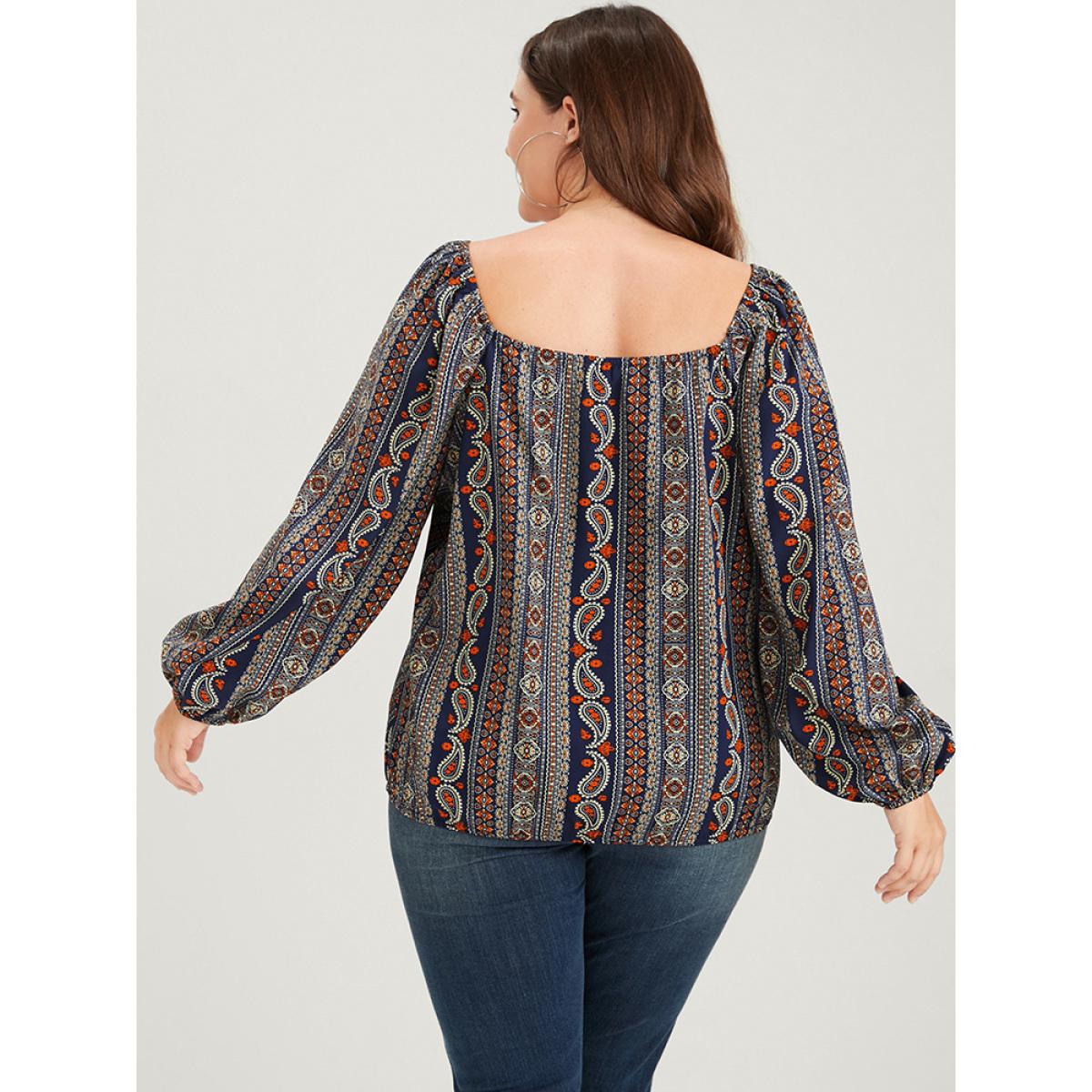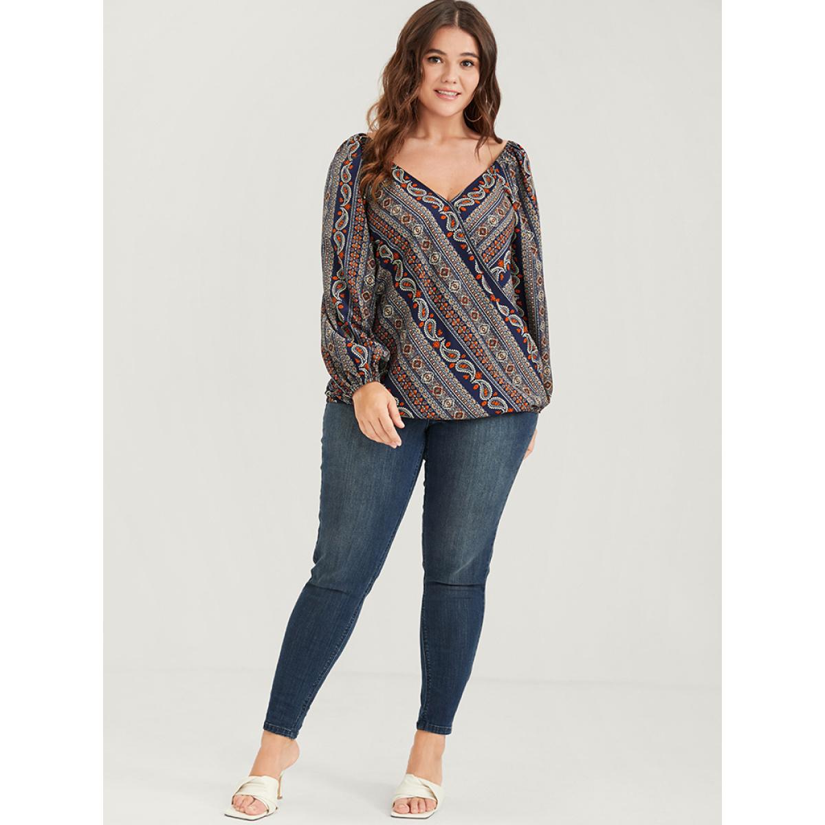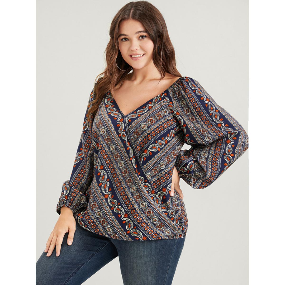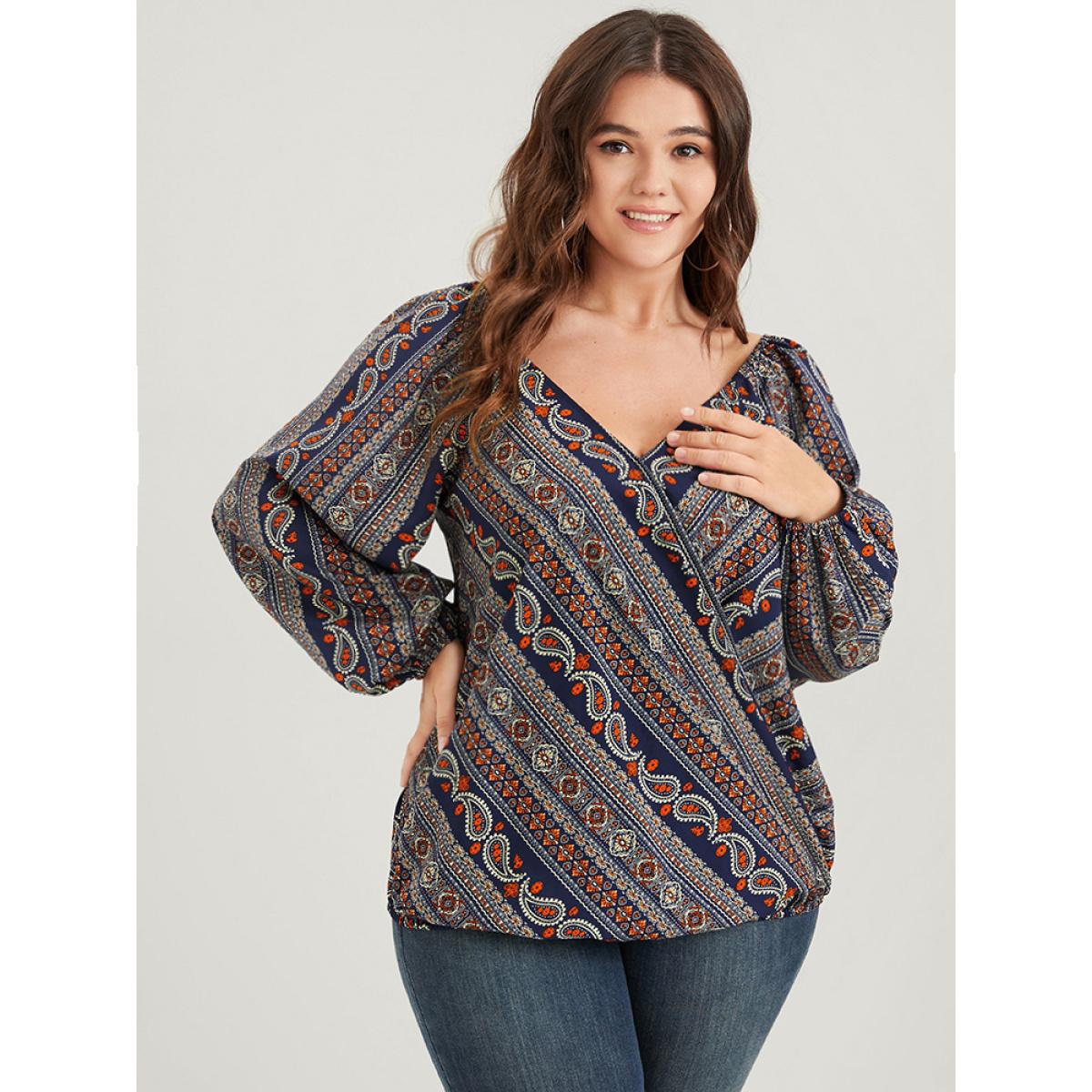 Plus Size DarkBlue Bandana Striped Lantern Sleeve Button Backless Wrap Blouse Women Elegant Long Sleeve V-neck Dailywear Blouses BloomChic 12/L