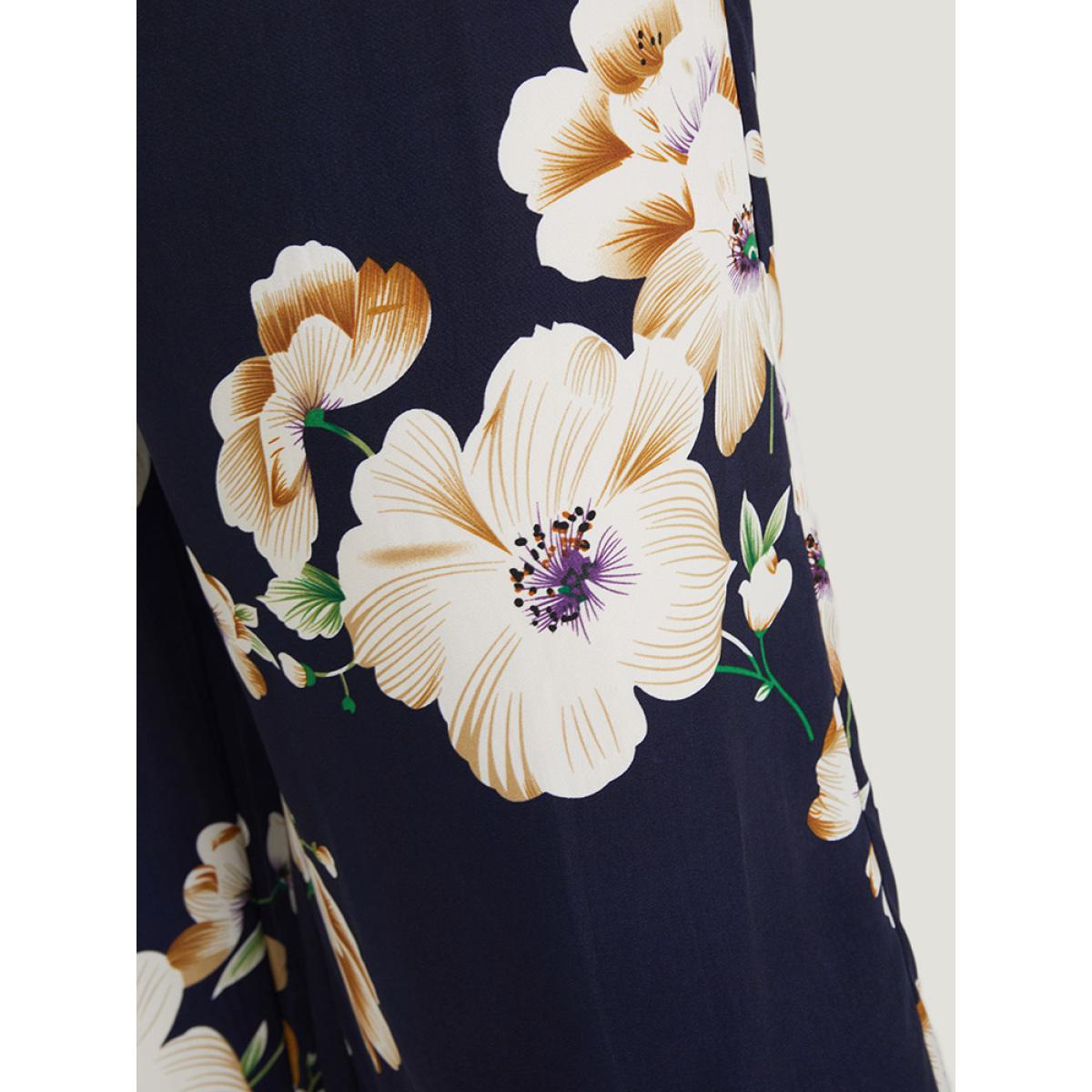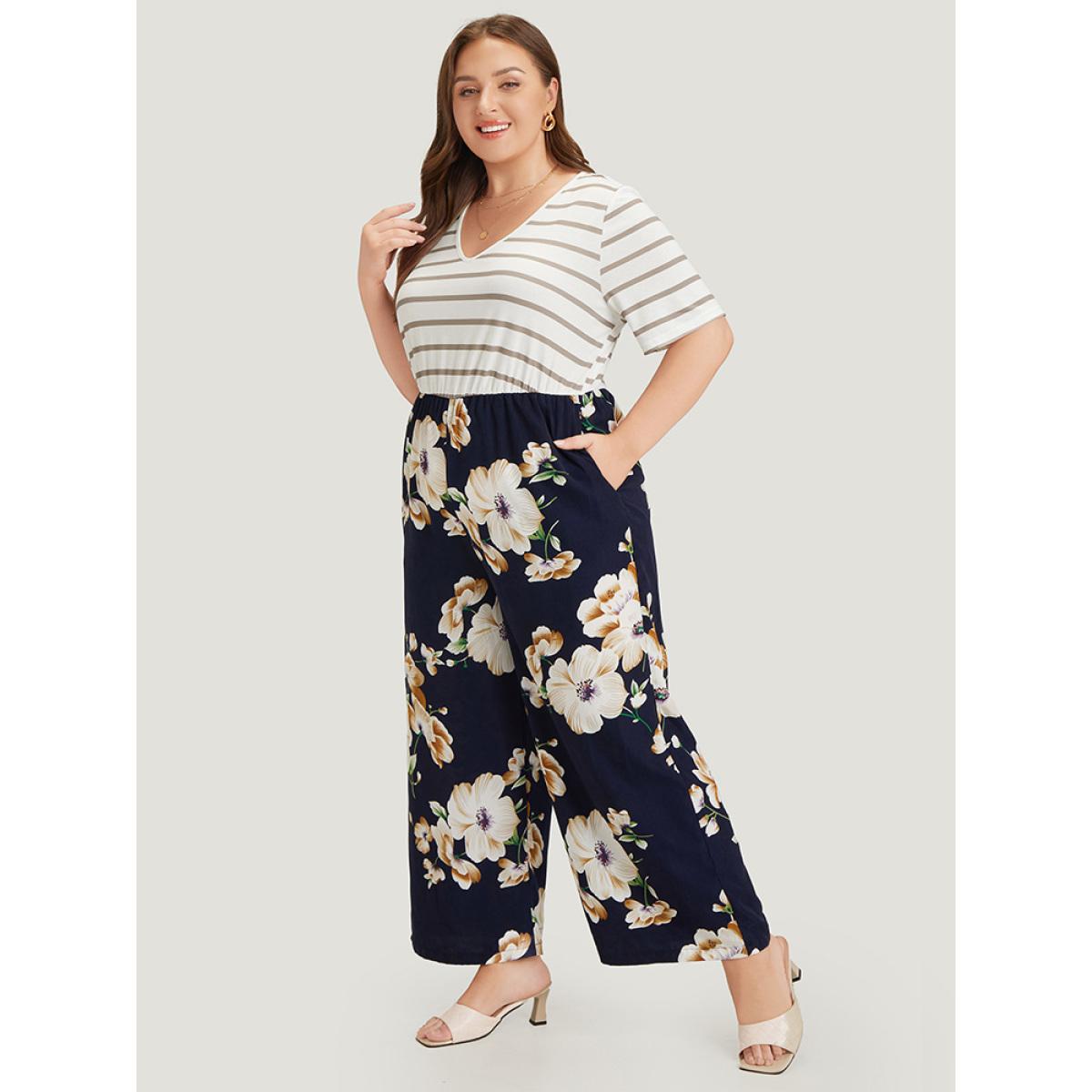 Plus Size DarkBlue Striped & Floral Patchwork Pocket Jumpsuit Women Elegant Short sleeve V-neck Dailywear Loose Jumpsuits BloomChic 30/6X
