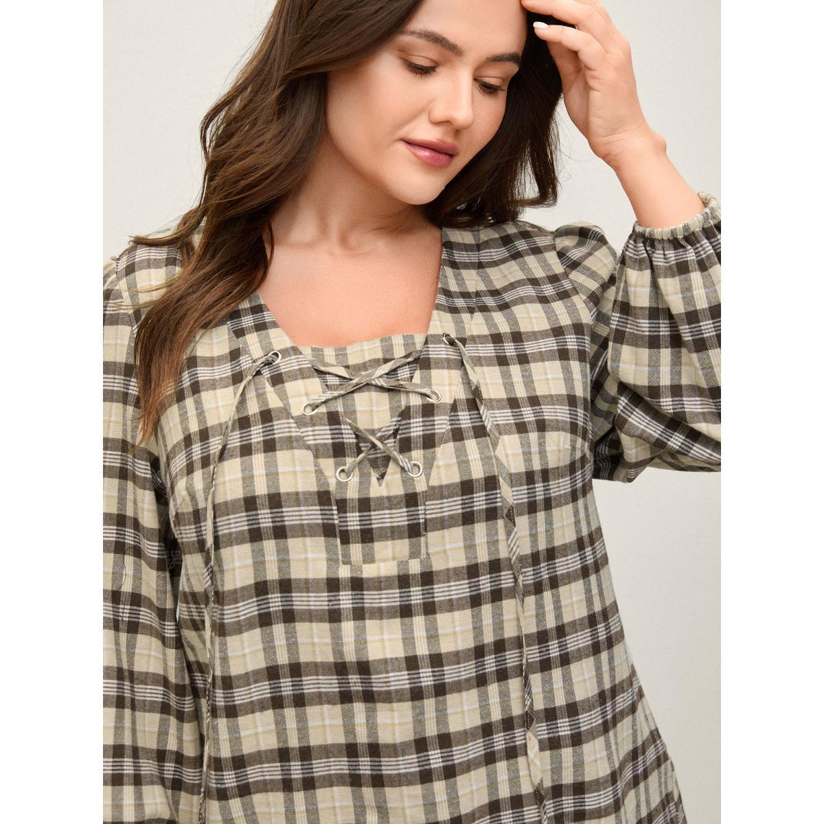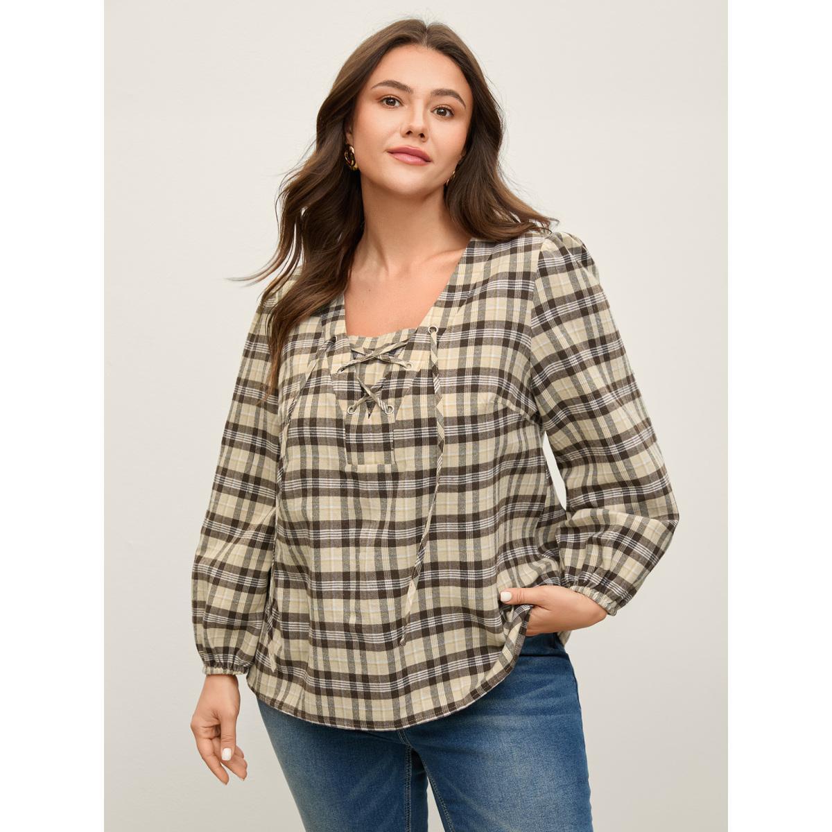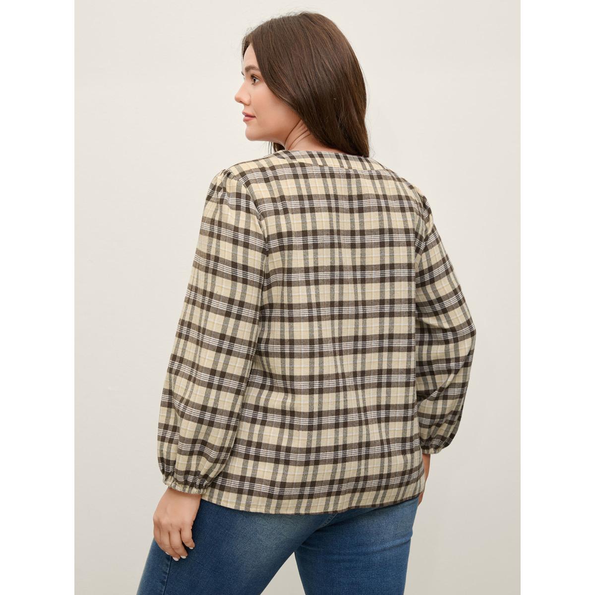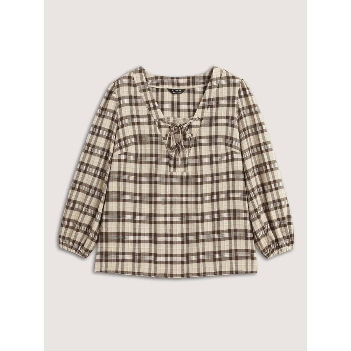 Plus Size DarkBrown Plaid Print Neck Tie-Up Blouse Women Leisure Long Sleeve V-neck Office Blouses BloomChic 12/L
