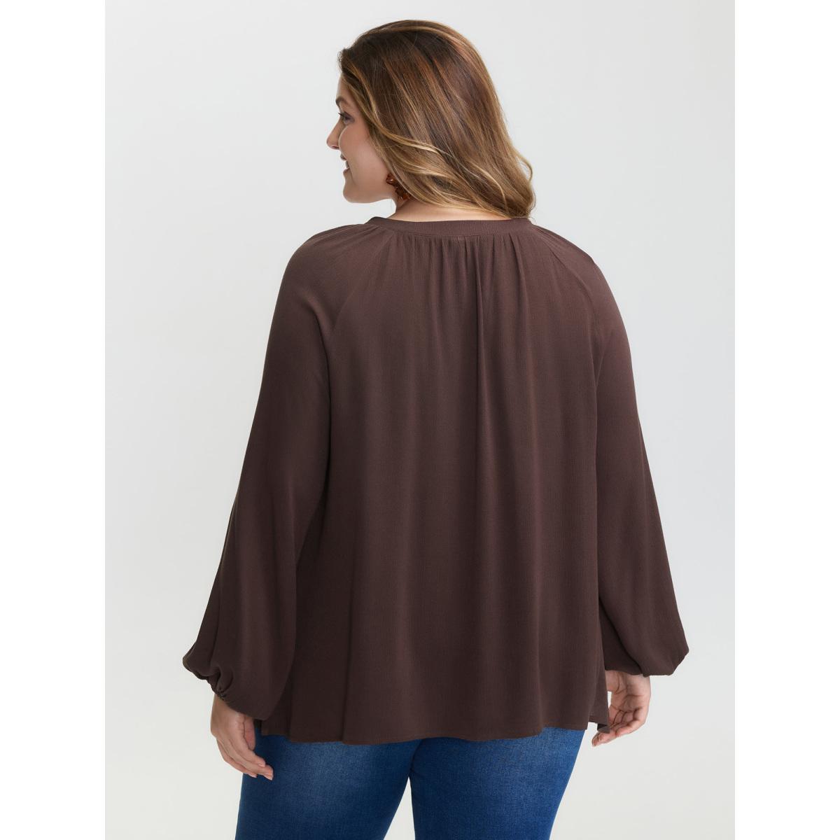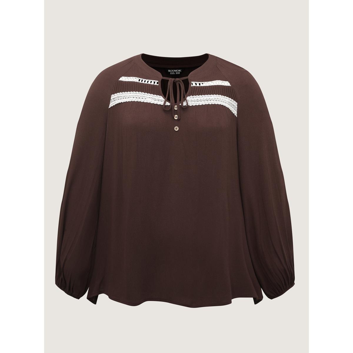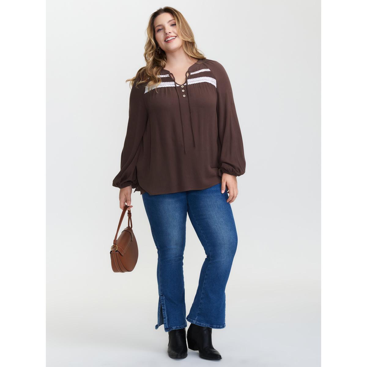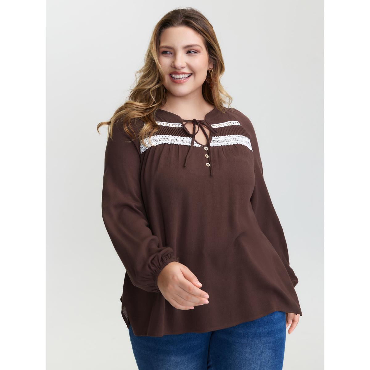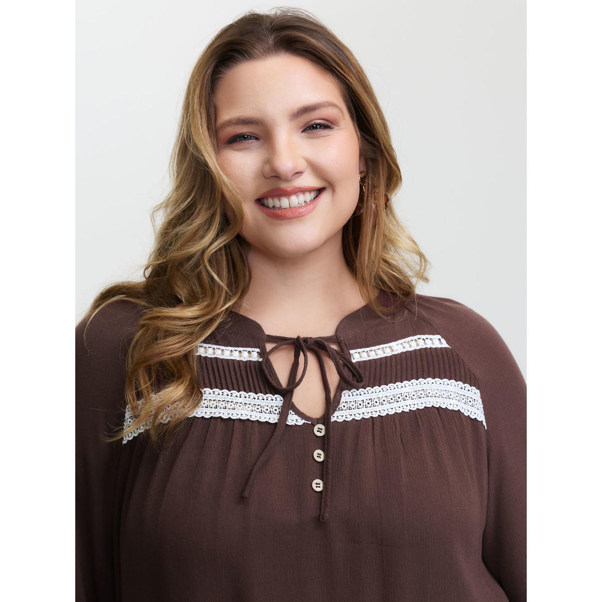 Plus Size DarkBrown Pure Cotton Lace Trim Blouse Women Boho Long Sleeve Flat collar with V-notch Vacation Blouses BloomChic 30/6X