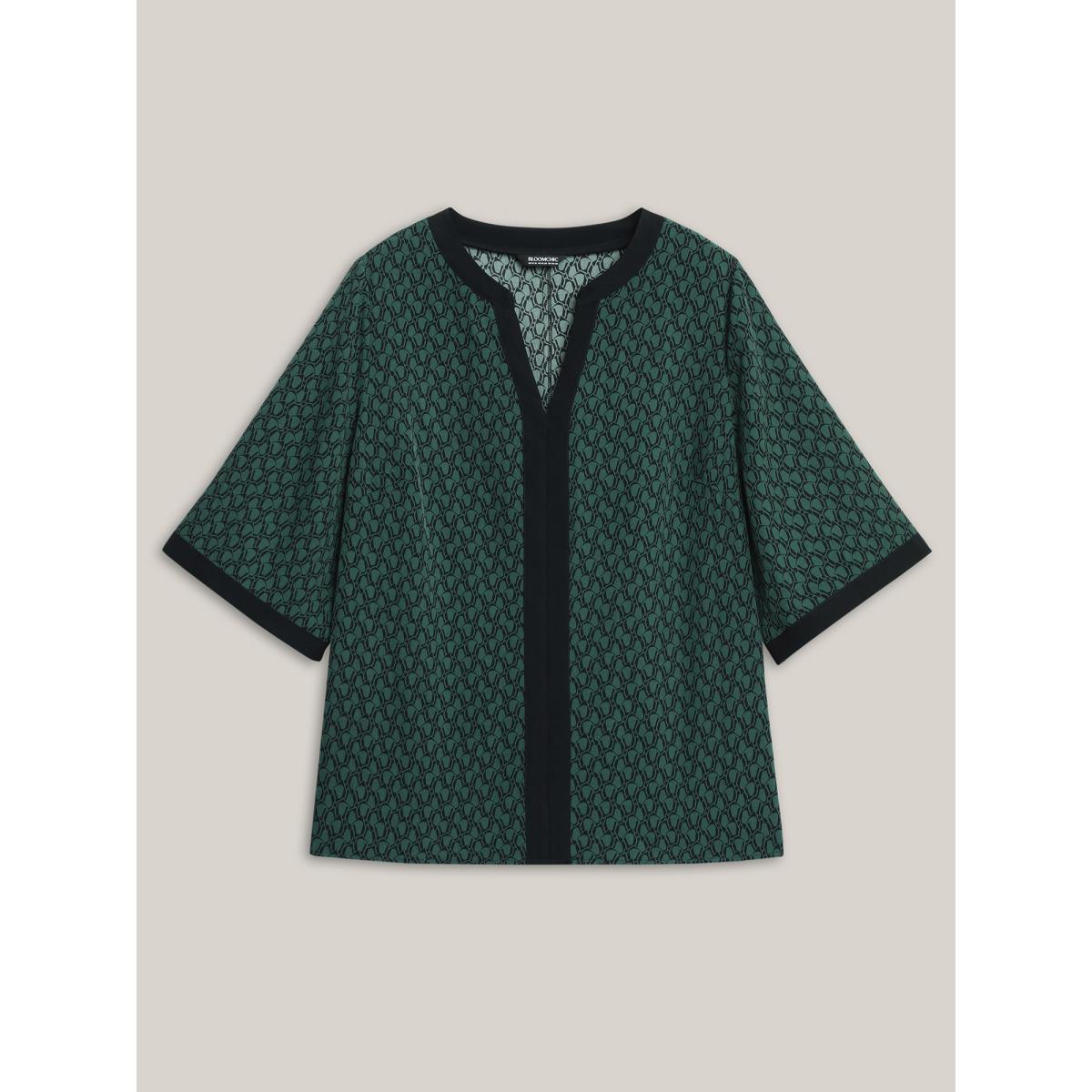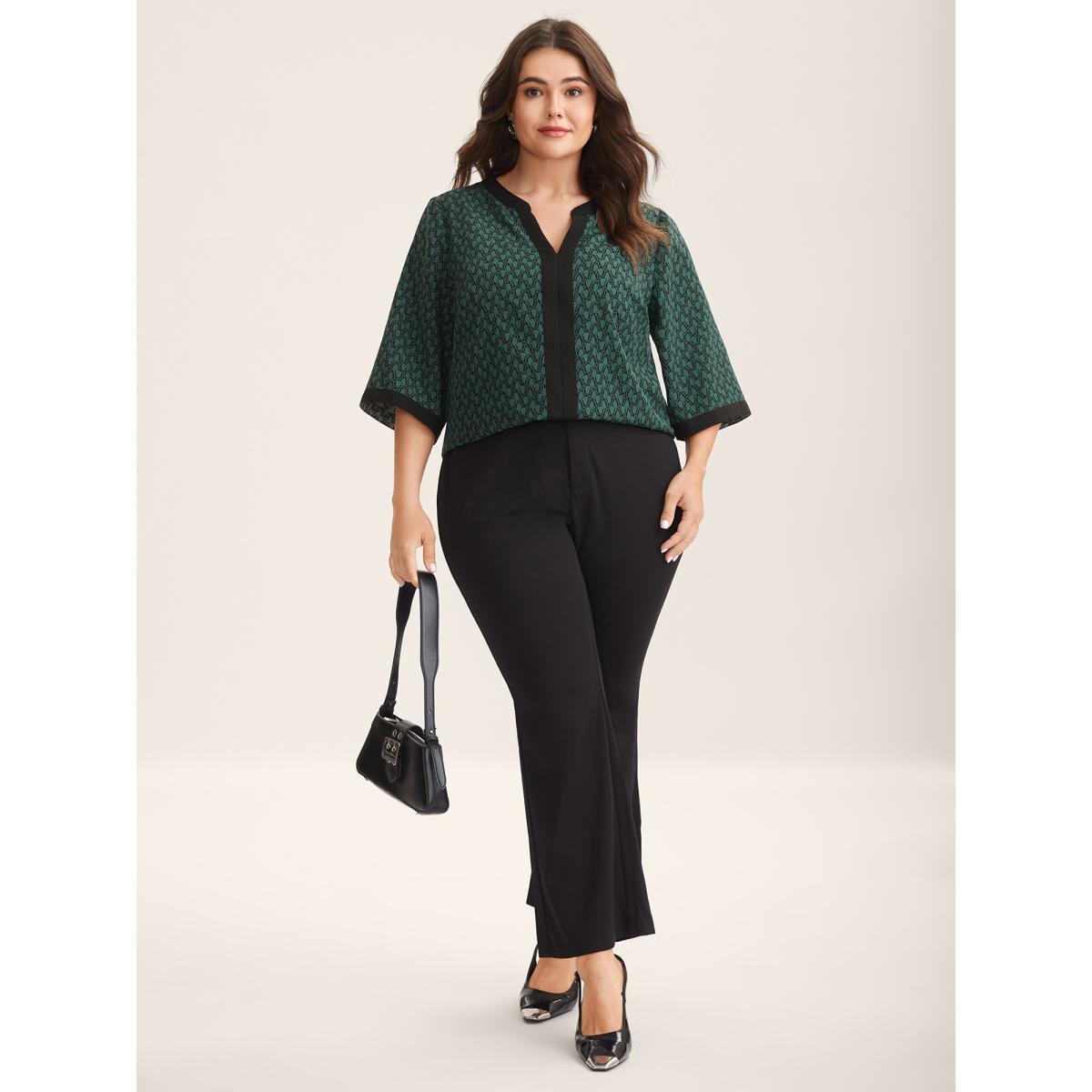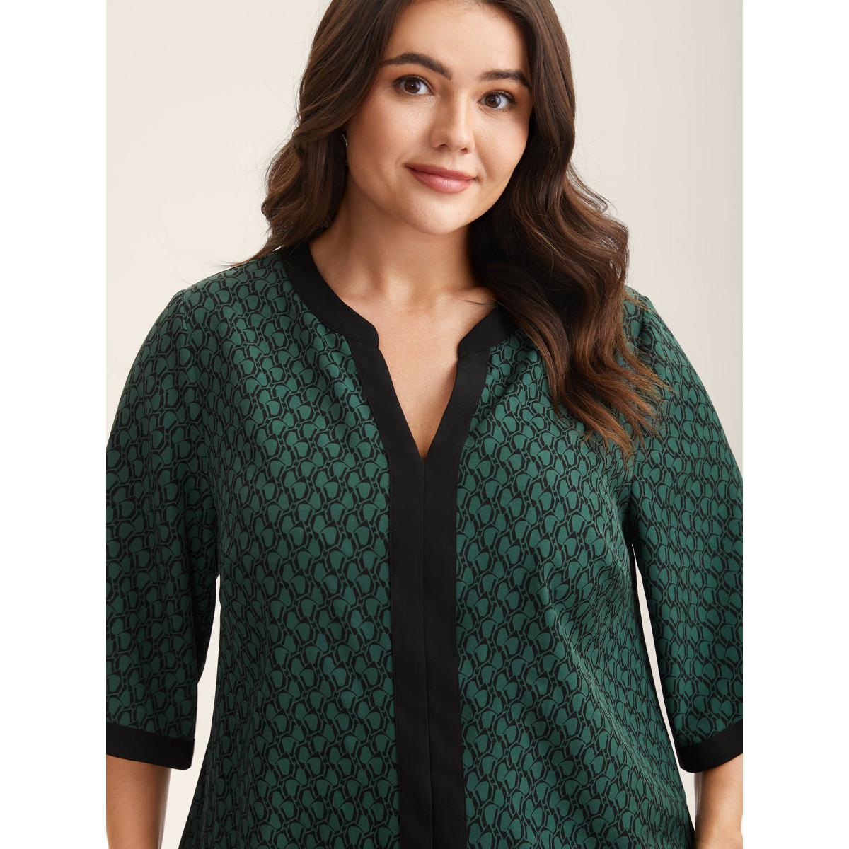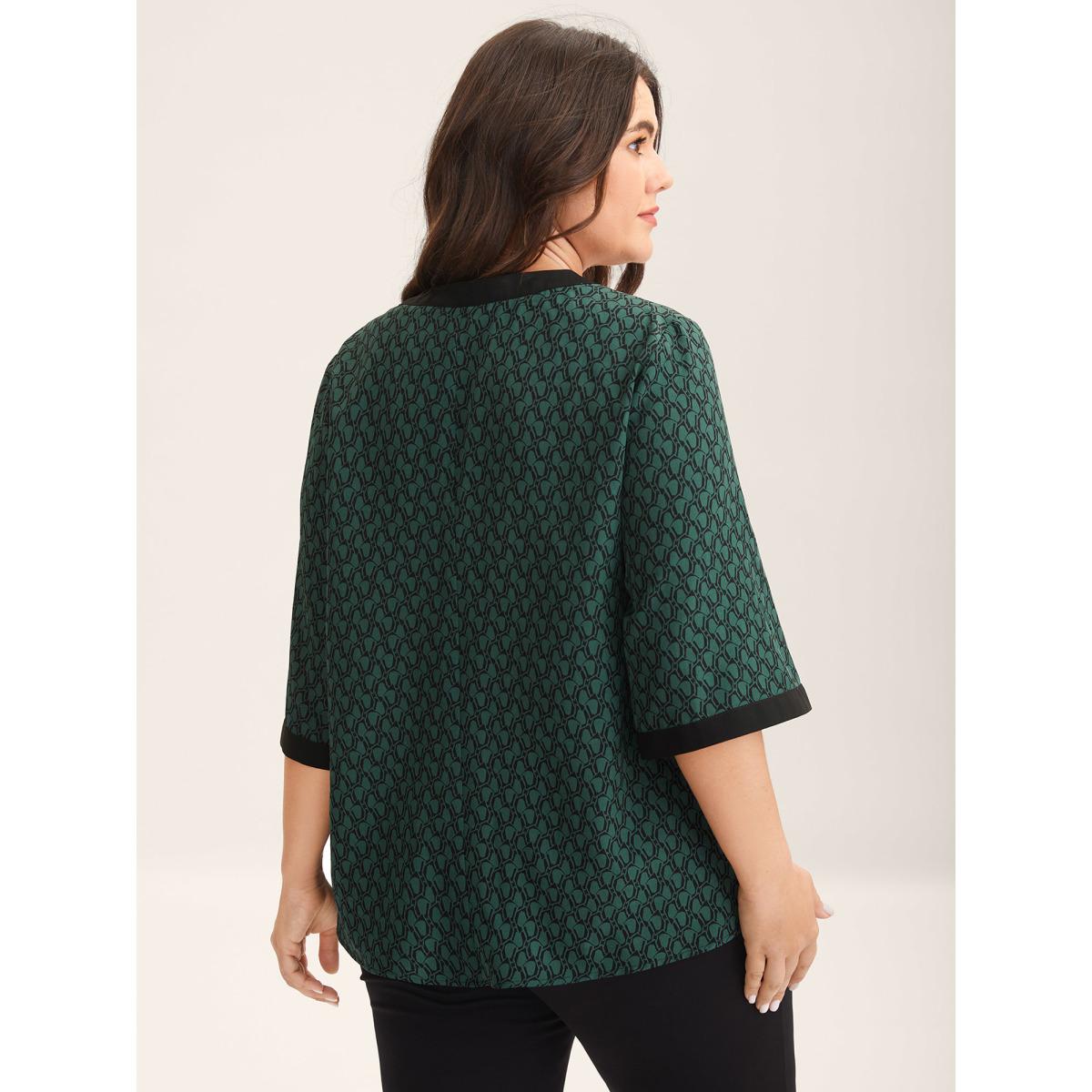 Plus Size DarkGreen Geometric Print Color Contrast Blouse Women Elbow-length sleeve Flat collar with V-notch Work Blouses BloomChic 22-24/3X