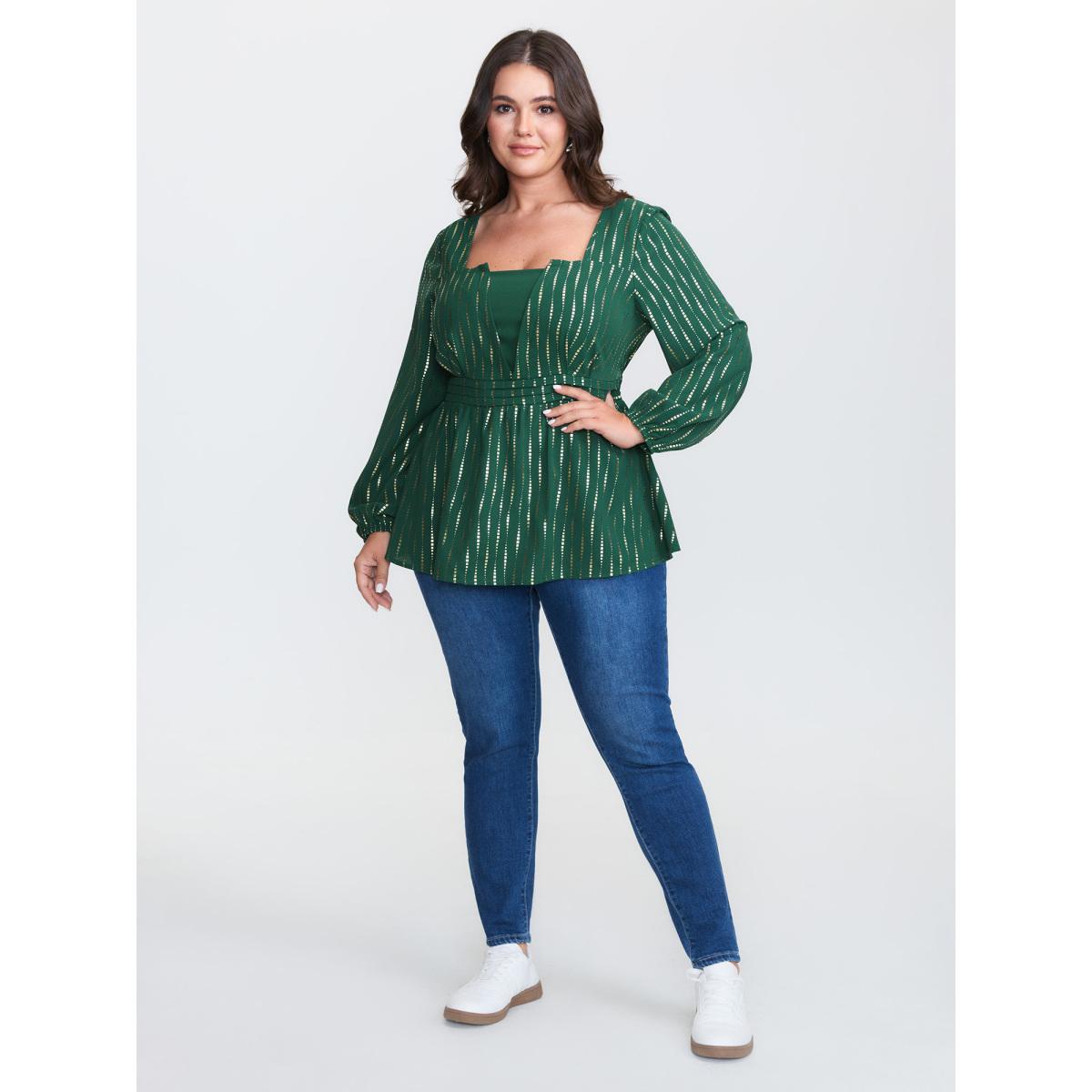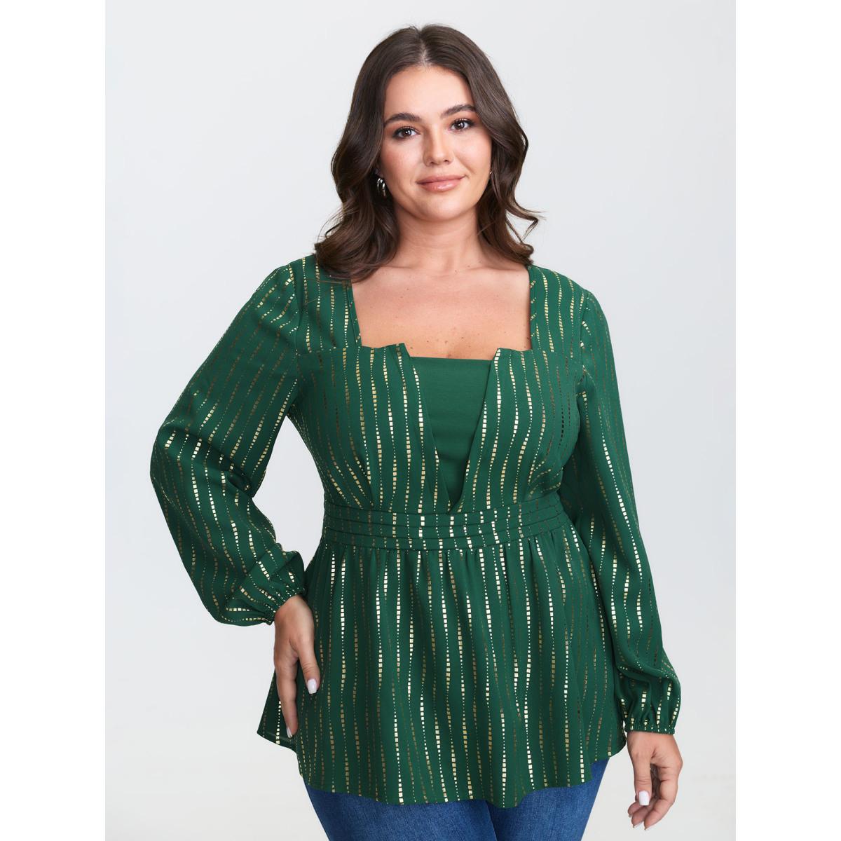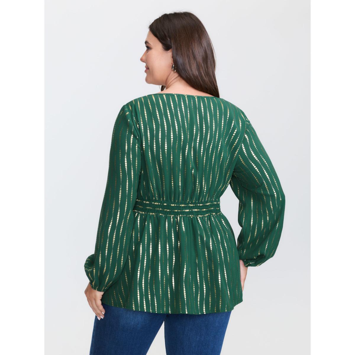 Plus Size DarkGreen Shimmery Sequin Cinched-Waist Blouse Women Party&Cocktail Extra Long Sleeve Flat collar with V-notch Party Blouses BloomChic 18-20/2X