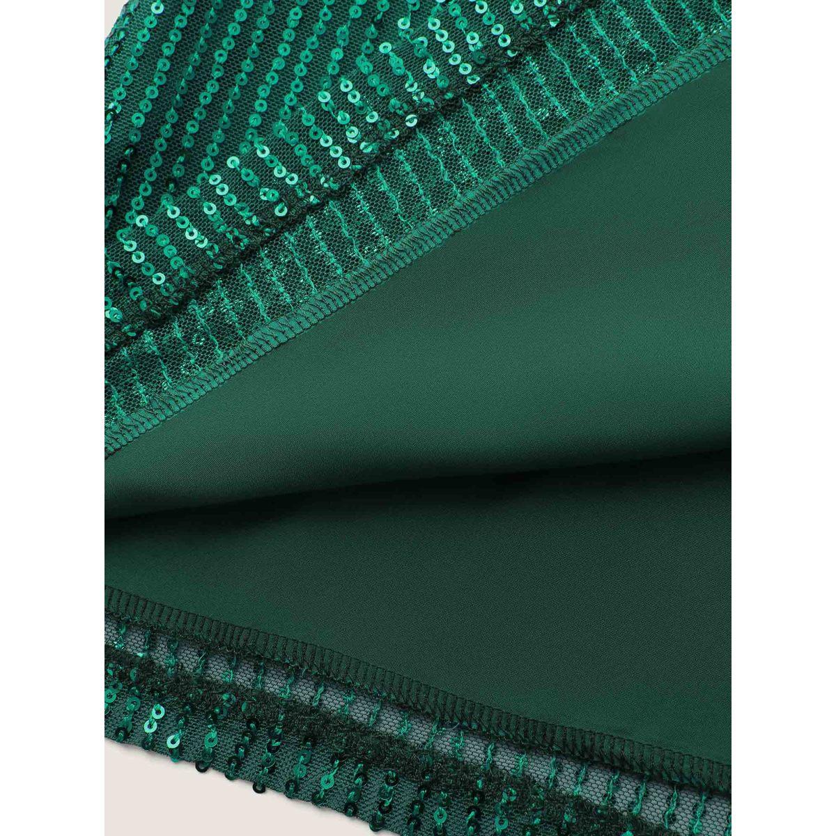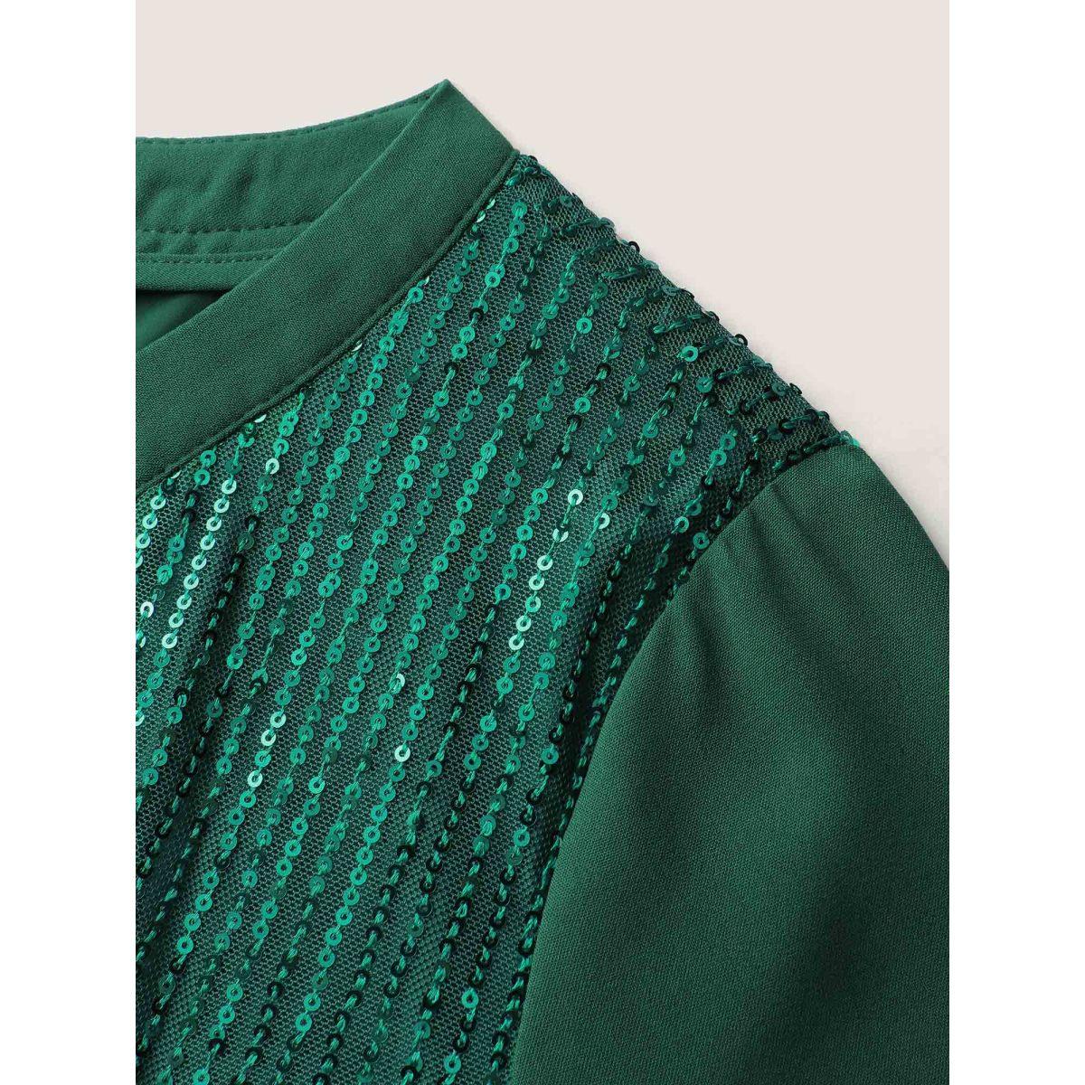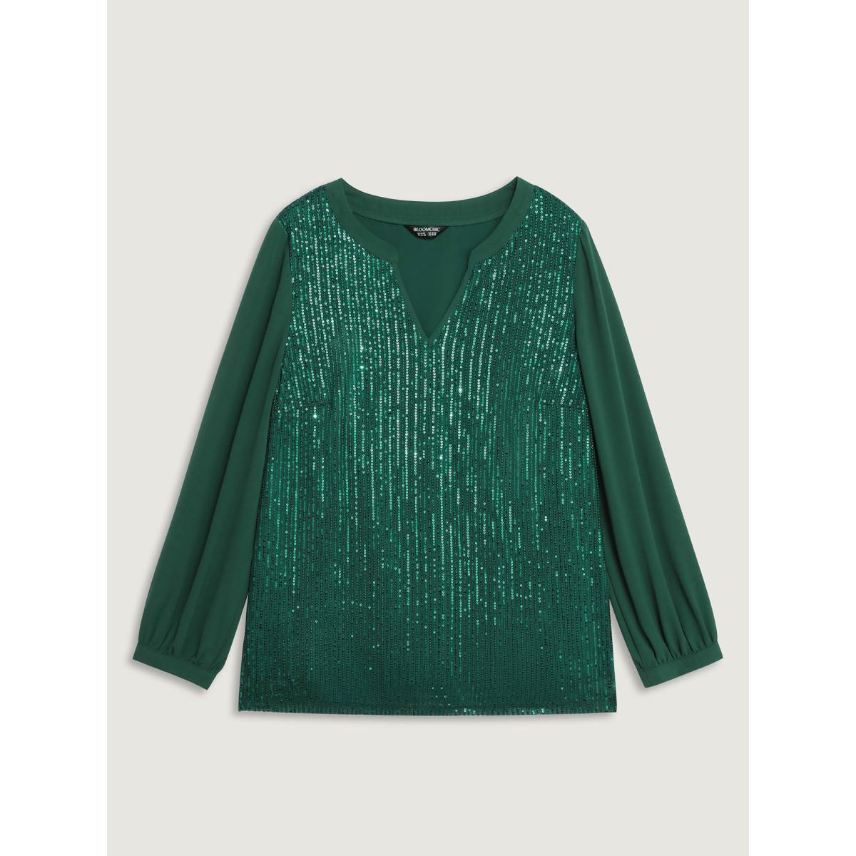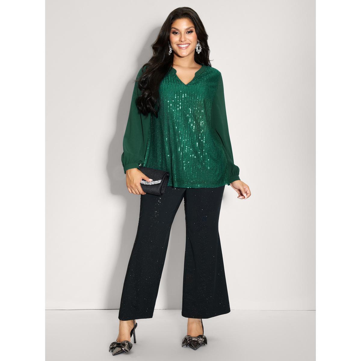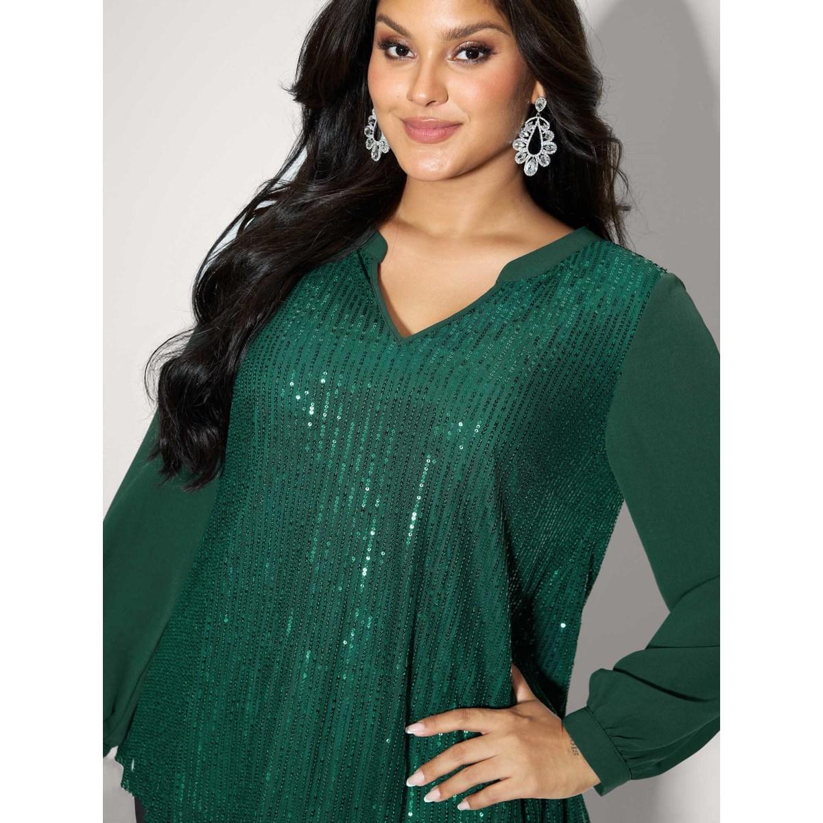 Plus Size DarkGreen Shimmery Sequin Notched Collar Blouse Women Party&Cocktail Extra Long Sleeve Flat collar with V-notch Party Blouses BloomChic 28/5X