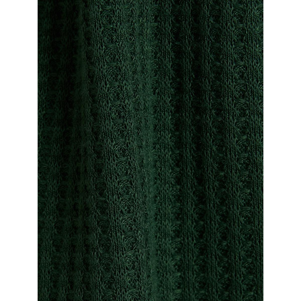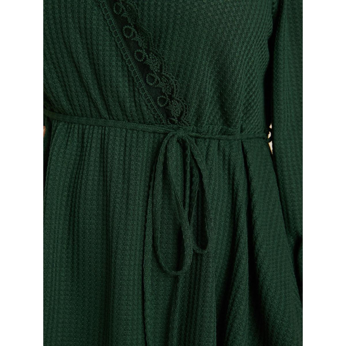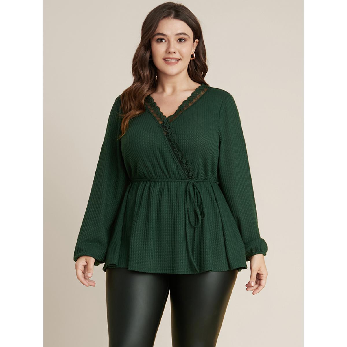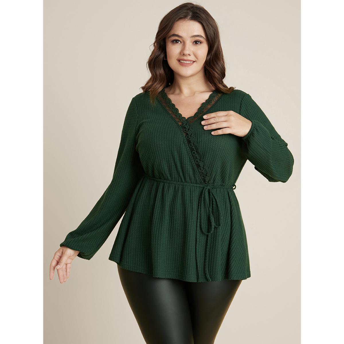 Plus Size DarkGreen Solid Ties Up Wrap Contrast Lace Waffle Knit Blouse Women Elegant Long Sleeve V-neck Dailywear Blouses BloomChic 10/M
