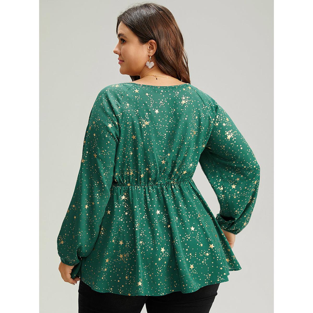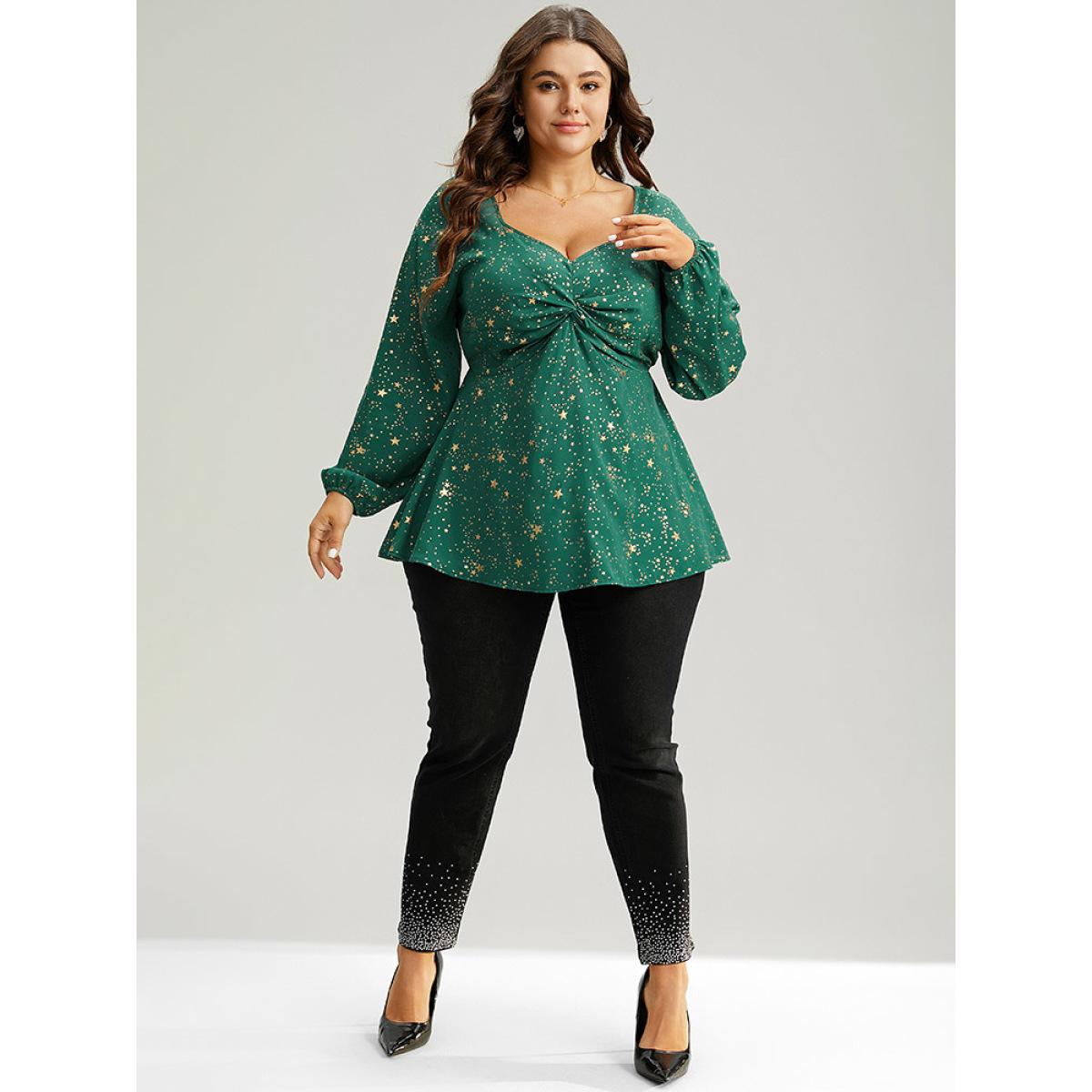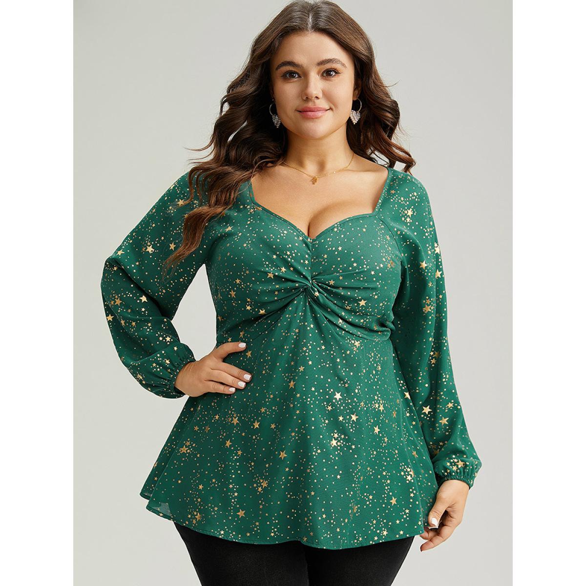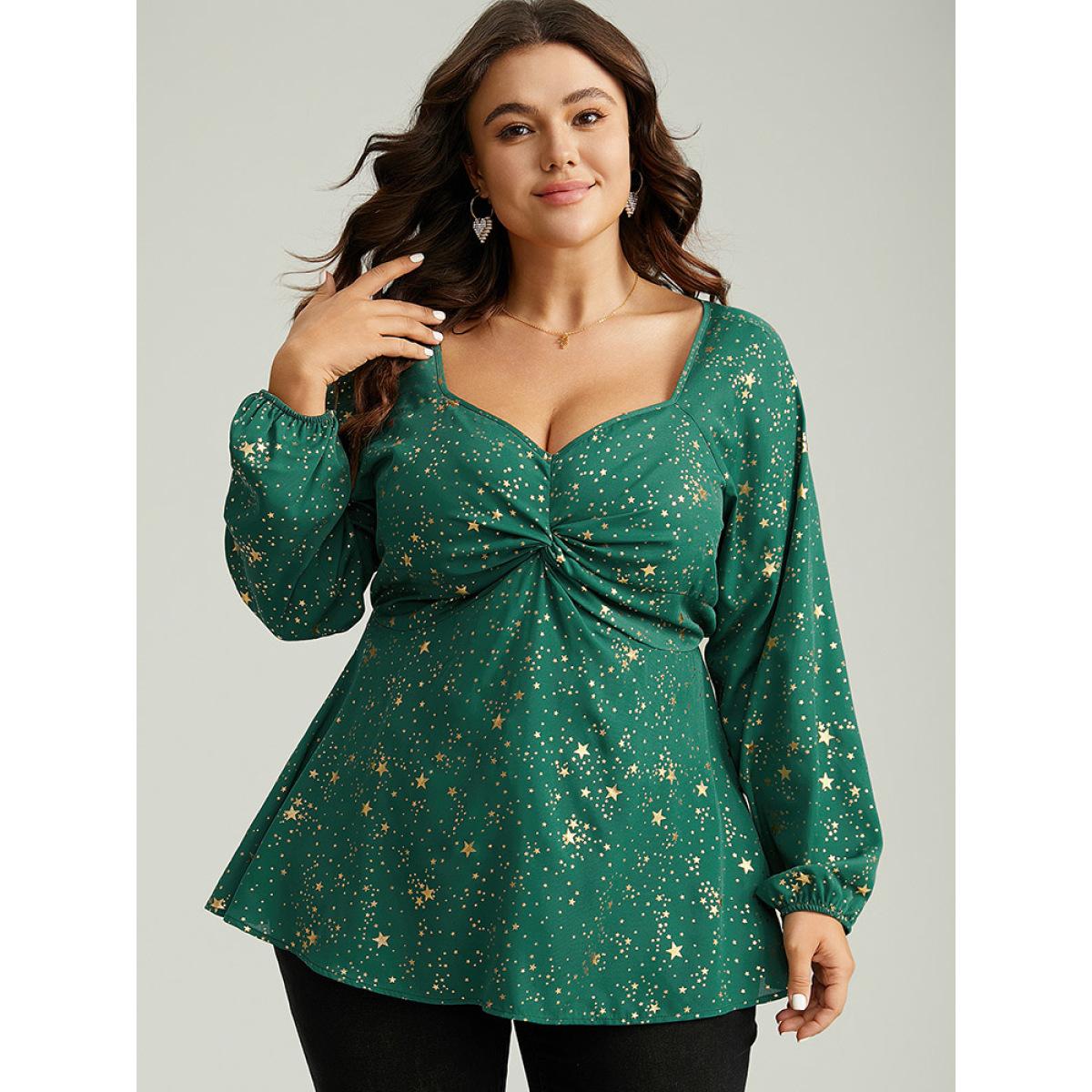 Plus Size DarkGreen Star Glitter Square Neck Twist Front Blouse Women Glamour Long Sleeve Square Neck Festival-Christmas Blouses BloomChic 14-16/1X