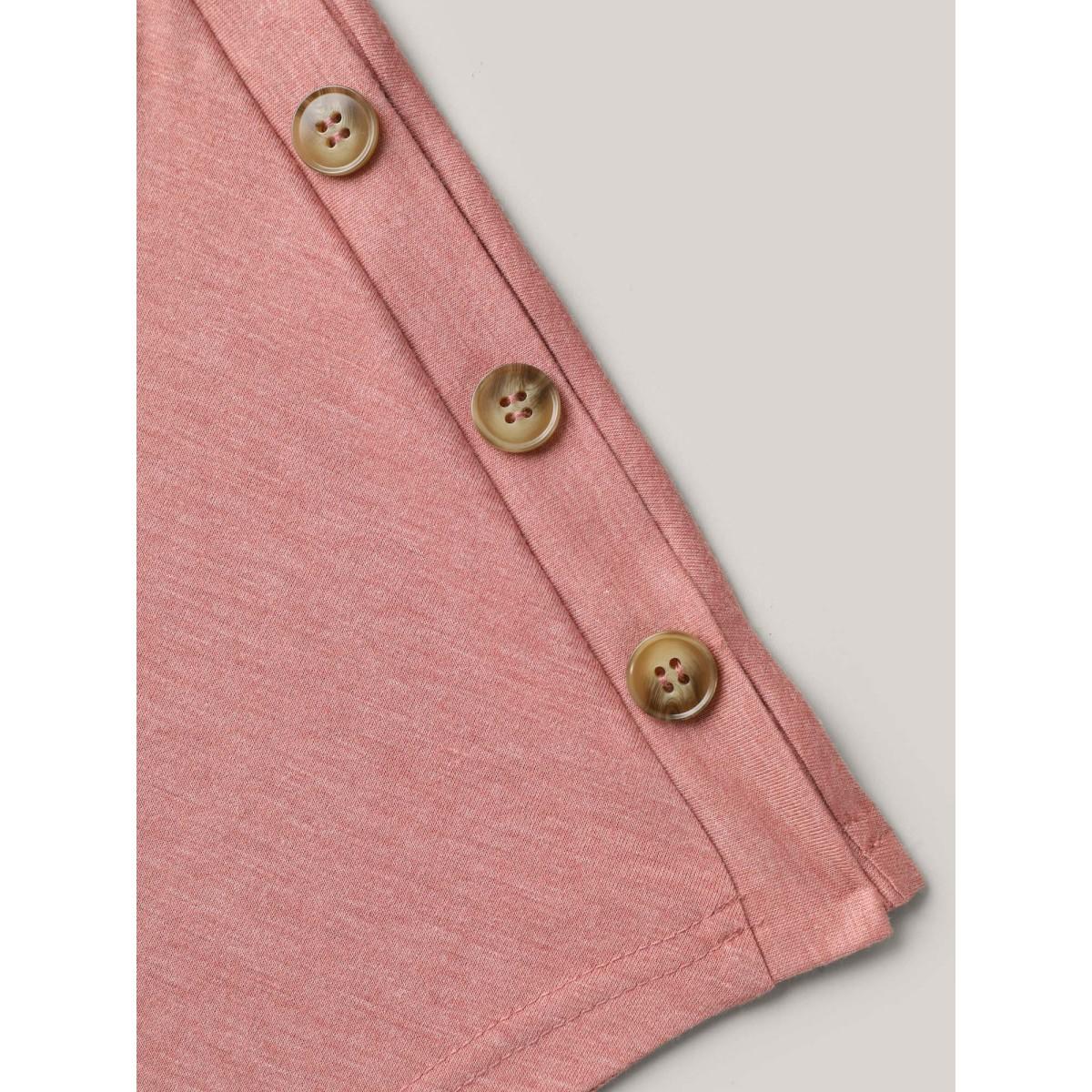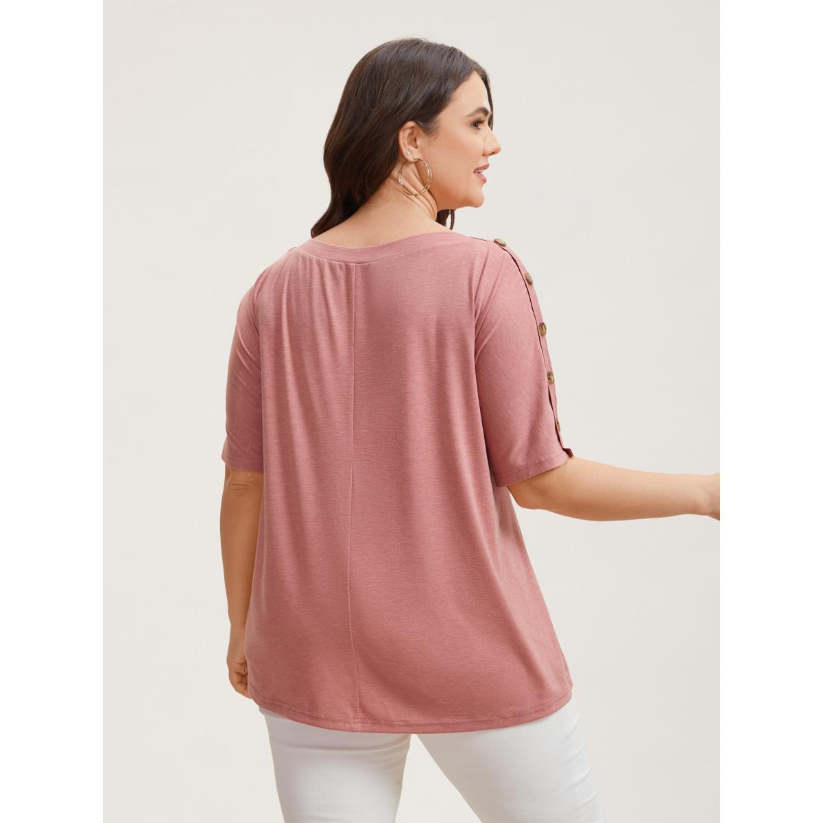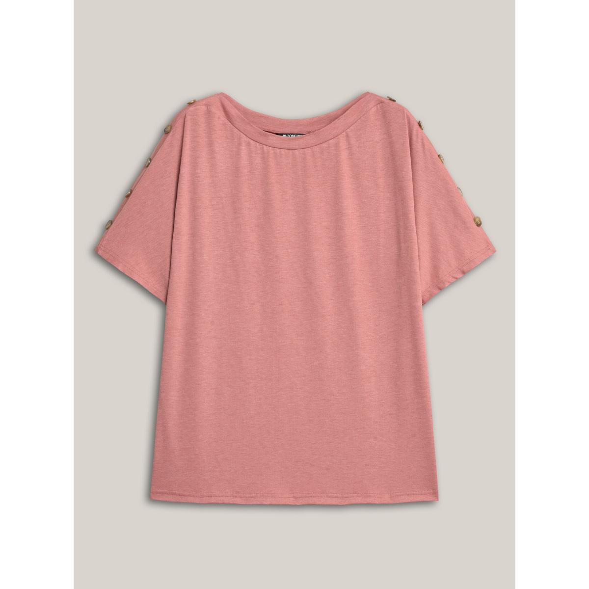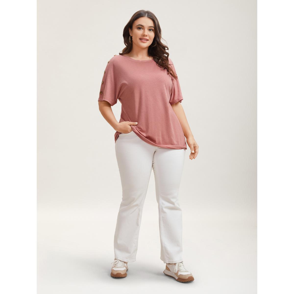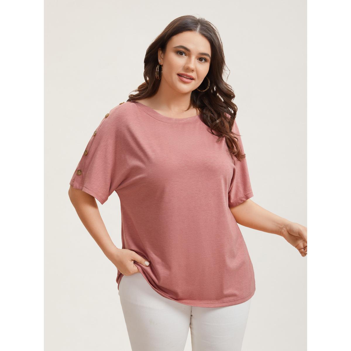 Plus Size Decorative Buttons Half-Sleeve Plain T-Shirt Rouge Women Leisure Button Plain Boat Neck Casual T-shirts BloomChic 30/6X
