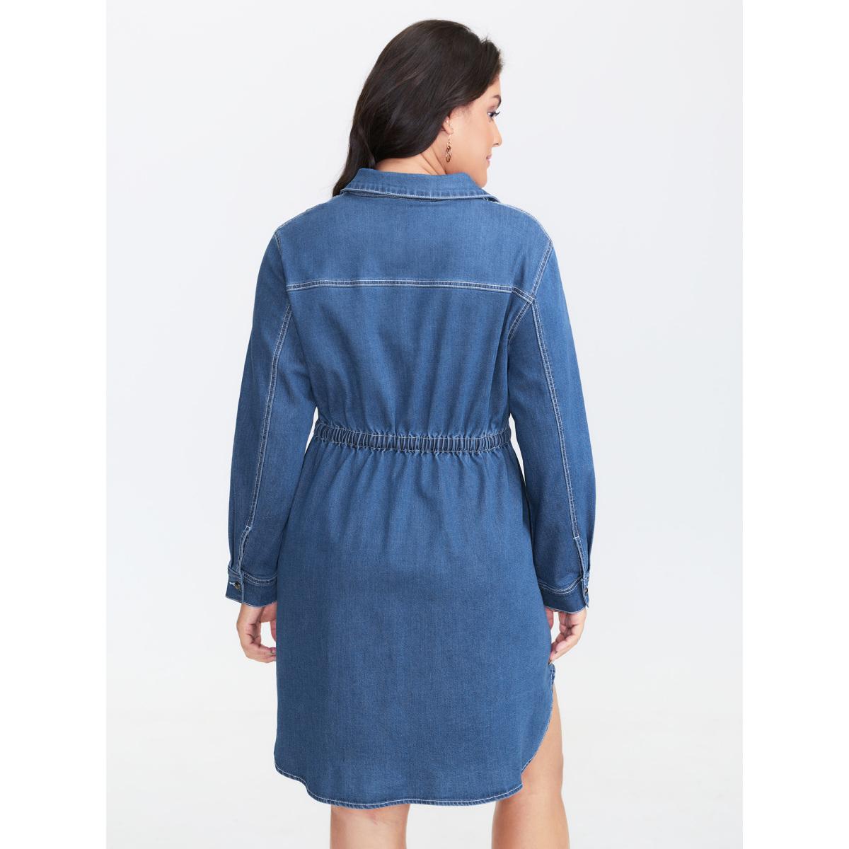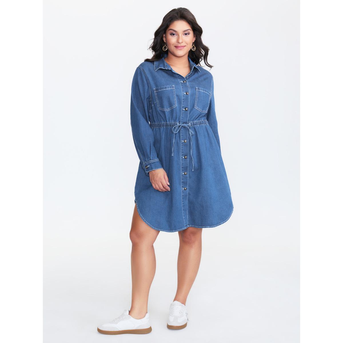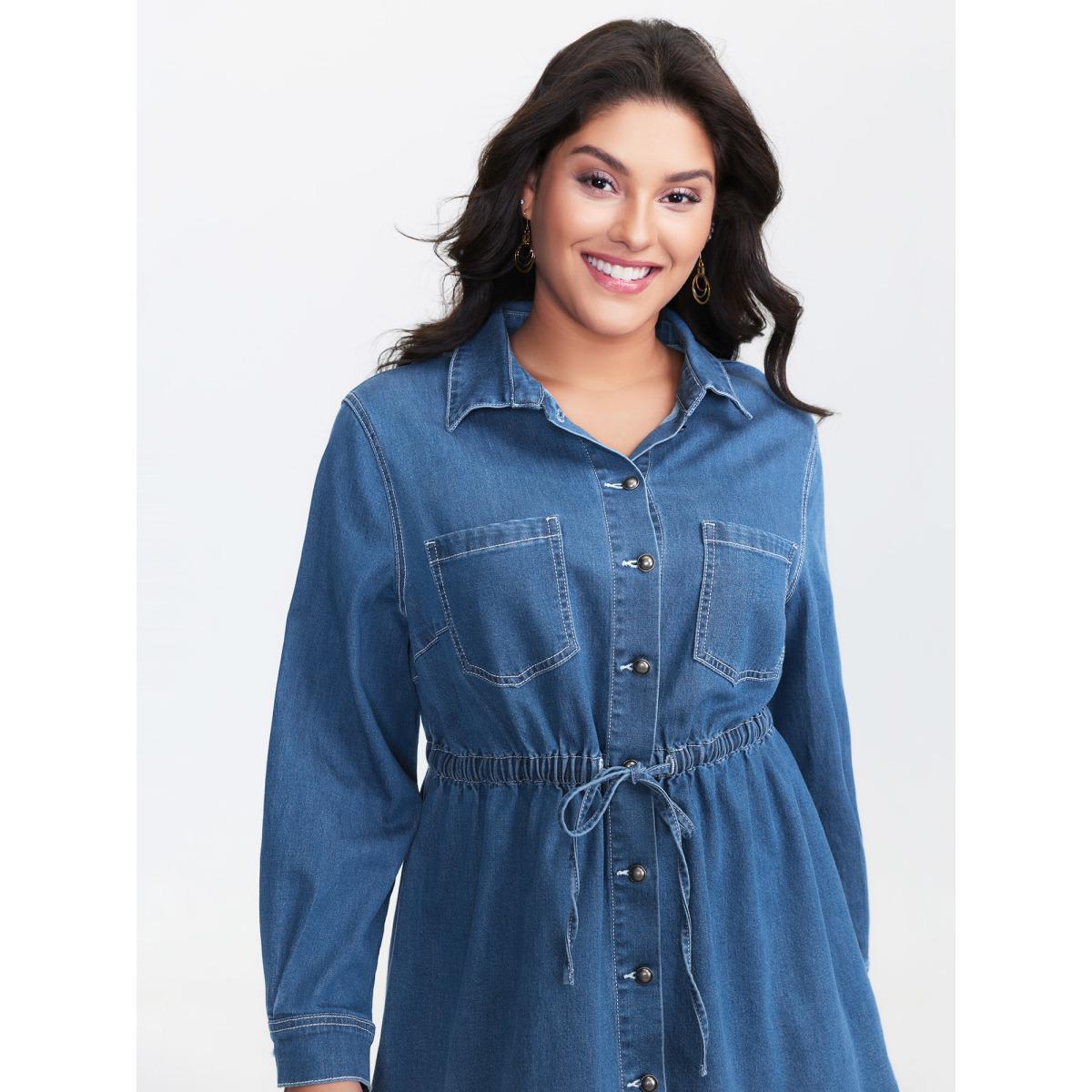 Plus Size Denim Waist-Defining Shirt Dress Midblue Women Drawstring Casual Patch pocket Belt Leisure Denim Dresses BloomChic 30/6X