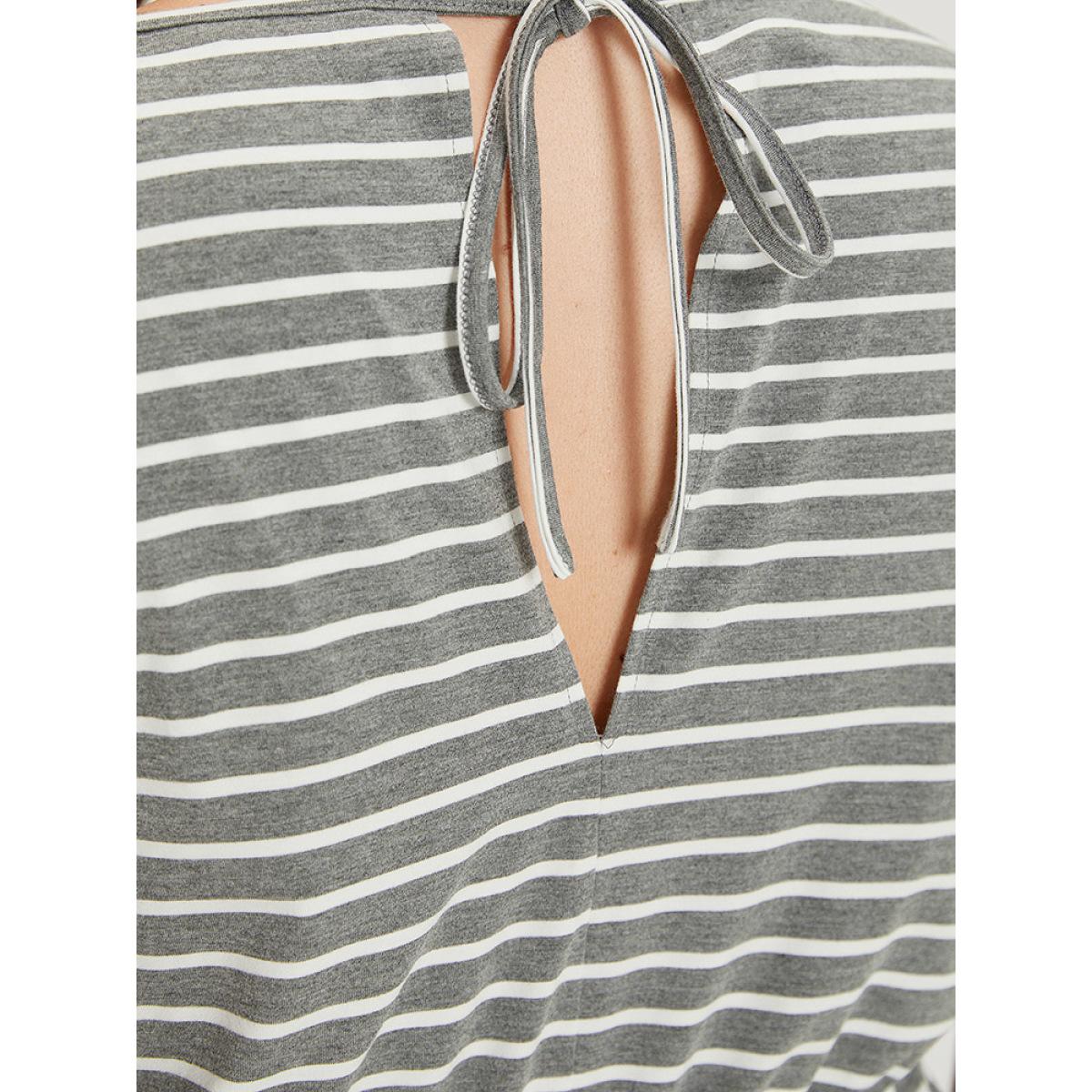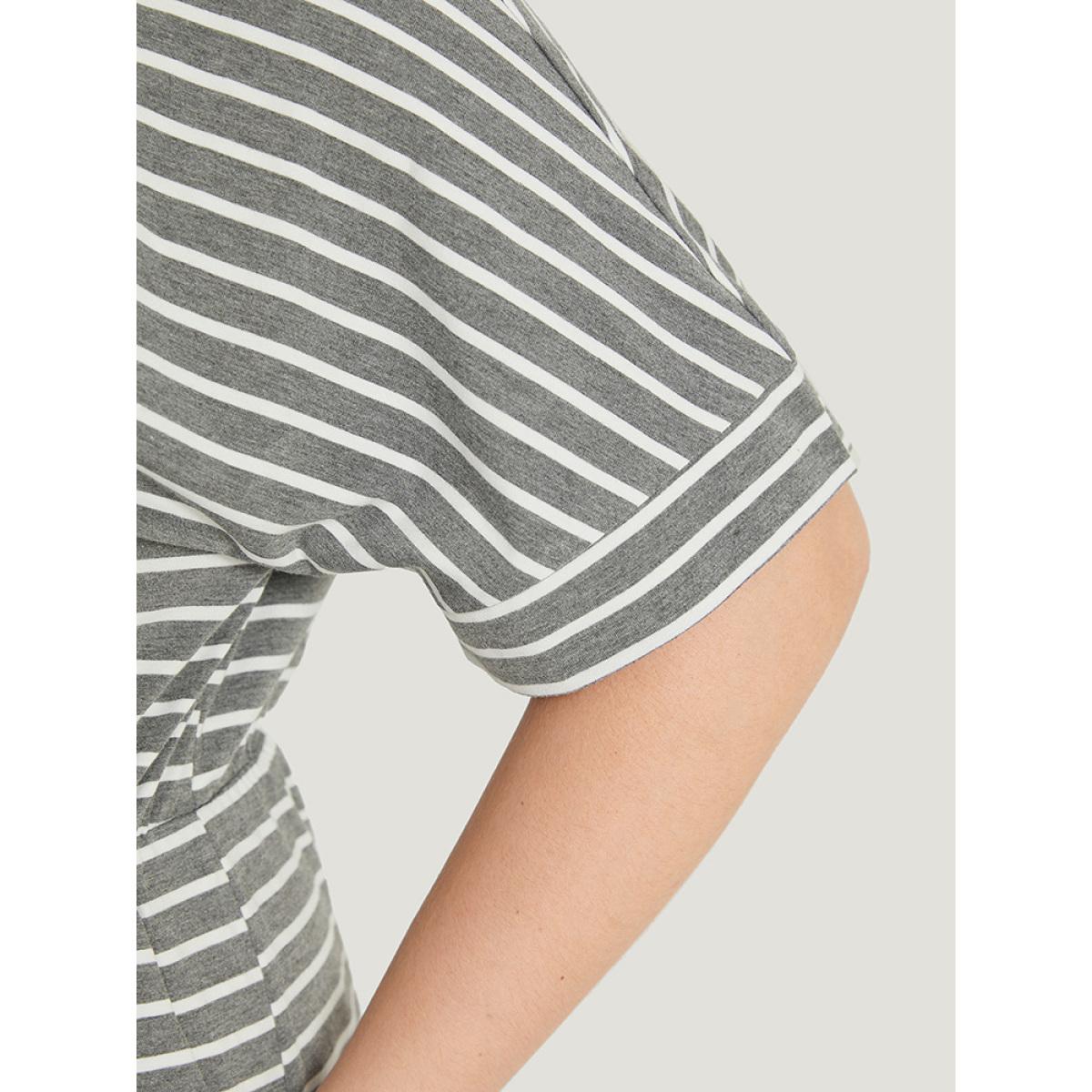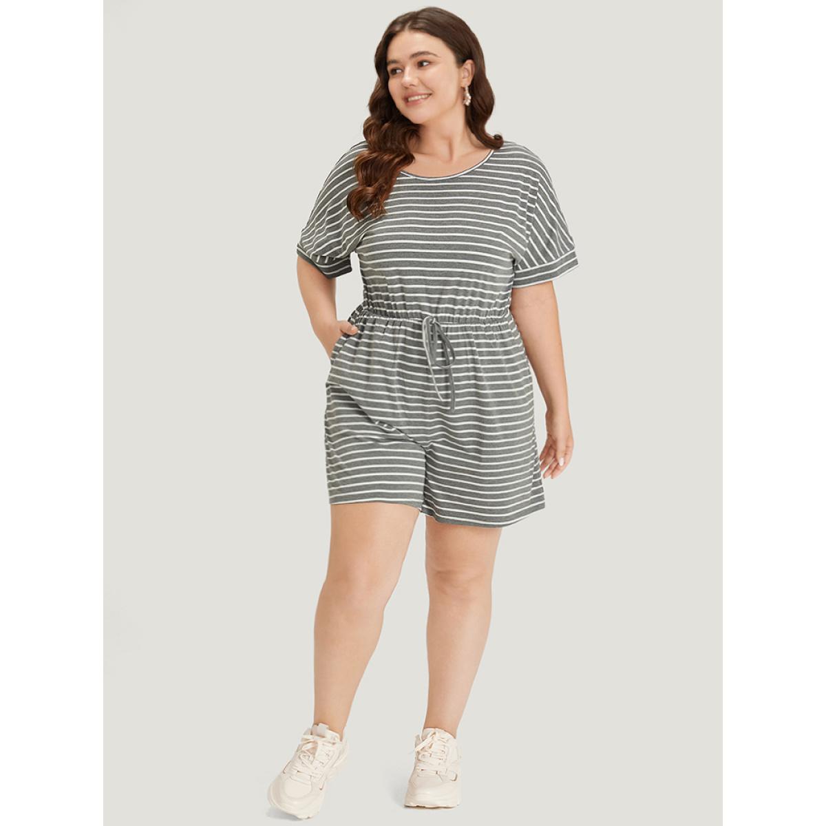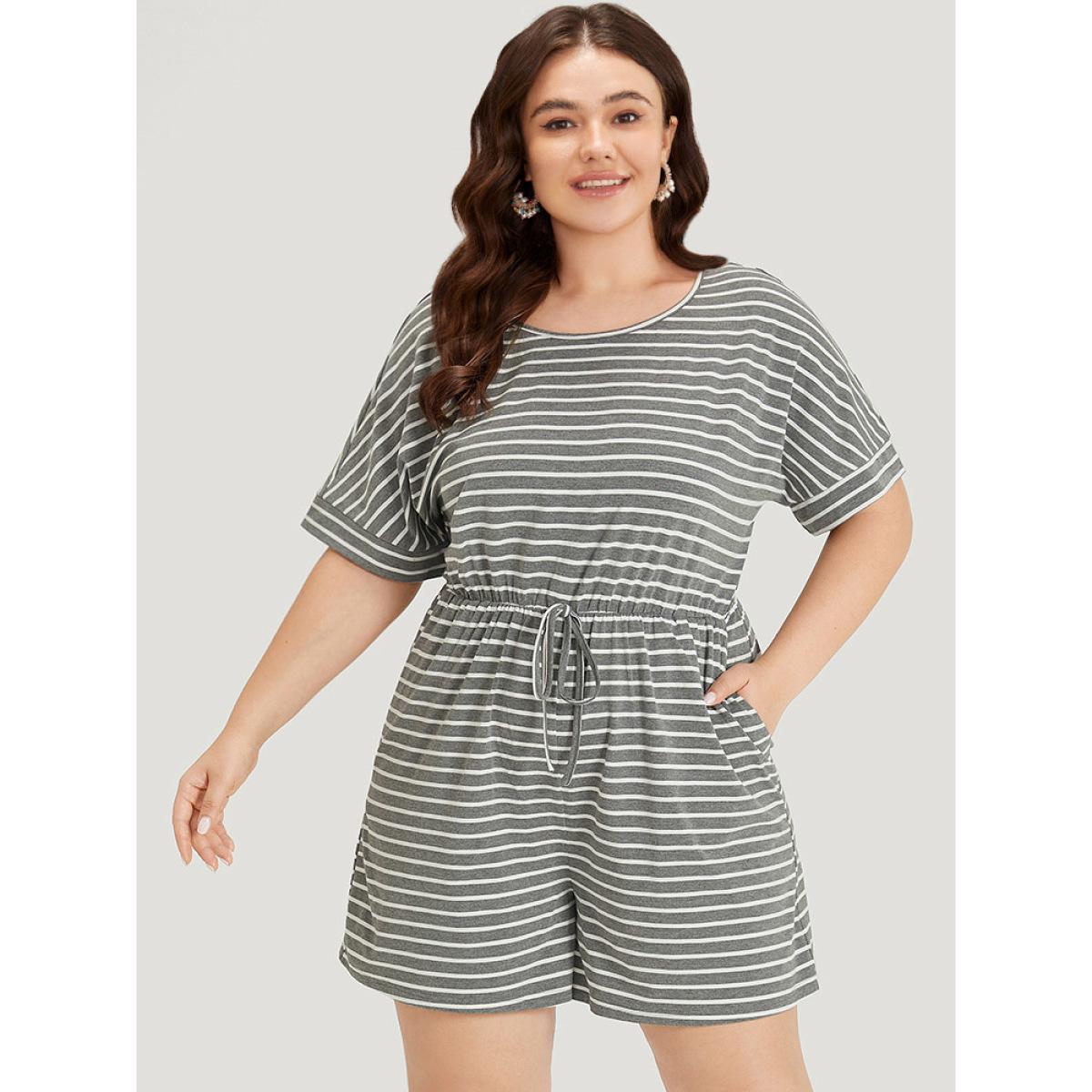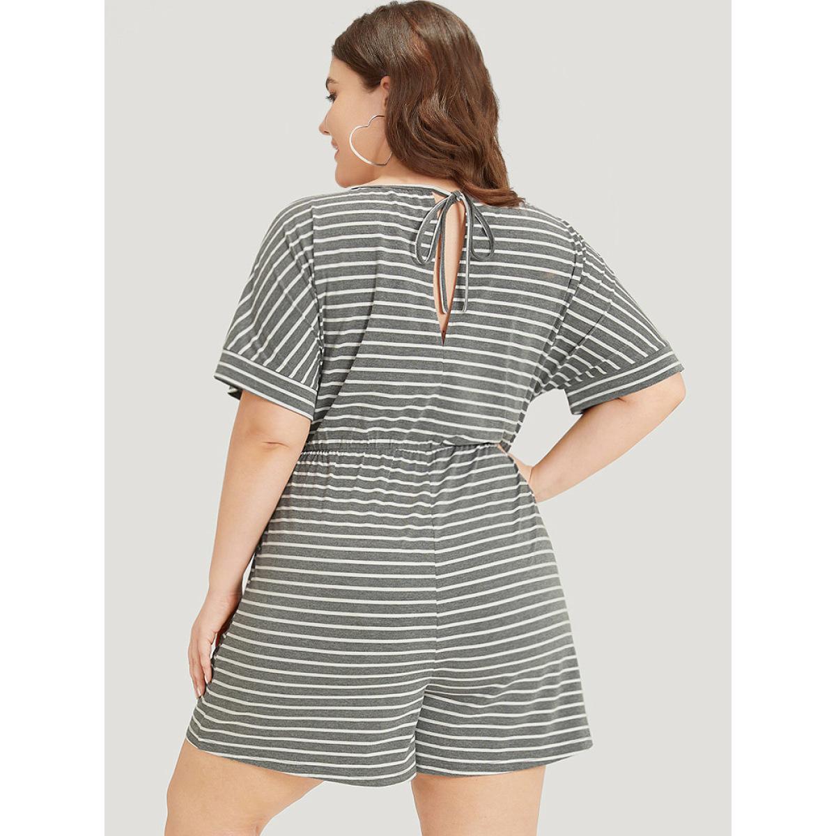 Plus Size DimGray Striped Print Pocket Ties Elastic Waist Jumpsuit Women Casual Short sleeve Round Neck Dailywear Loose Jumpsuits BloomChic 22-24/3X