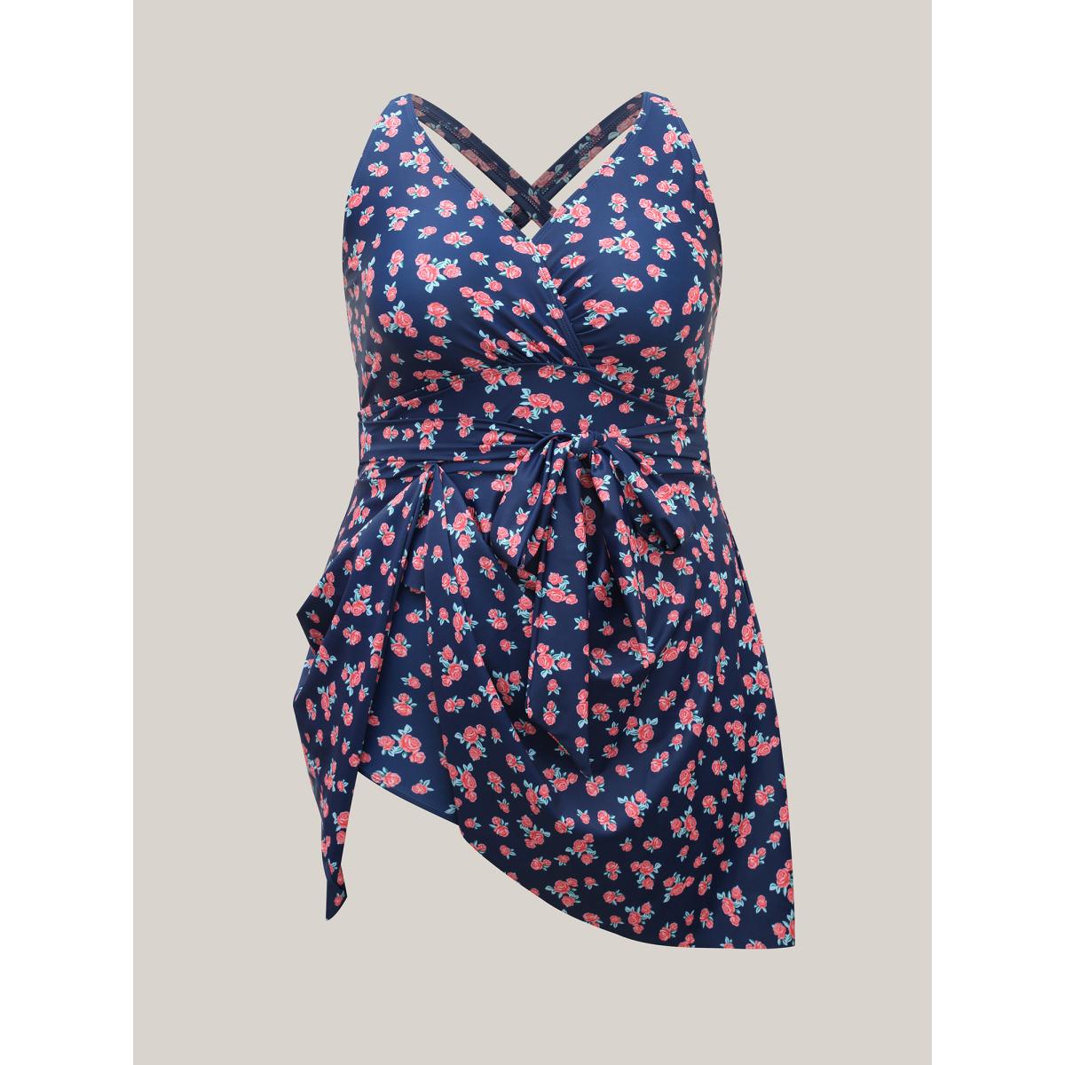 Plus Size Ditsy Floral Belted Swim Dress Women's Swimwear Indigo Resort Bodycon Overlap Collar High stretch Curve Swim Dresses BloomChic 30/6X