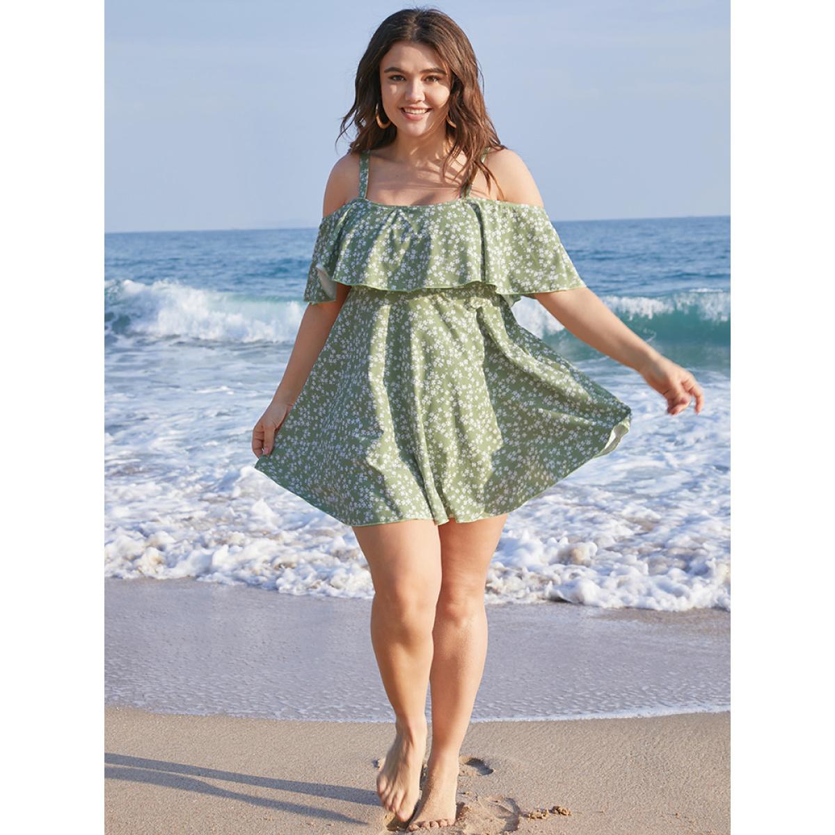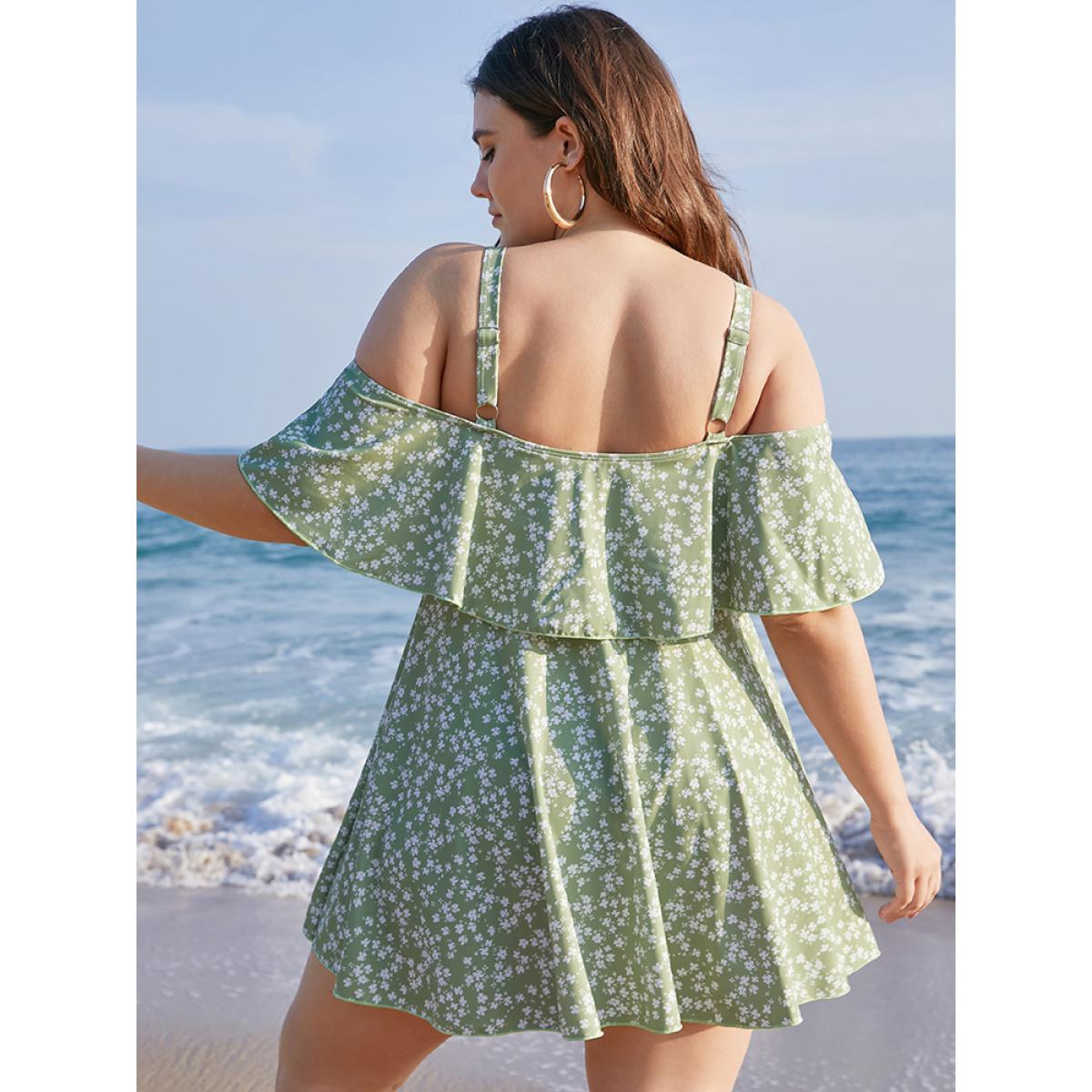 Plus Size Ditsy Floral Cold Shoulder Sculpt Waist Ruffles Swim Dress Women's Swimwear Mint Beach Bodycon One-shoulder neck High stretch Curve Swim Dresses BloomChic 28/5X