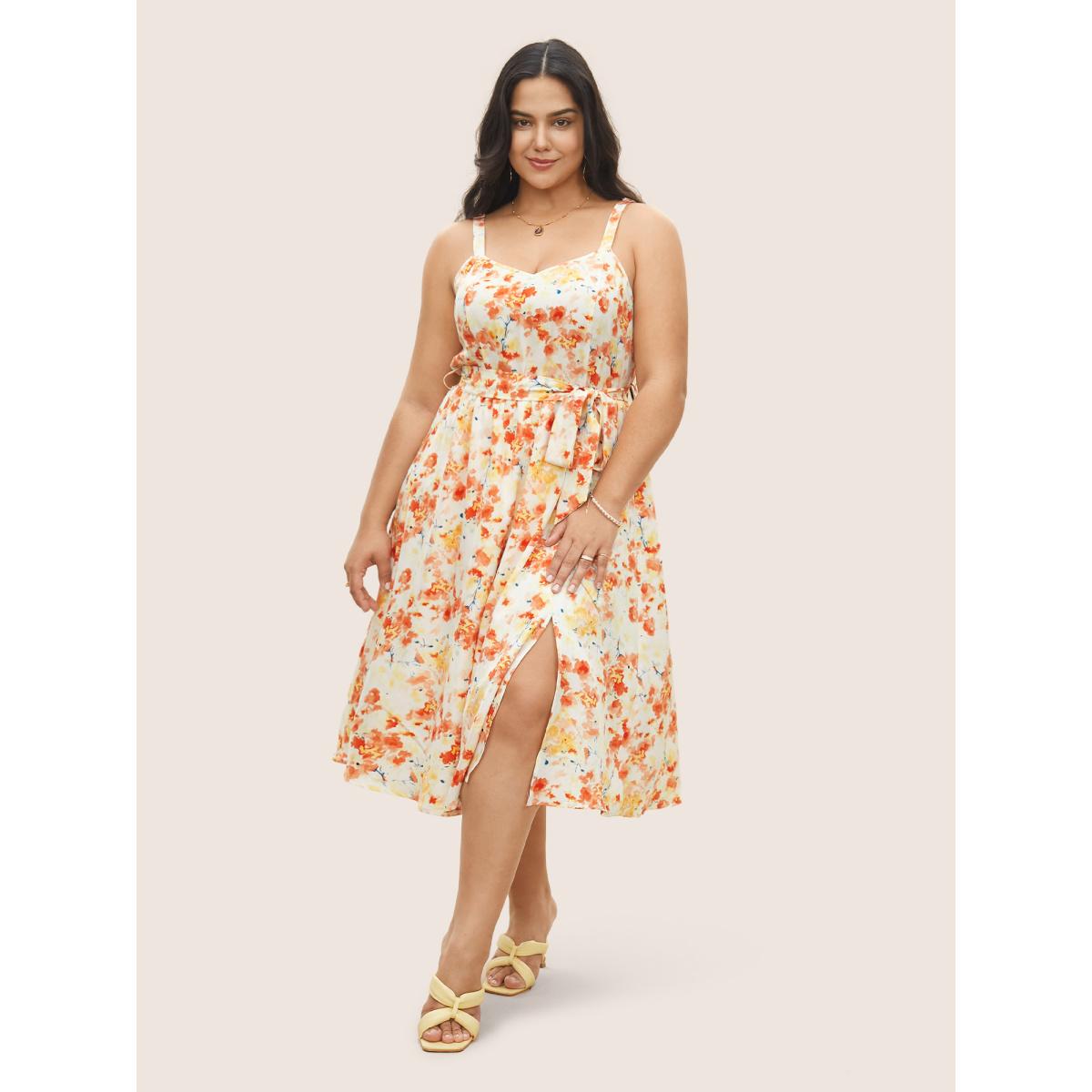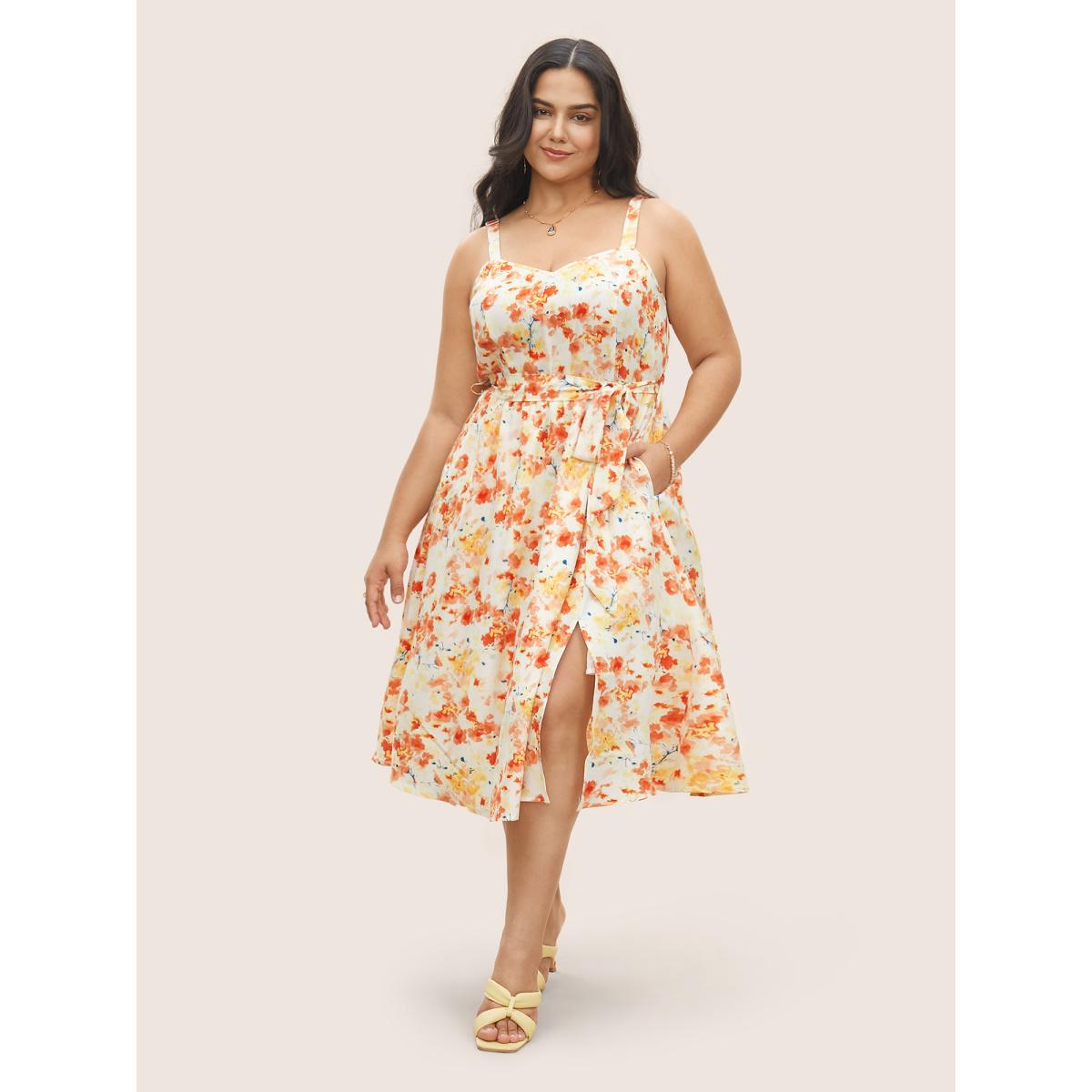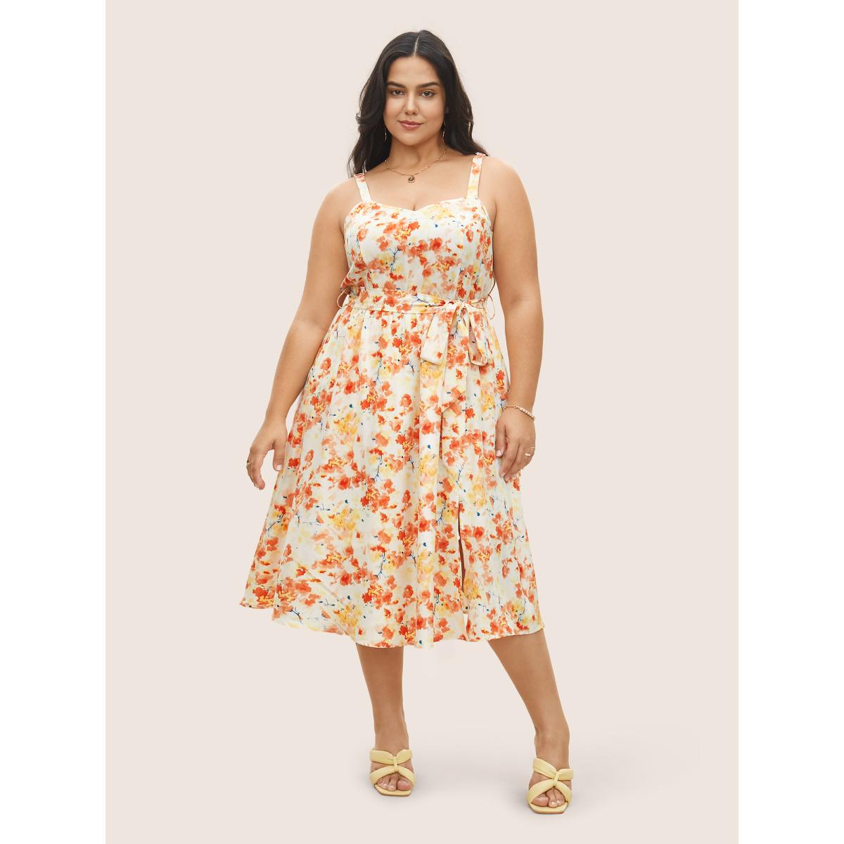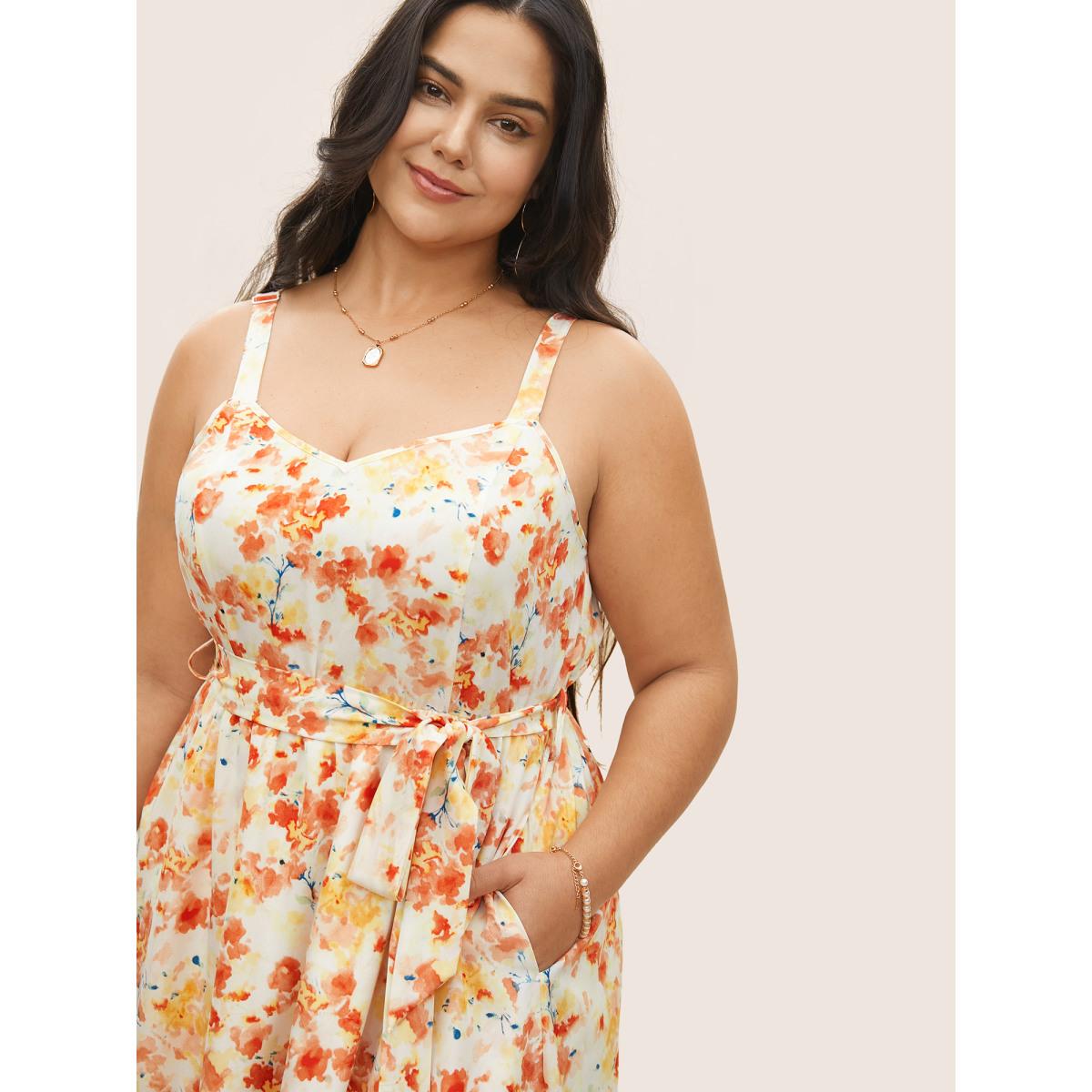 Plus Size Ditsy Floral Elastic Waist Belted Adjustable Straps Dress Coral Women Elegant Non Non Sleeveless Curvy Midi Dress BloomChic 14-16/1X