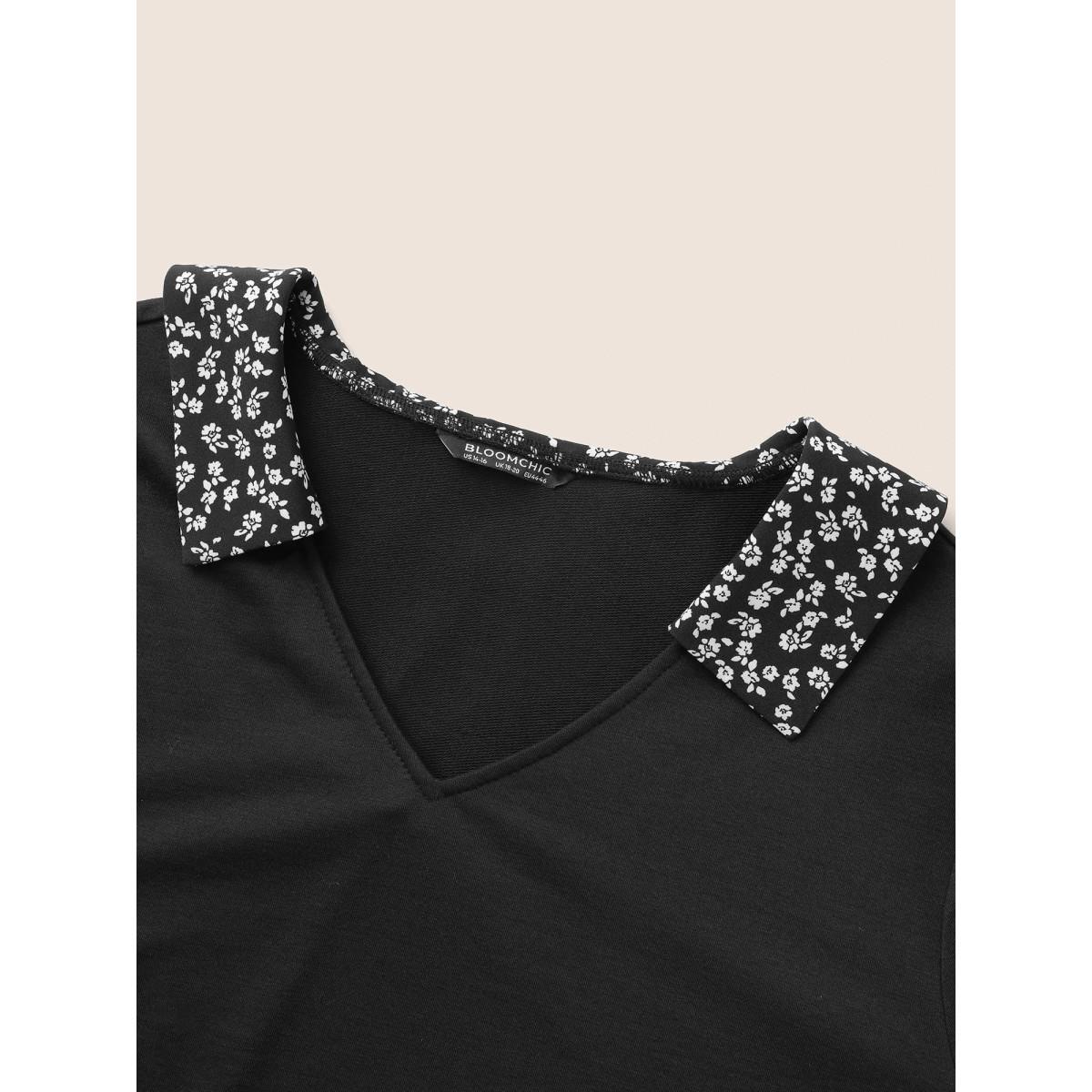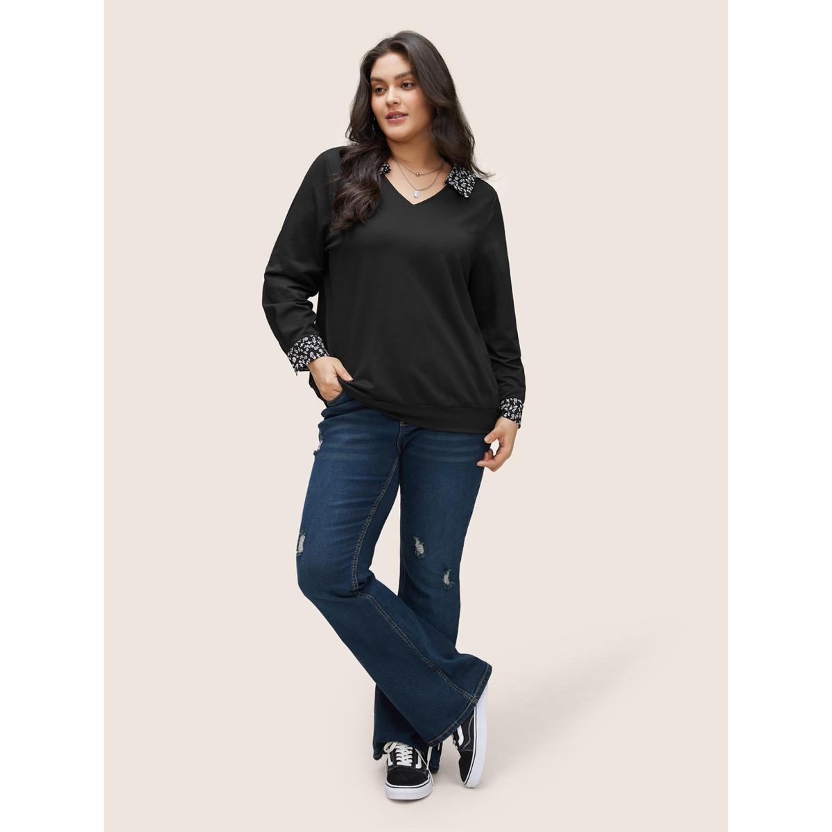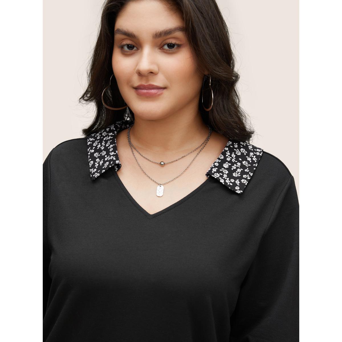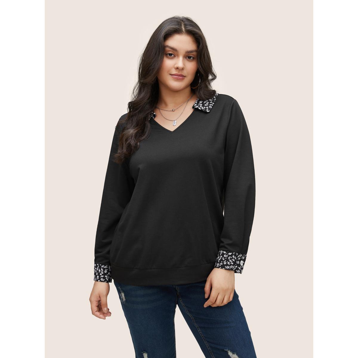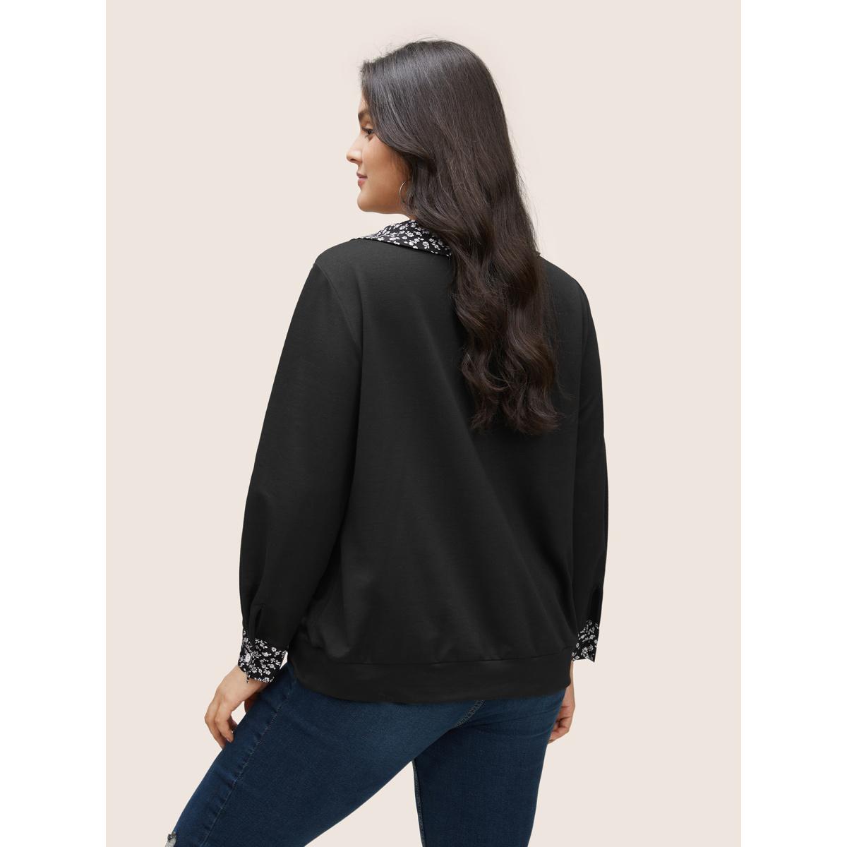 Plus Size Ditsy Floral Patchwork Shirt Collar Sweatshirt Women Black Casual Patchwork Shirt collar Everyday Sweatshirts BloomChic 26/4X