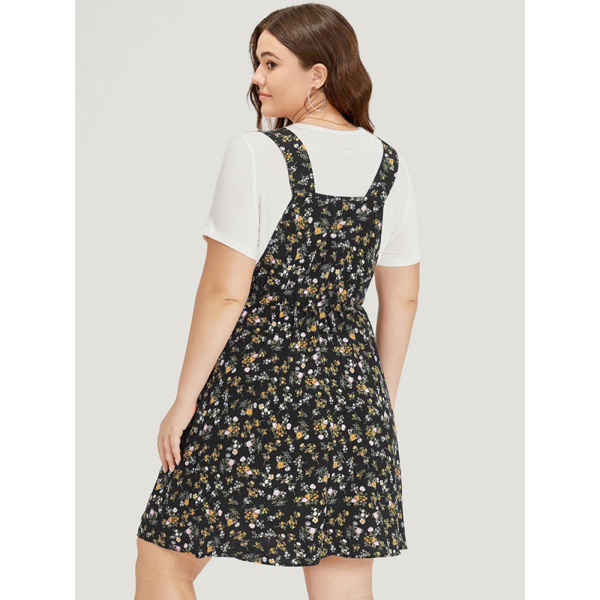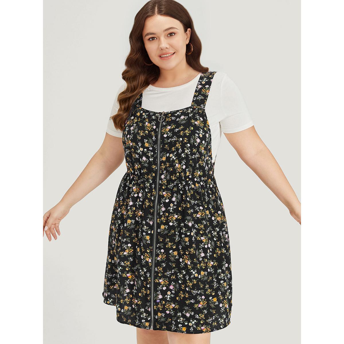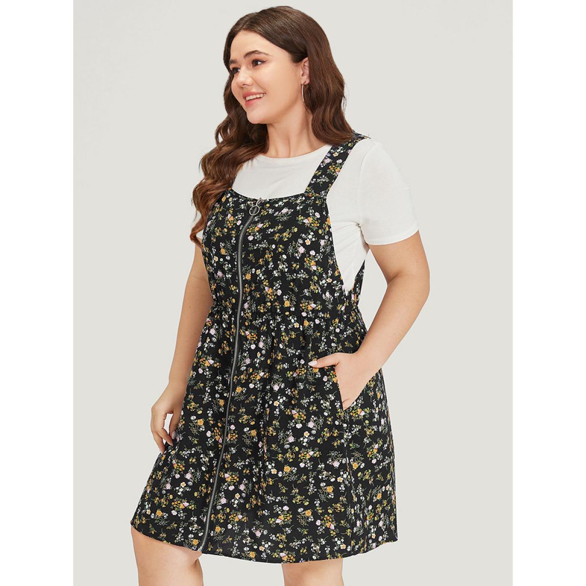 Plus Size Ditsy Floral Pocket Zipper Overall Cami Dress Black Women Casual Zipper Spaghetti Strap Sleeveless Curvy Knee Dress BloomChic 12/L