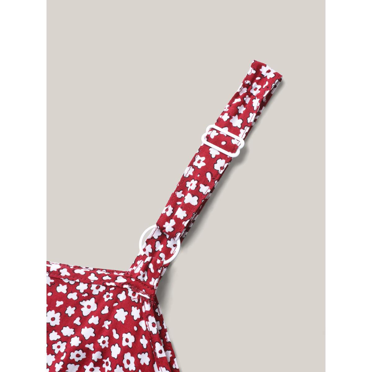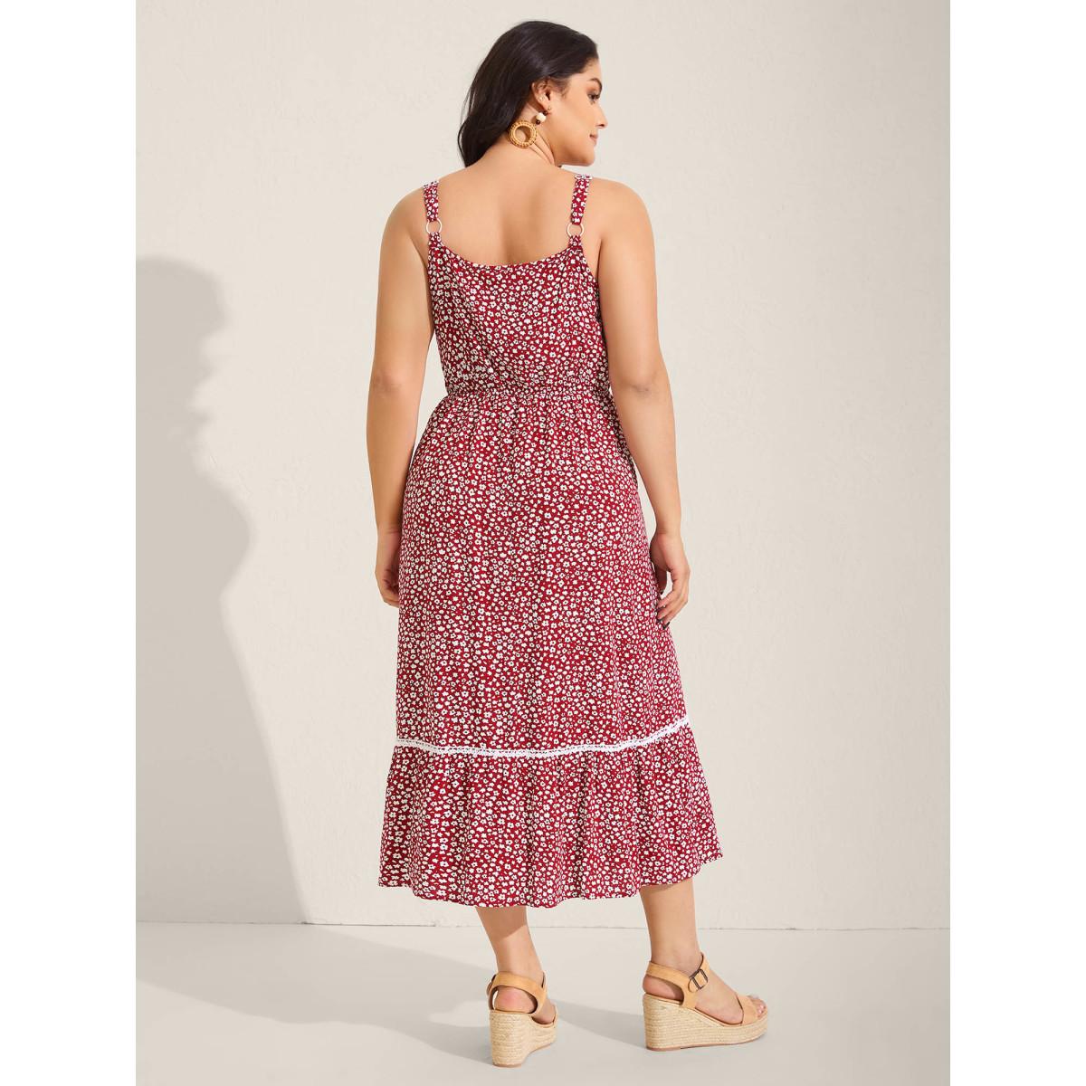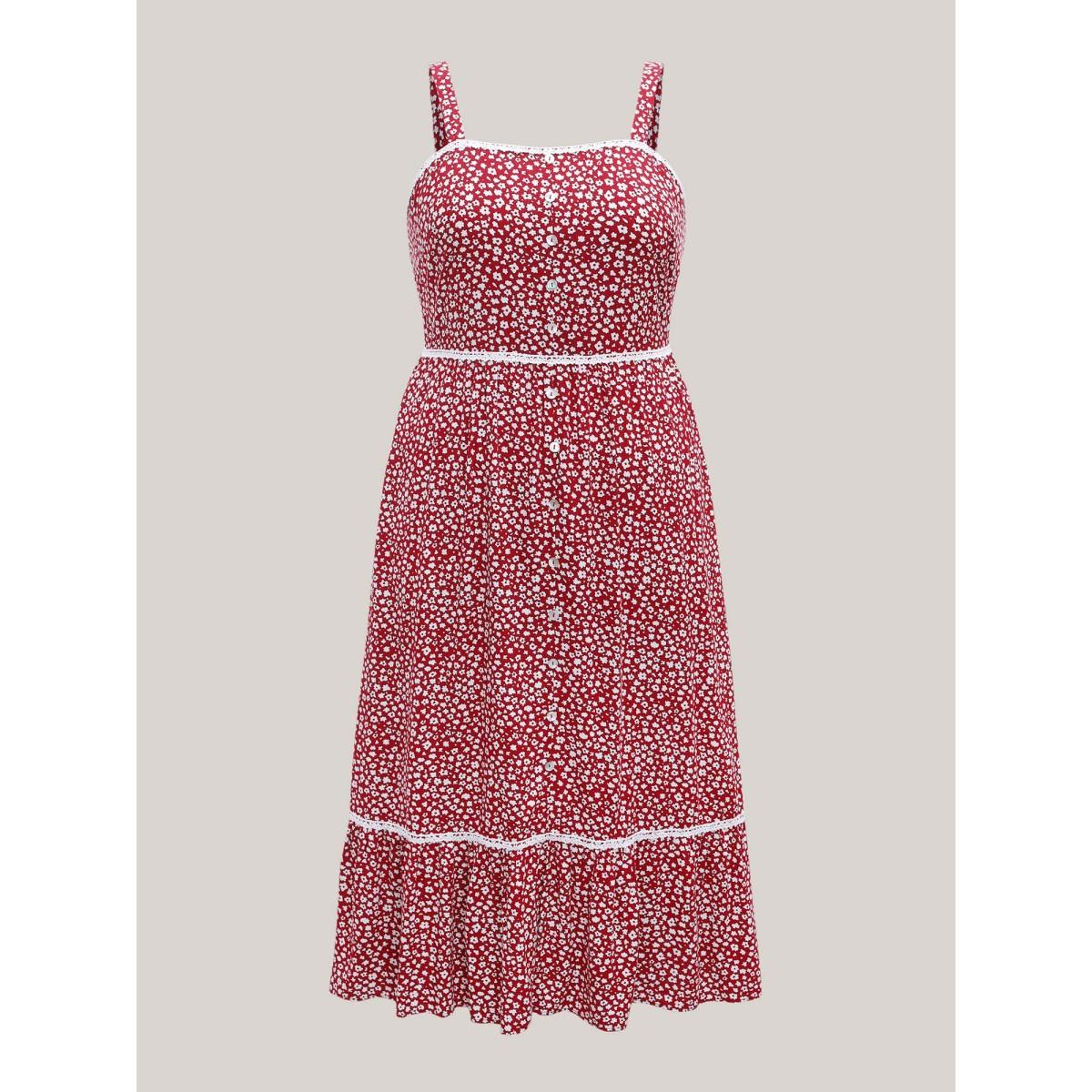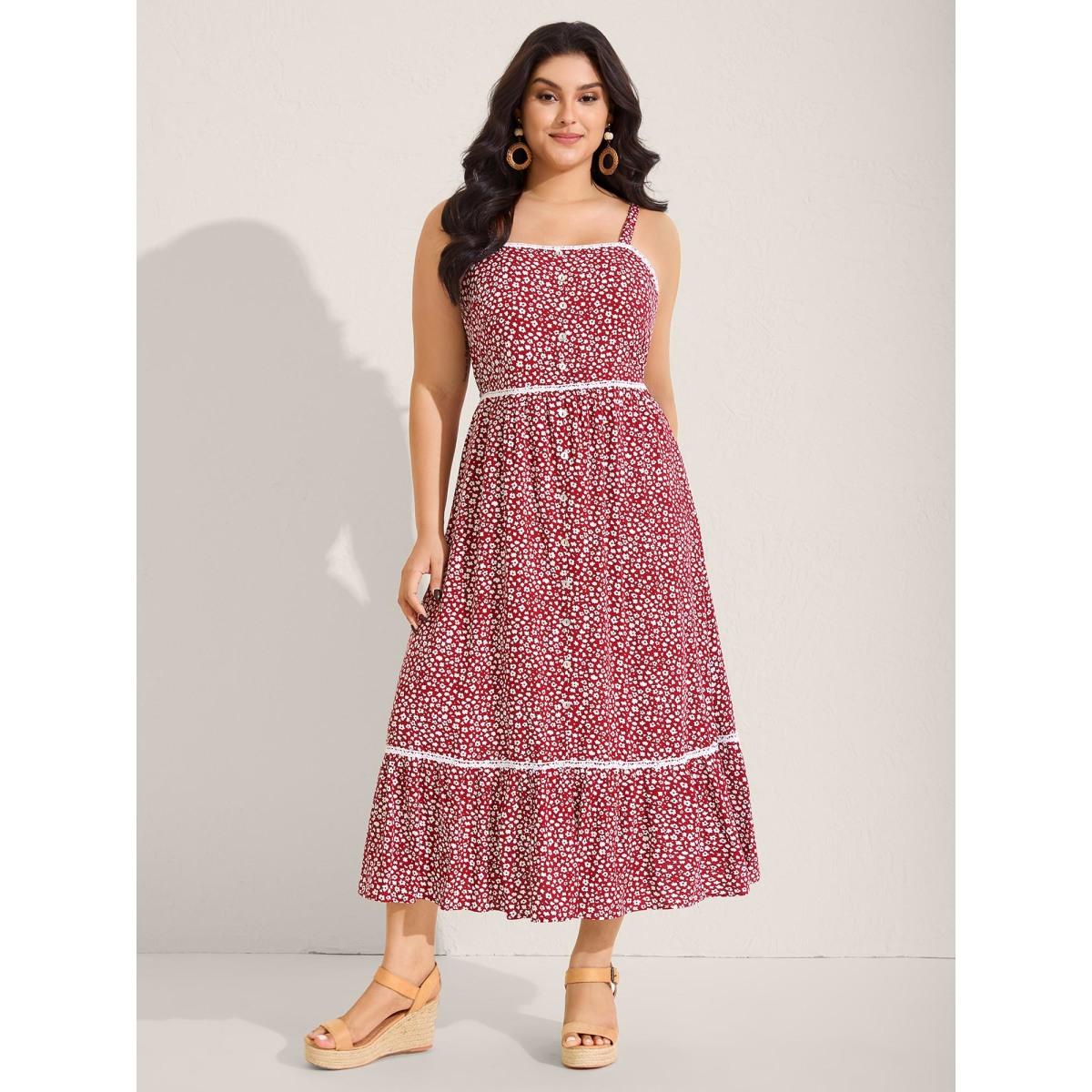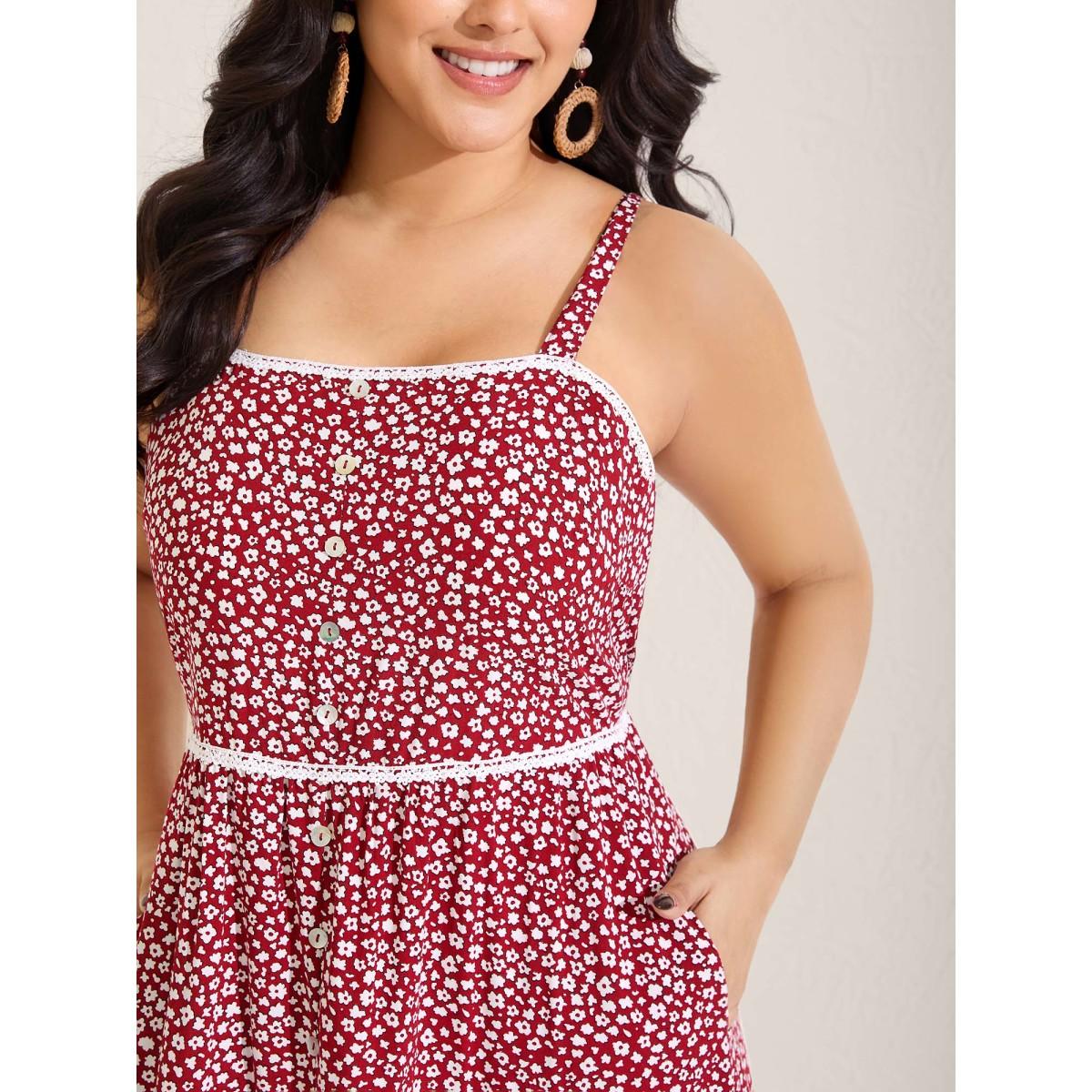 Plus Size Ditsy Floral Print Lace Trim Cami Dress Burgundy Women Square Neck Sleeveless Curvy BloomChic 12/L