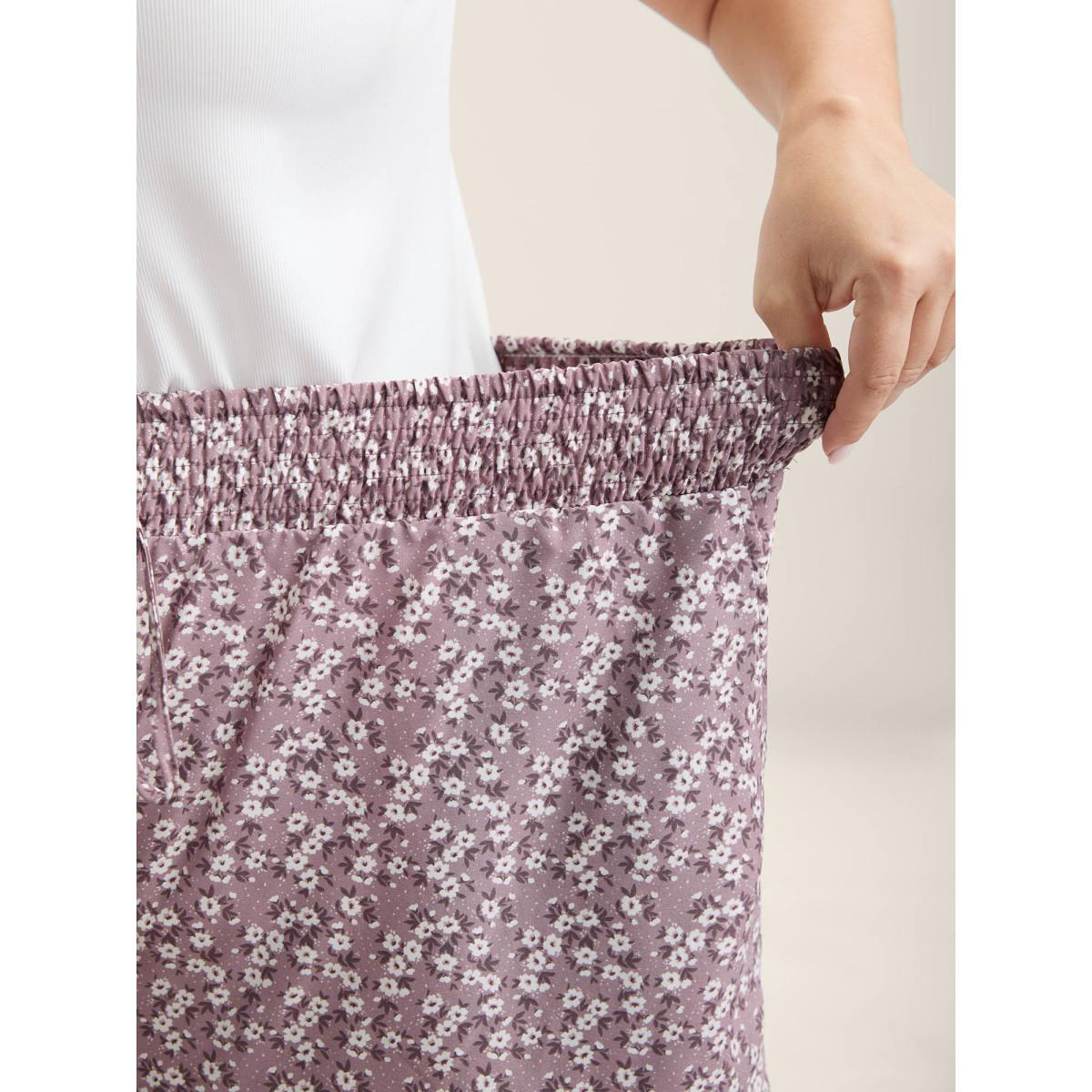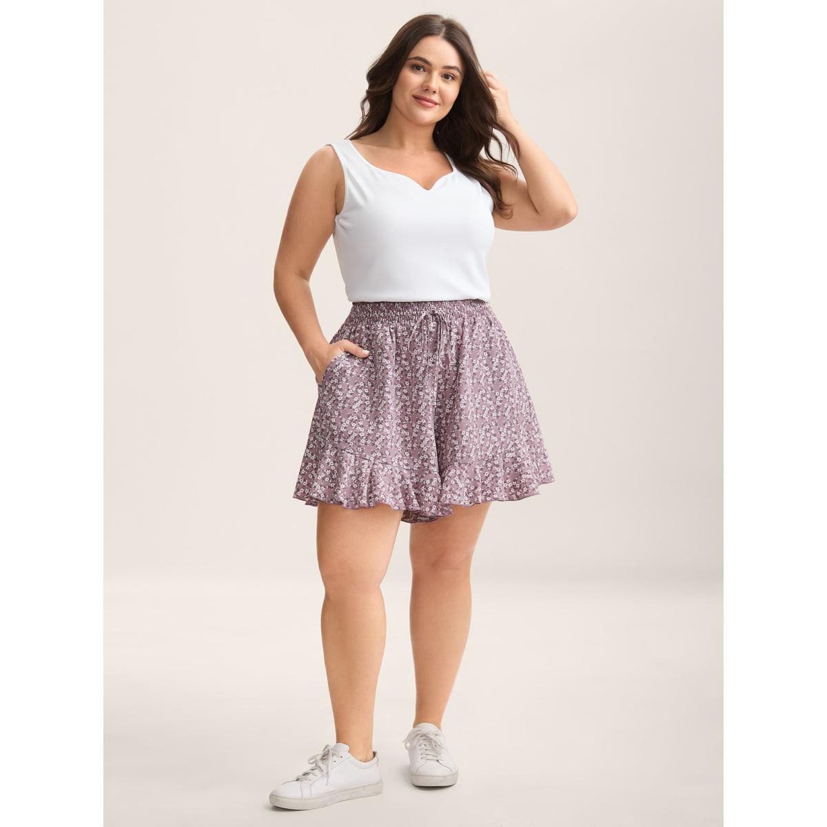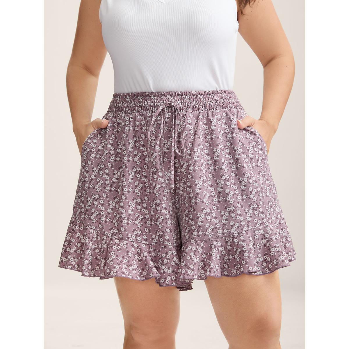 Plus Size Ditsy Floral Pocket Shirred Waist Shorts Women BlackFlower Elegant Shirred Dailywear Shorts BloomChic 14-16/1X