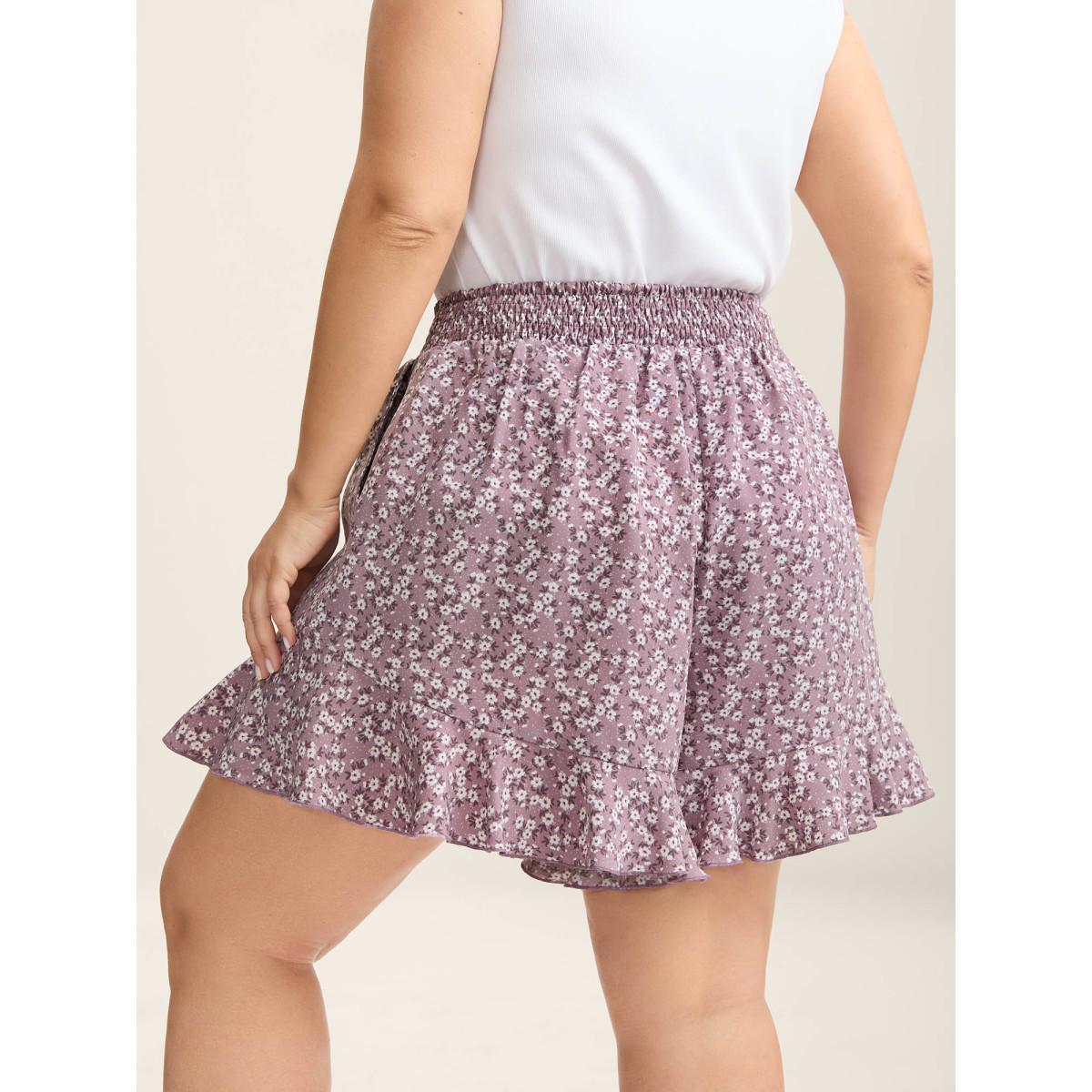 Plus Size Ditsy Floral Pocket Elastic Waist Ruffled Hem Shorts Women BlackFlower Elegant Elastic Waist Dailywear Shorts BloomChic 14-16/1X