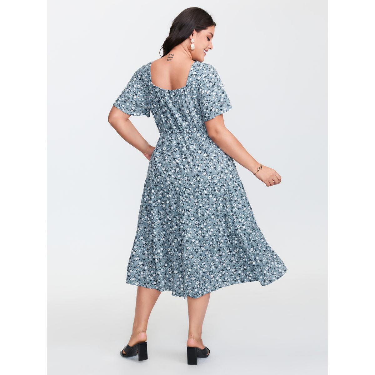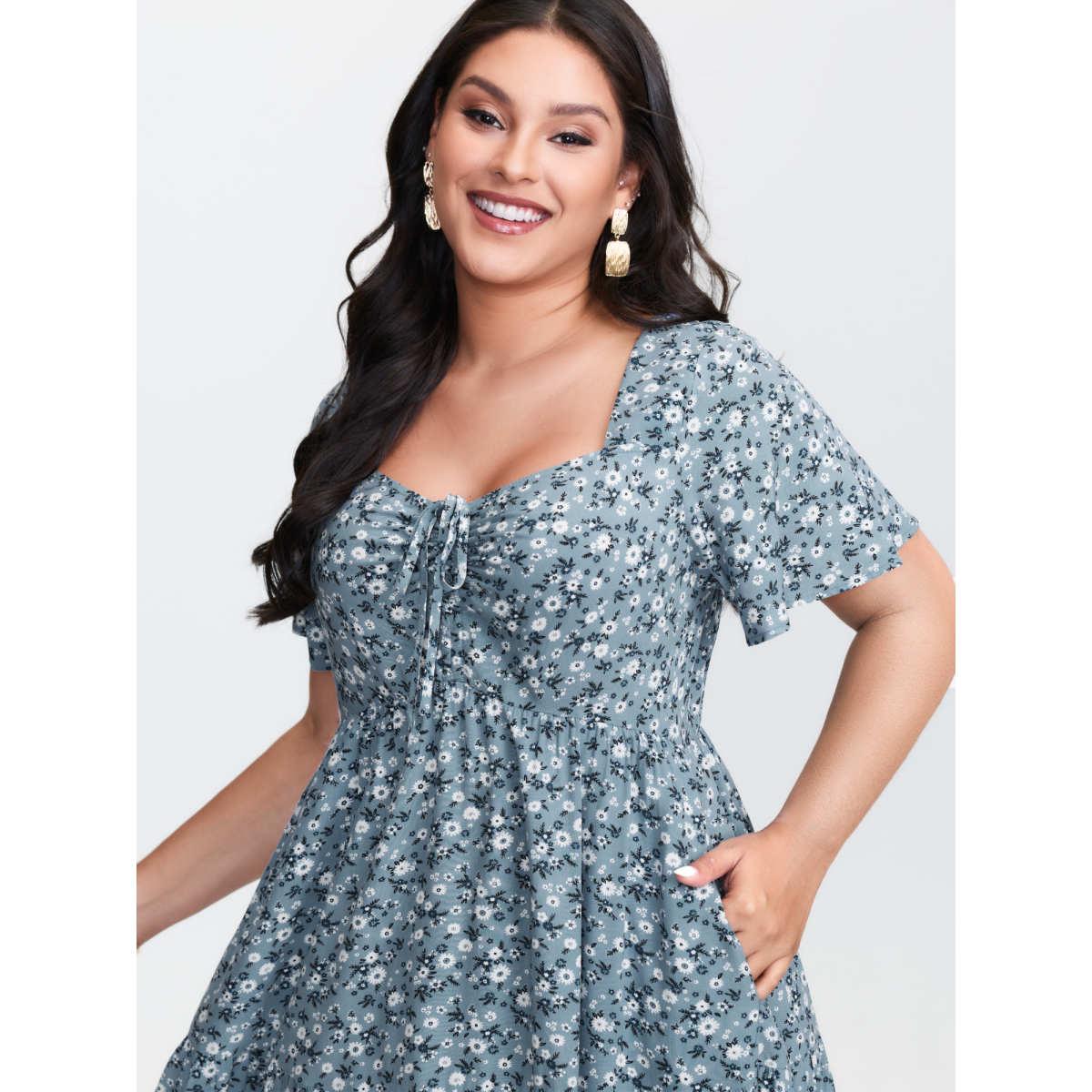 Plus Size Ditsy Floral Sweetheart Drawstring Pocket Tiered Dress Aegean Women Timeless Non V-neck Short sleeve Curvy Midi Dress BloomChic 30/6X