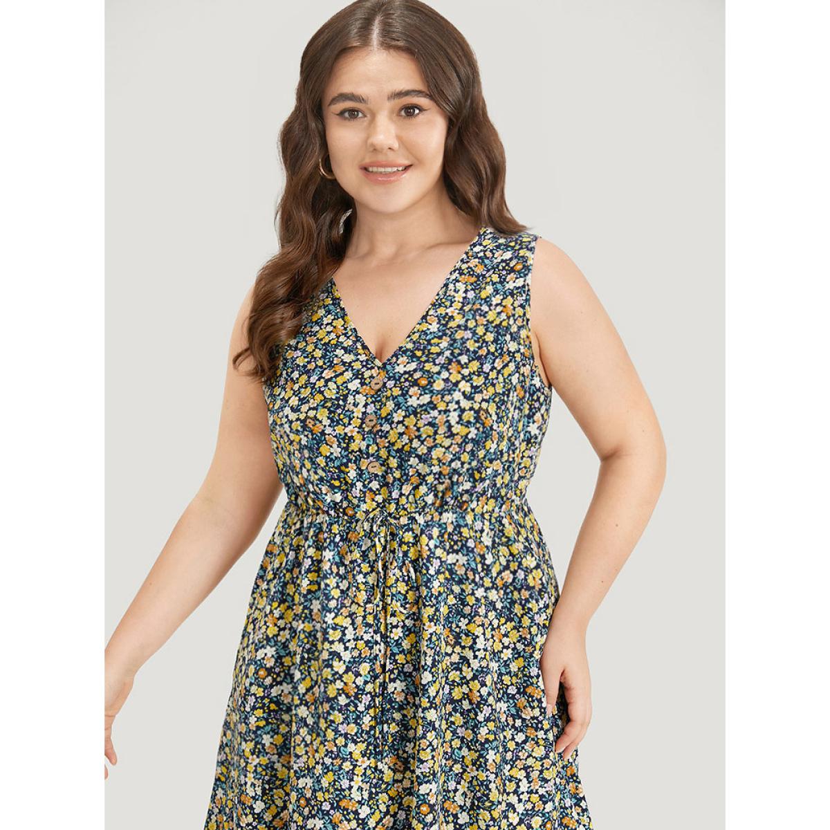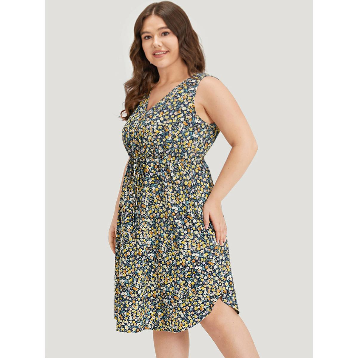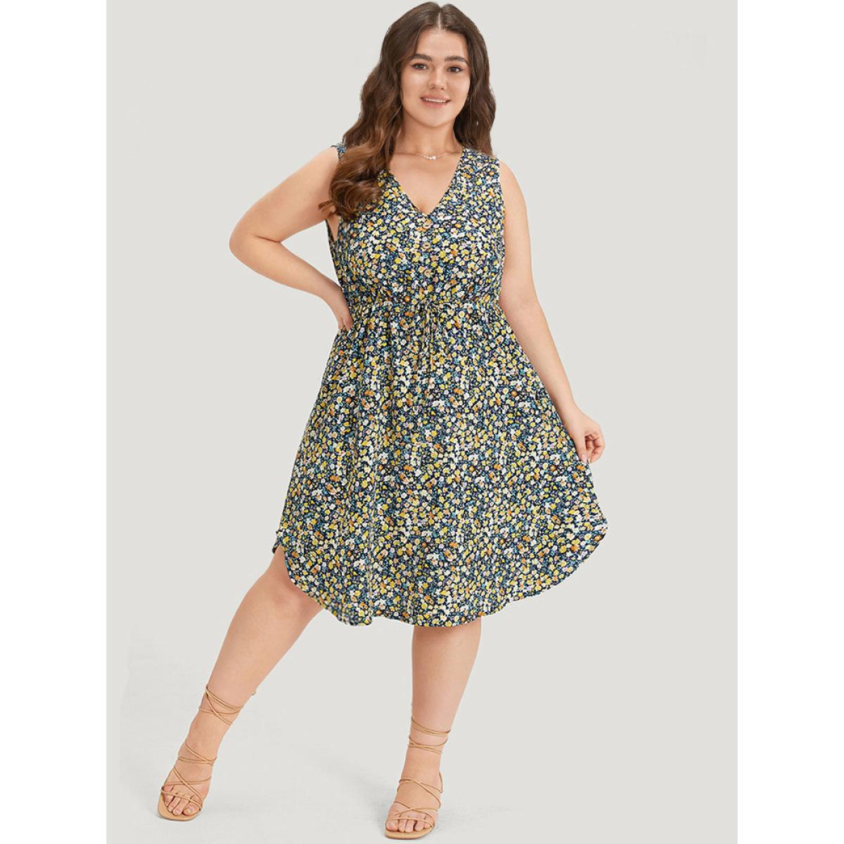 Plus Size Ditsy Floral V Neck Pocket Gathered Sleeveless Dress Indigo Women Elegant Cross straps V-neck Sleeveless Curvy Midi Dress BloomChic 26/4X