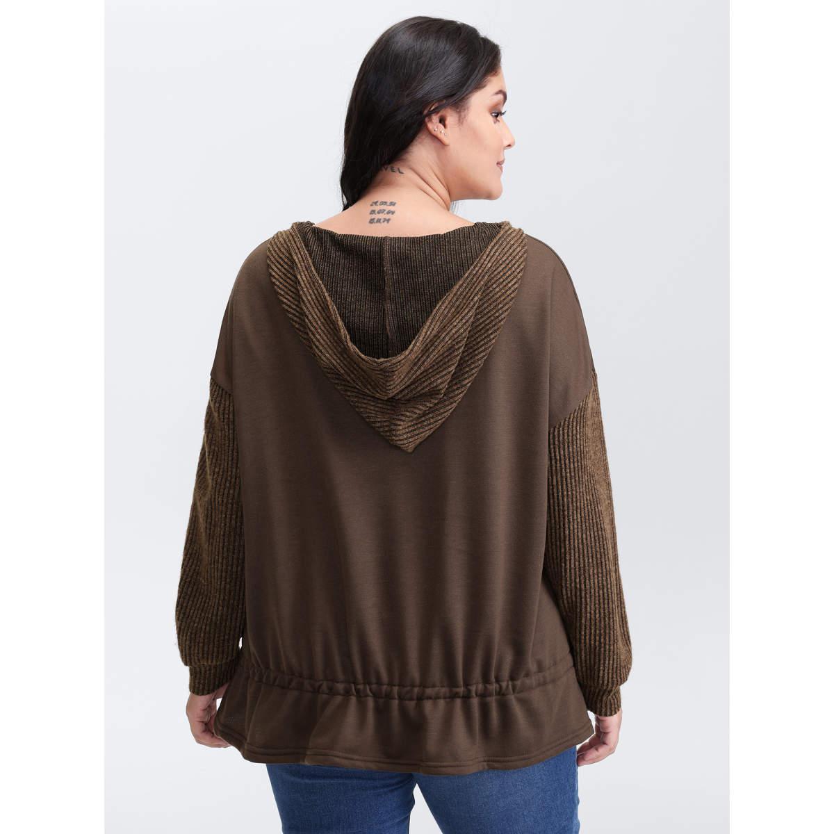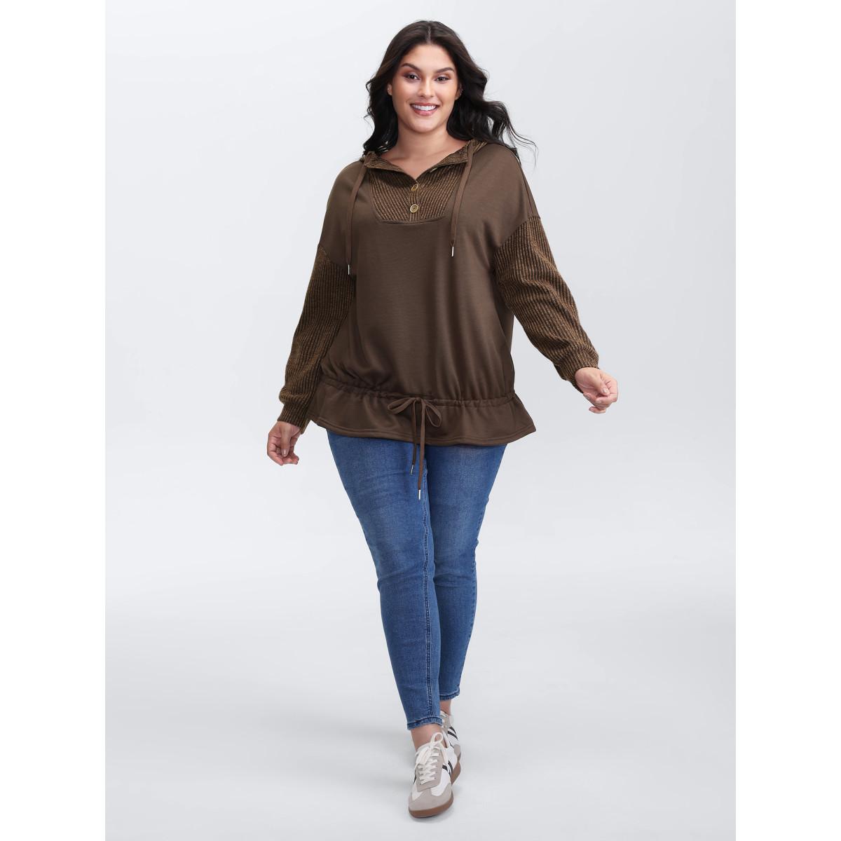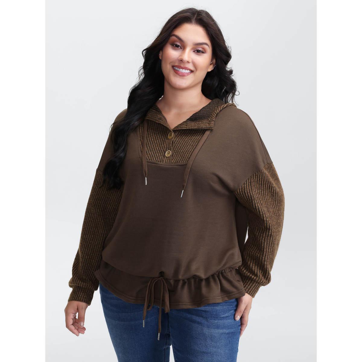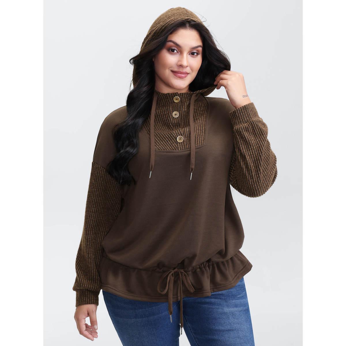Plus Size Drawstring Mixed Material Button Hoodie Women DarkBrown Leisure Texture Hooded Casual Sweatshirts BloomChic 18-20/2X