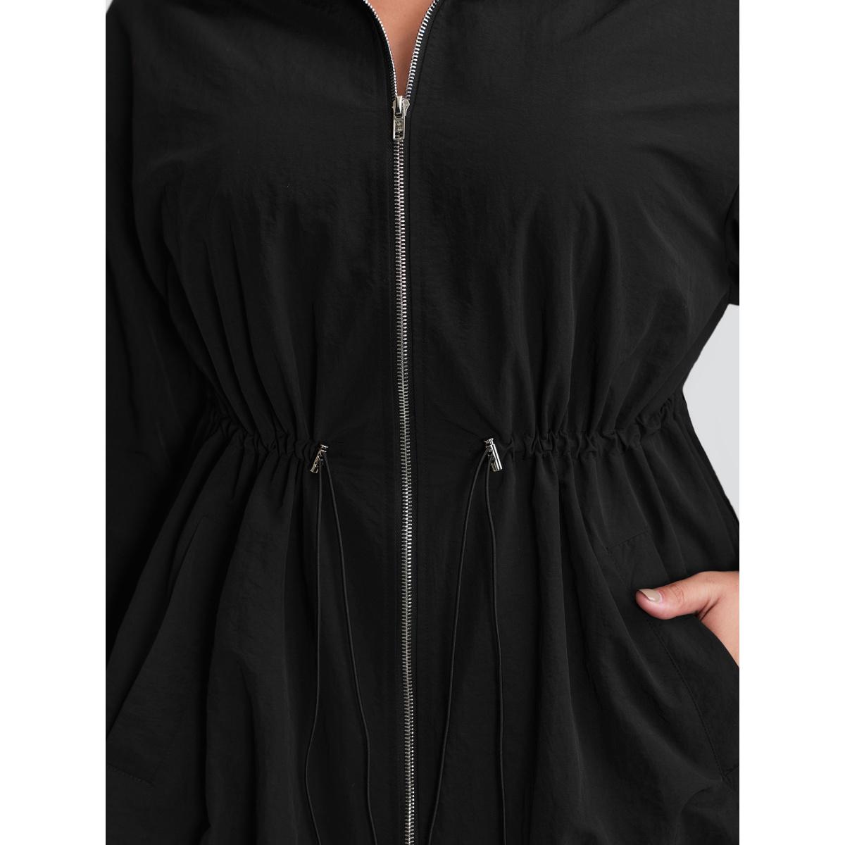 Plus Size Plain Hooded Zipper Drawstring Tab Sleeve Coat Women Black Plain Pocket Everyday Jackets BloomChic 14-16/1X