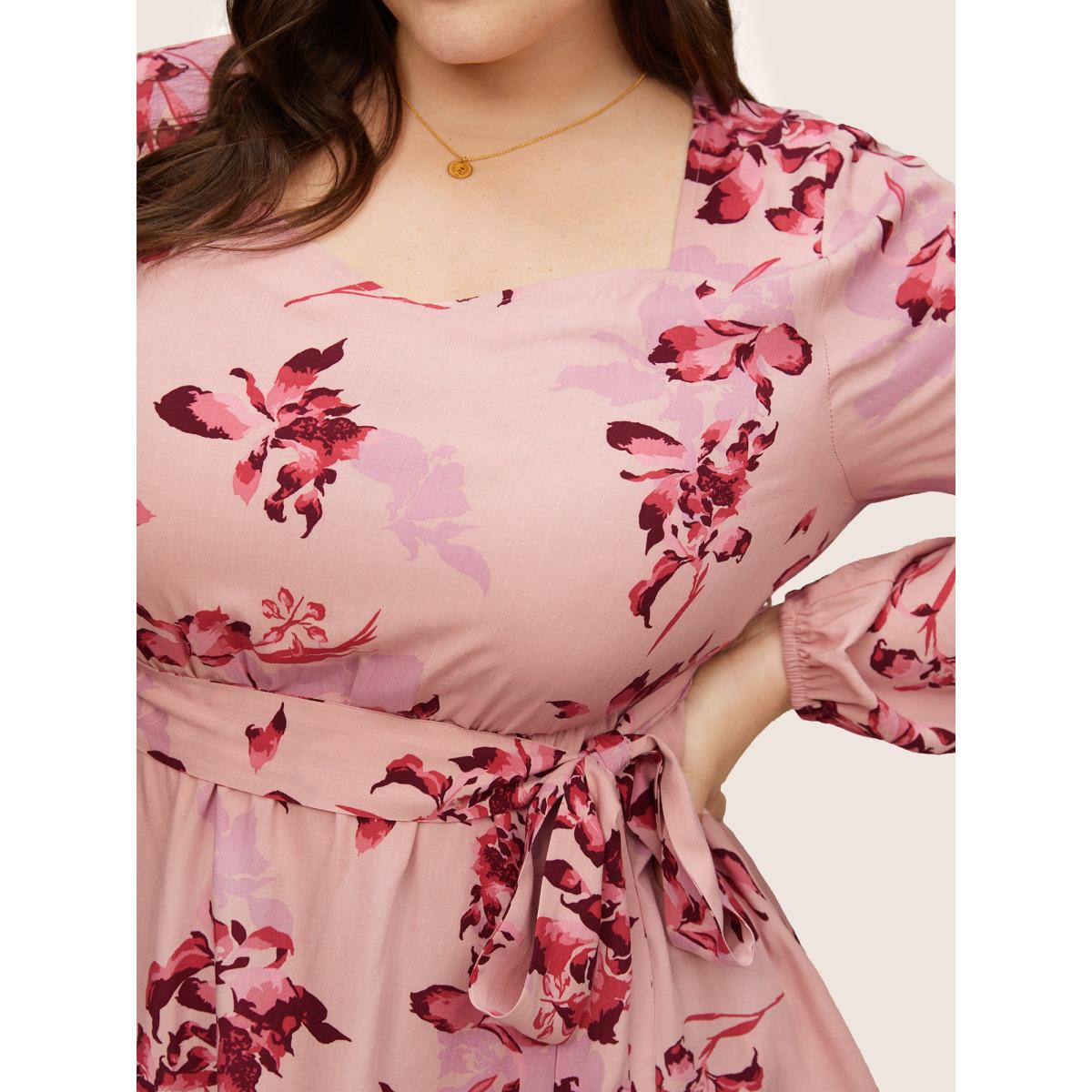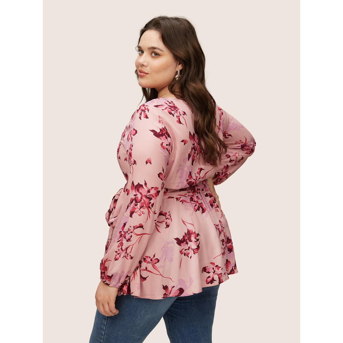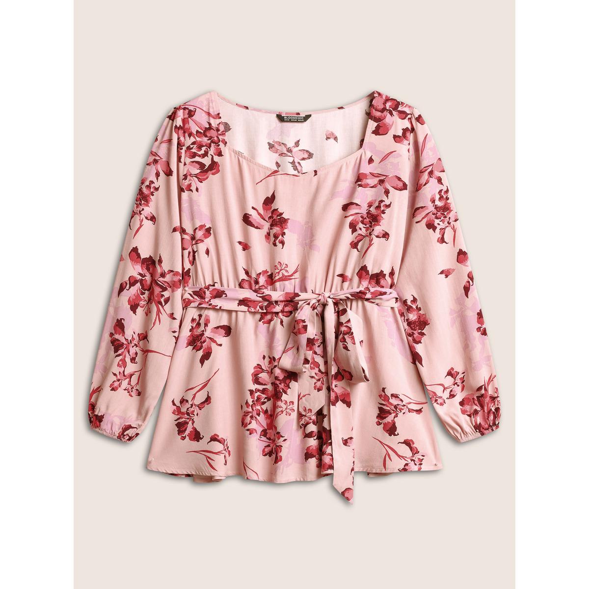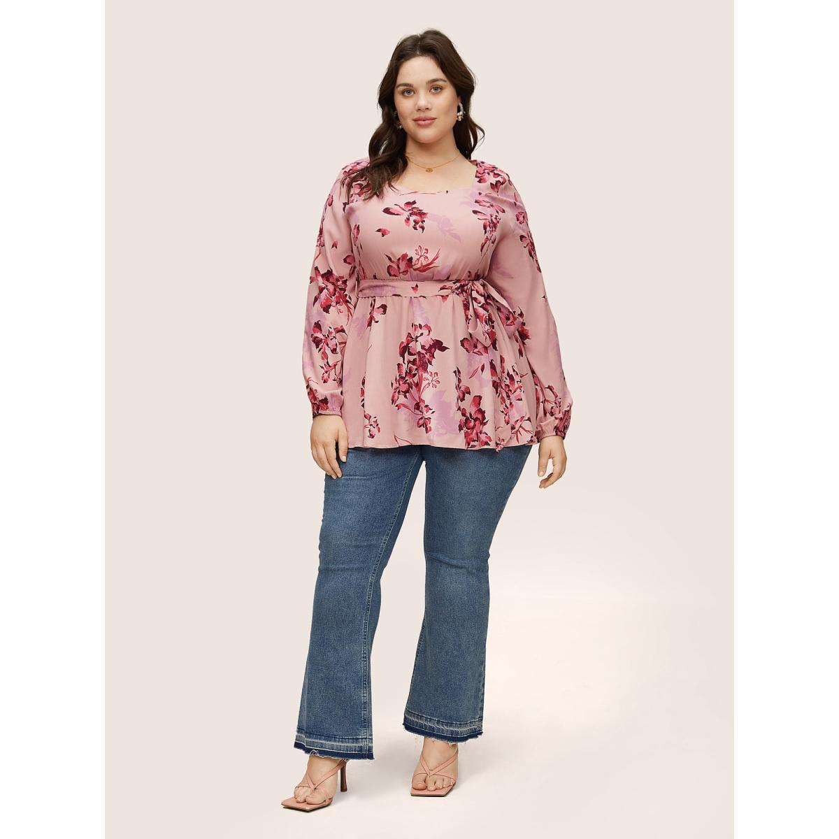 Plus Size DustyPink Floral Elastic Waist Belted Square Neck Gathered Blouse Women Elegant Long Sleeve Square Neck Dailywear Blouses BloomChic 22-24/3X