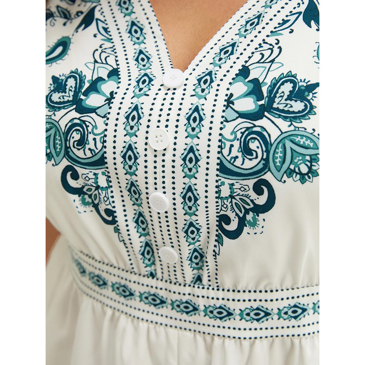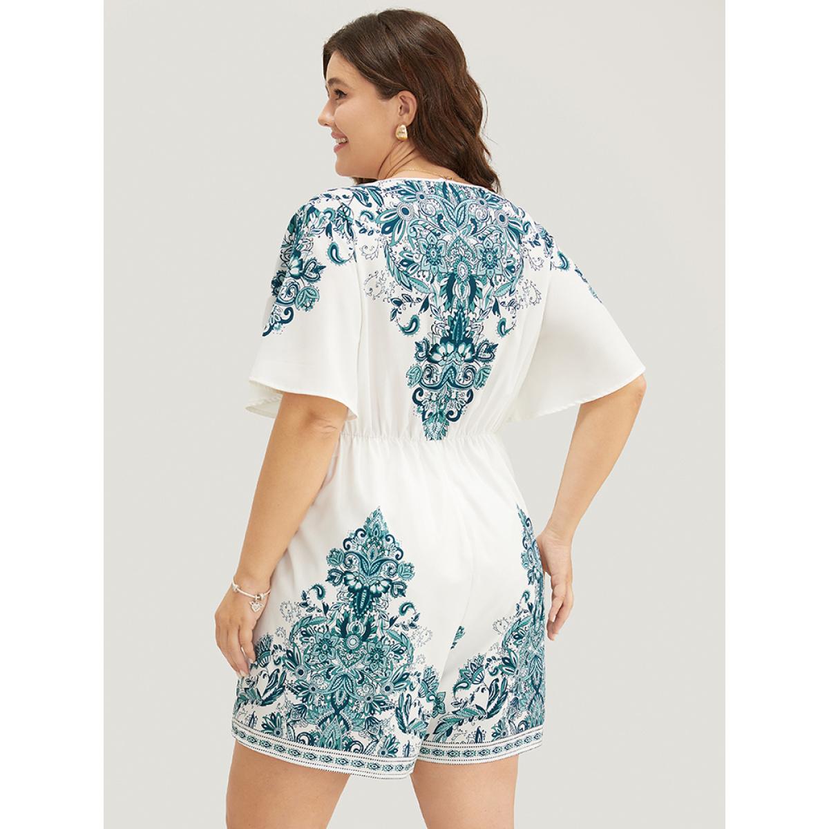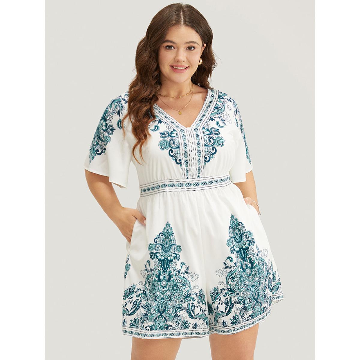 Plus Size Emerald Bandana Print Ruffle Sleeve Pocket Button Detail Romper Women Vacation Short sleeve V-neck Dailywear Loose Jumpsuits BloomChic 28/5X