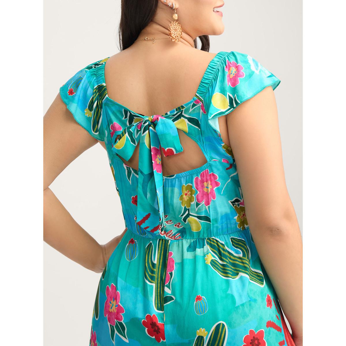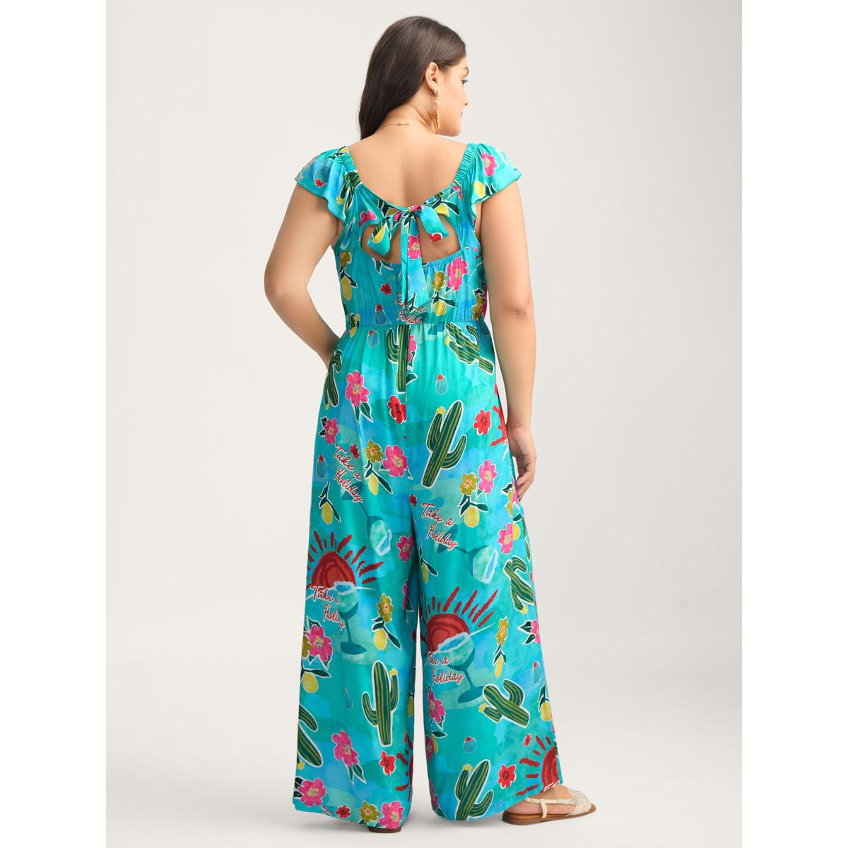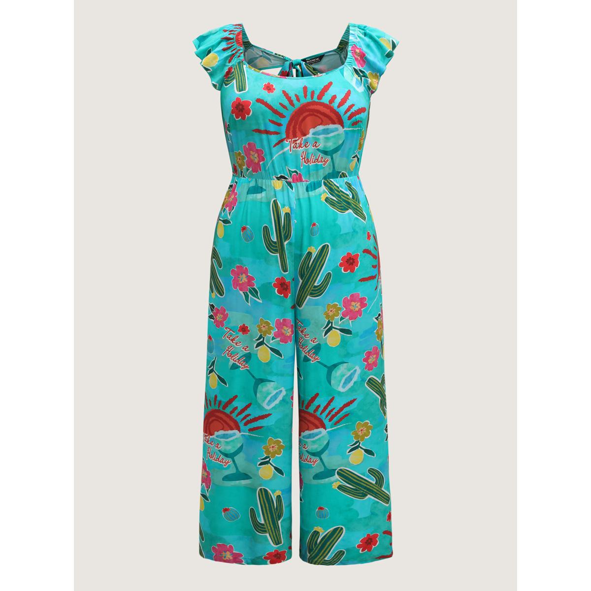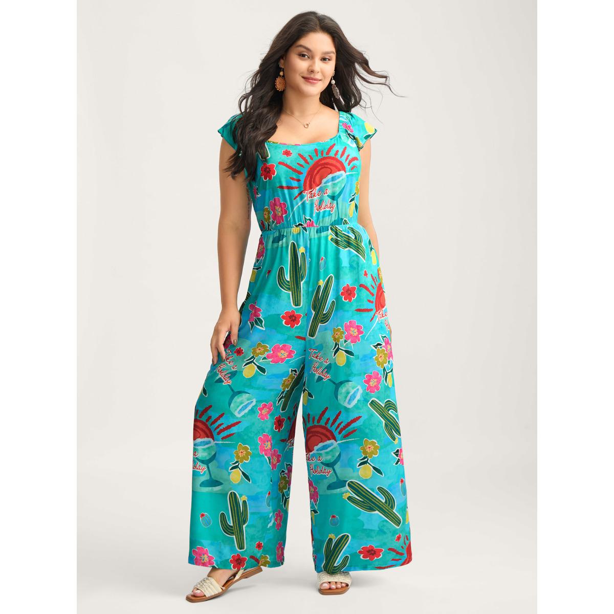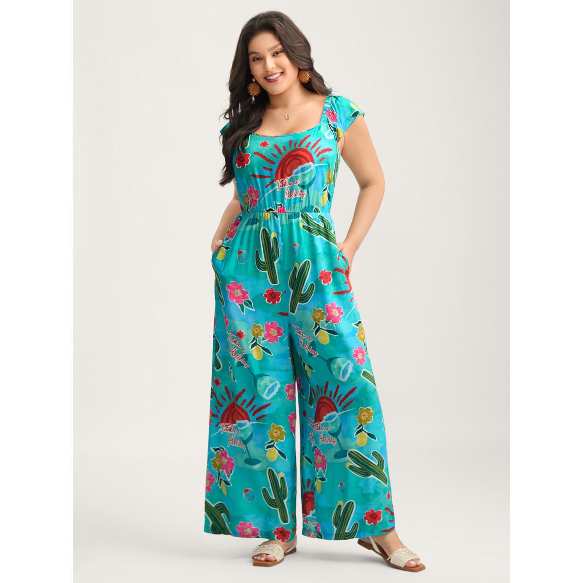 Plus Size Emerald Cactus Holiday Print Cut-Out Back Jumpsuit Women Cap Sleeve Square Neck Vacation Loose Jumpsuits BloomChic 10/M