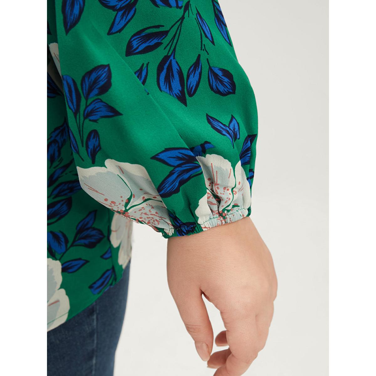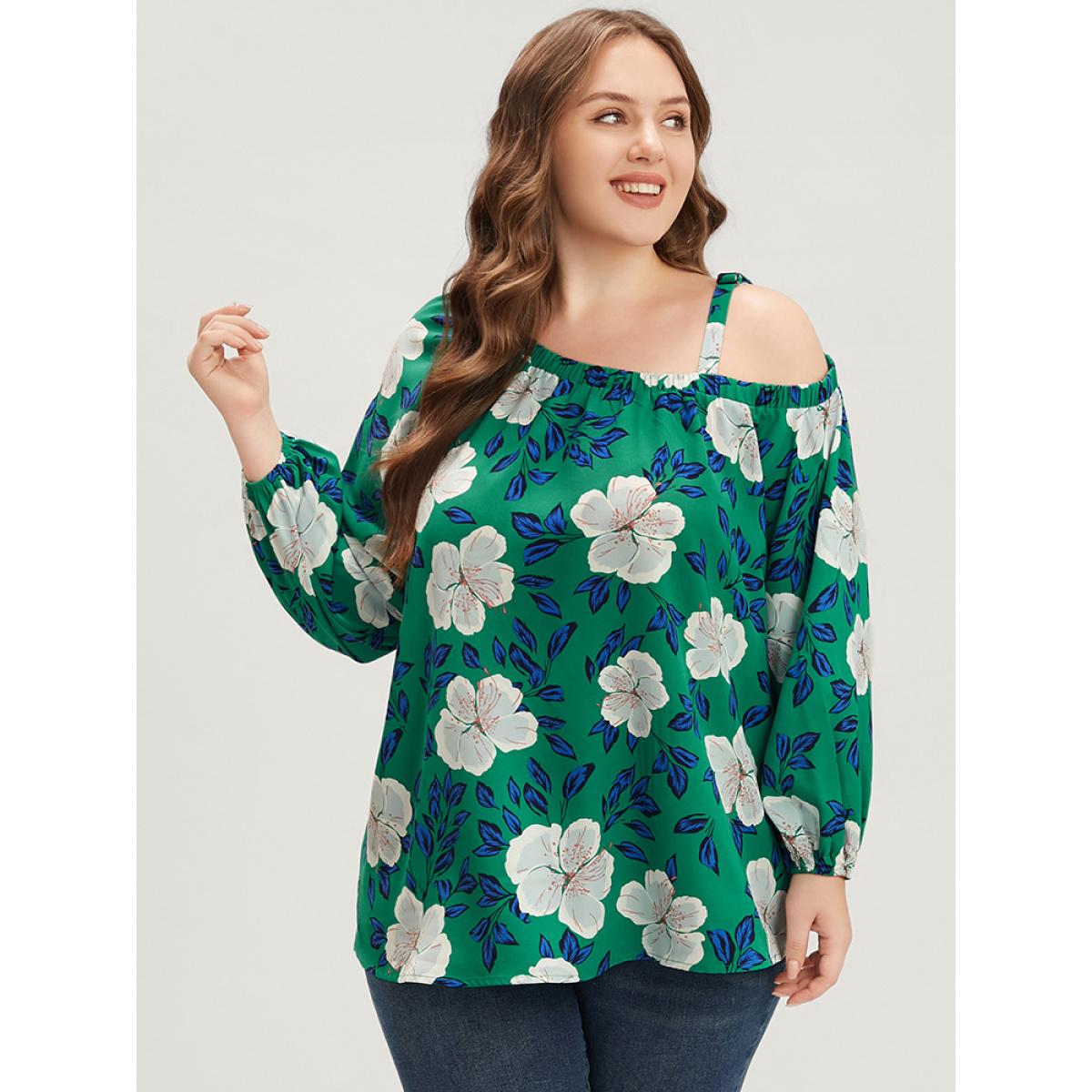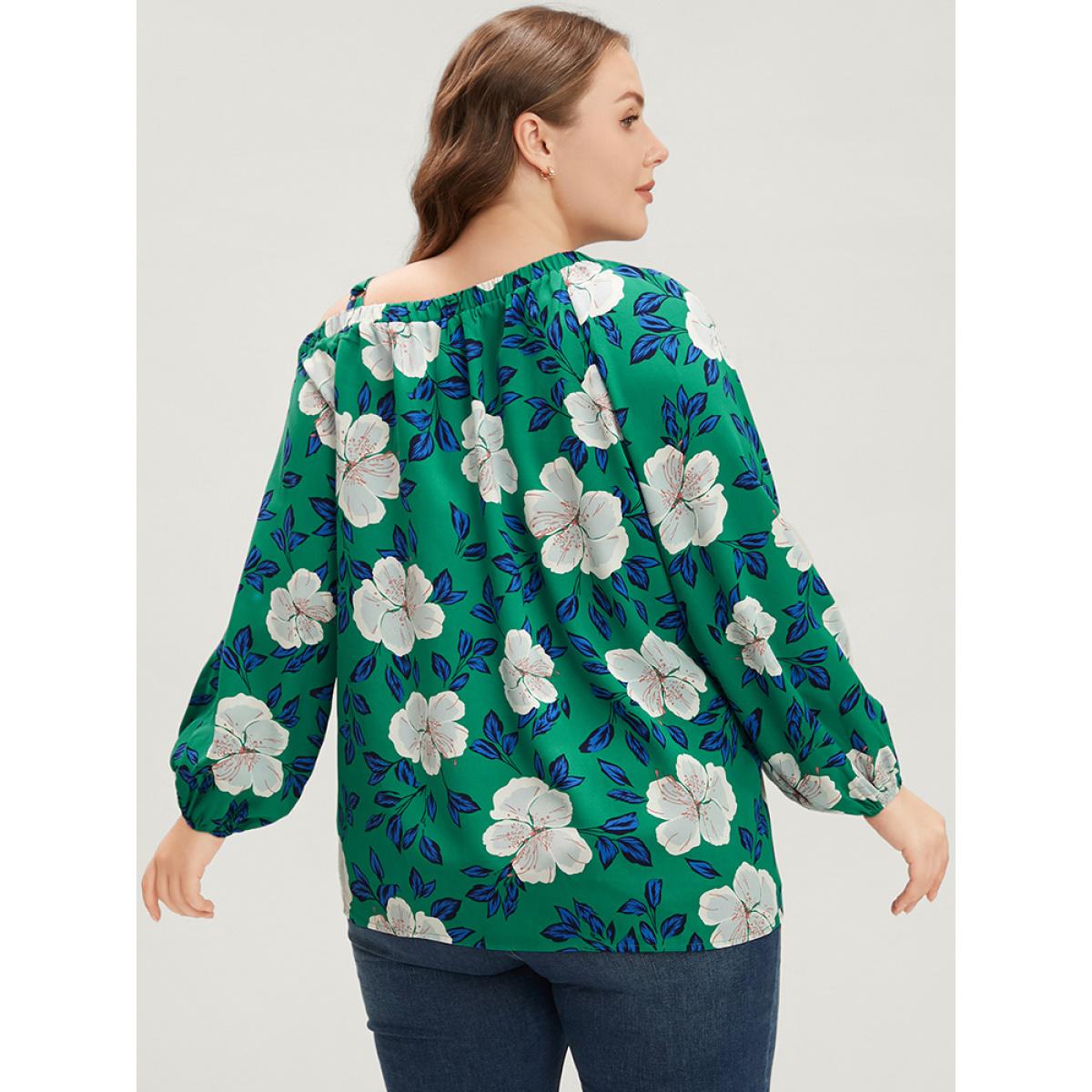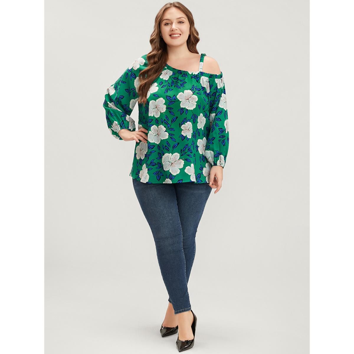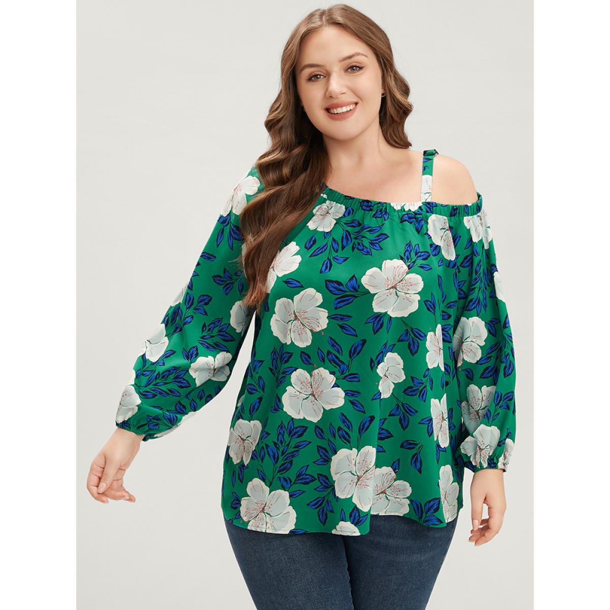 Plus Size Emerald Floral Lantern Sleeve Adjustable Straps One Shoulder Blouse Women Glamour Long Sleeve One Shoulder Dailywear Blouses BloomChic 10/M