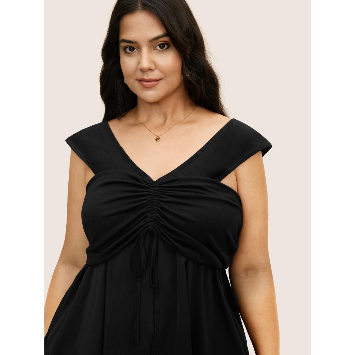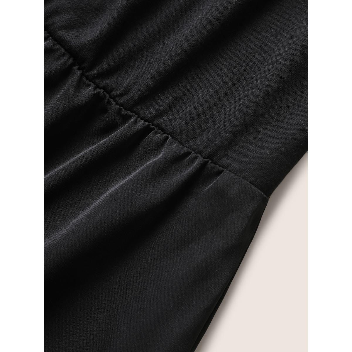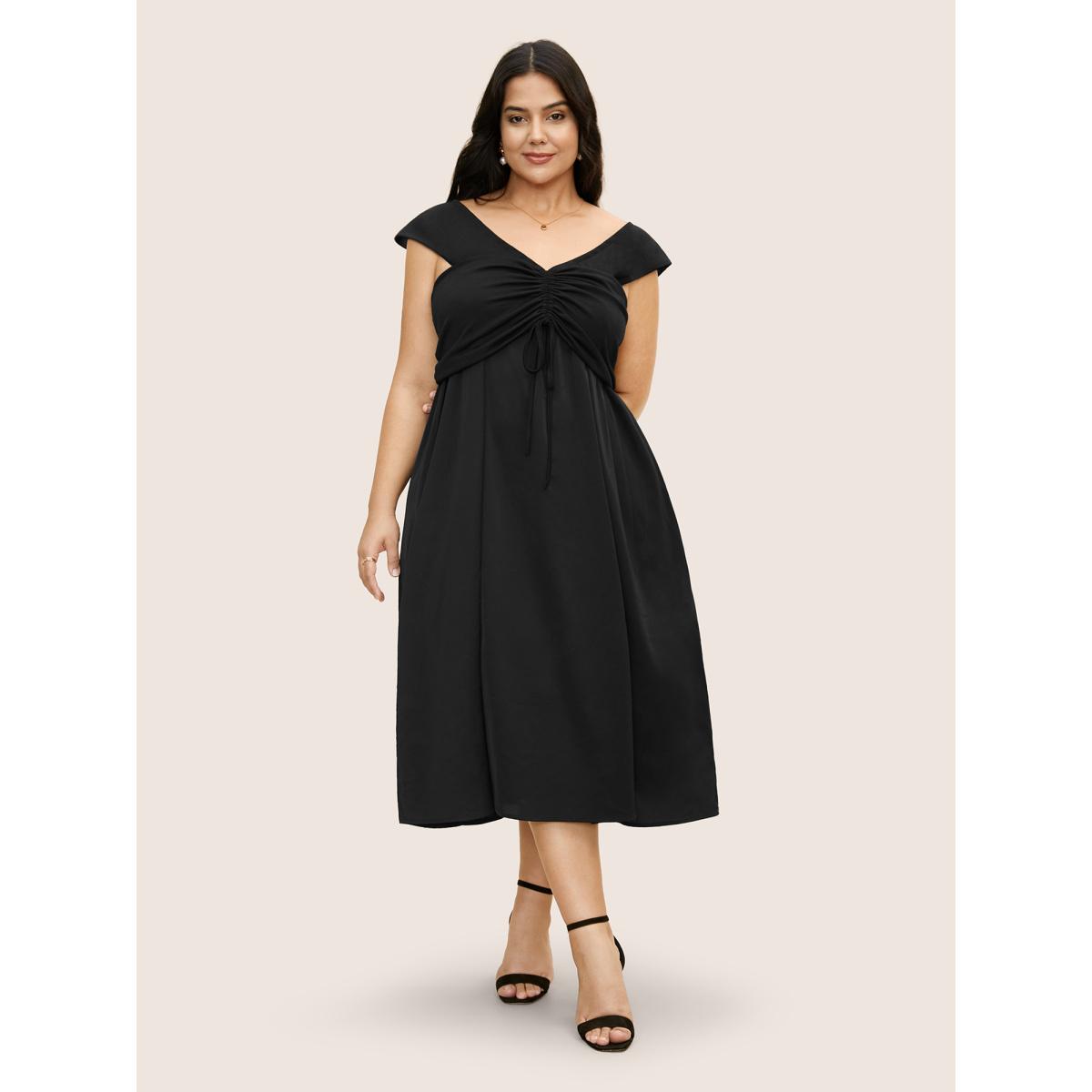 Plus Size Plain Ruched Drawstring Pocket Ruffle Tiered Dress Black Women Elegant Non V-neck Short sleeve Curvy Midi Dress BloomChic 22-24/3X