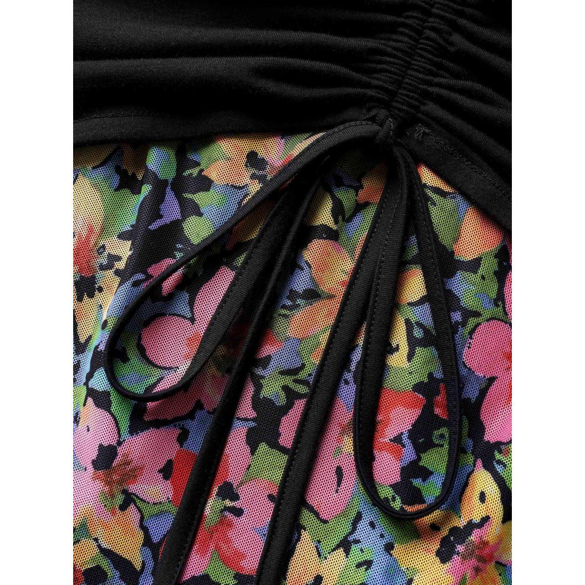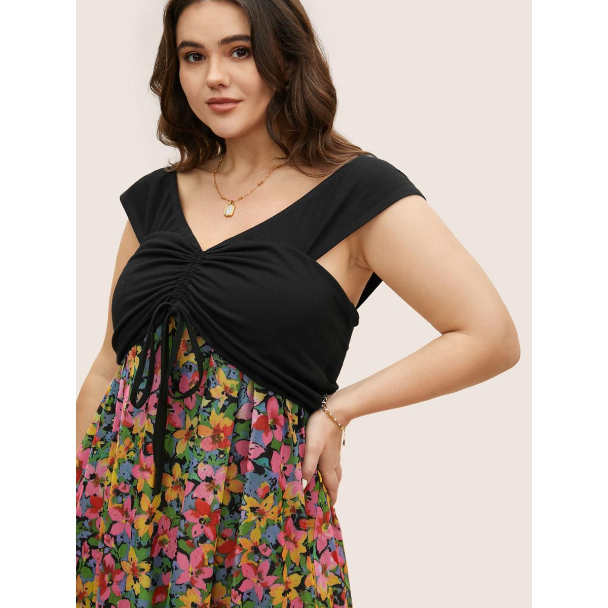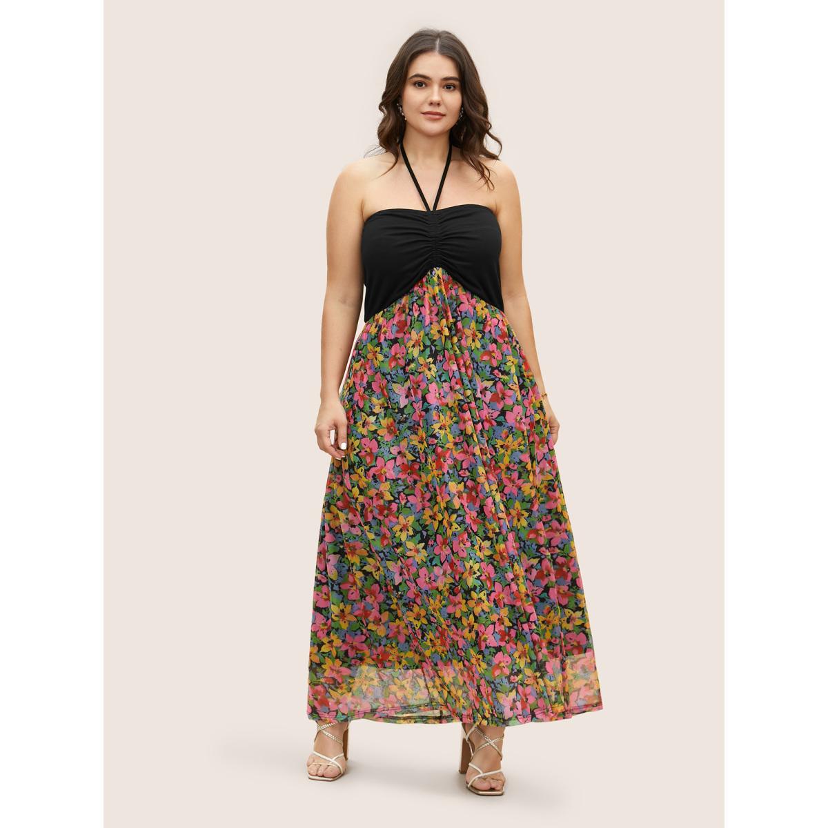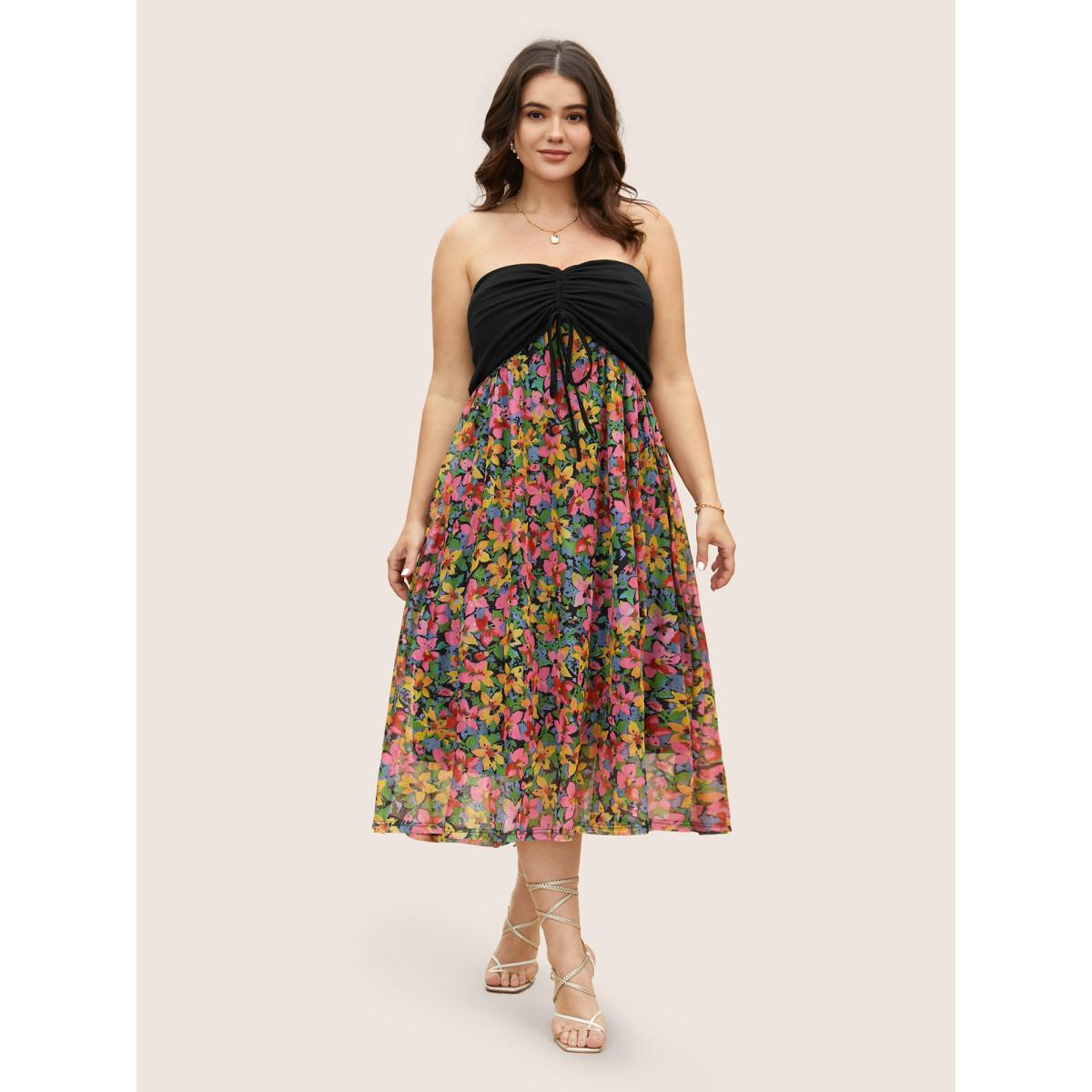 Plus Size Everywhere Dress - Floral Patchwork Drawstring Dress Black Women Elegant One-shoulder neck Sleeveless Curvy BloomChic 14-16/1X