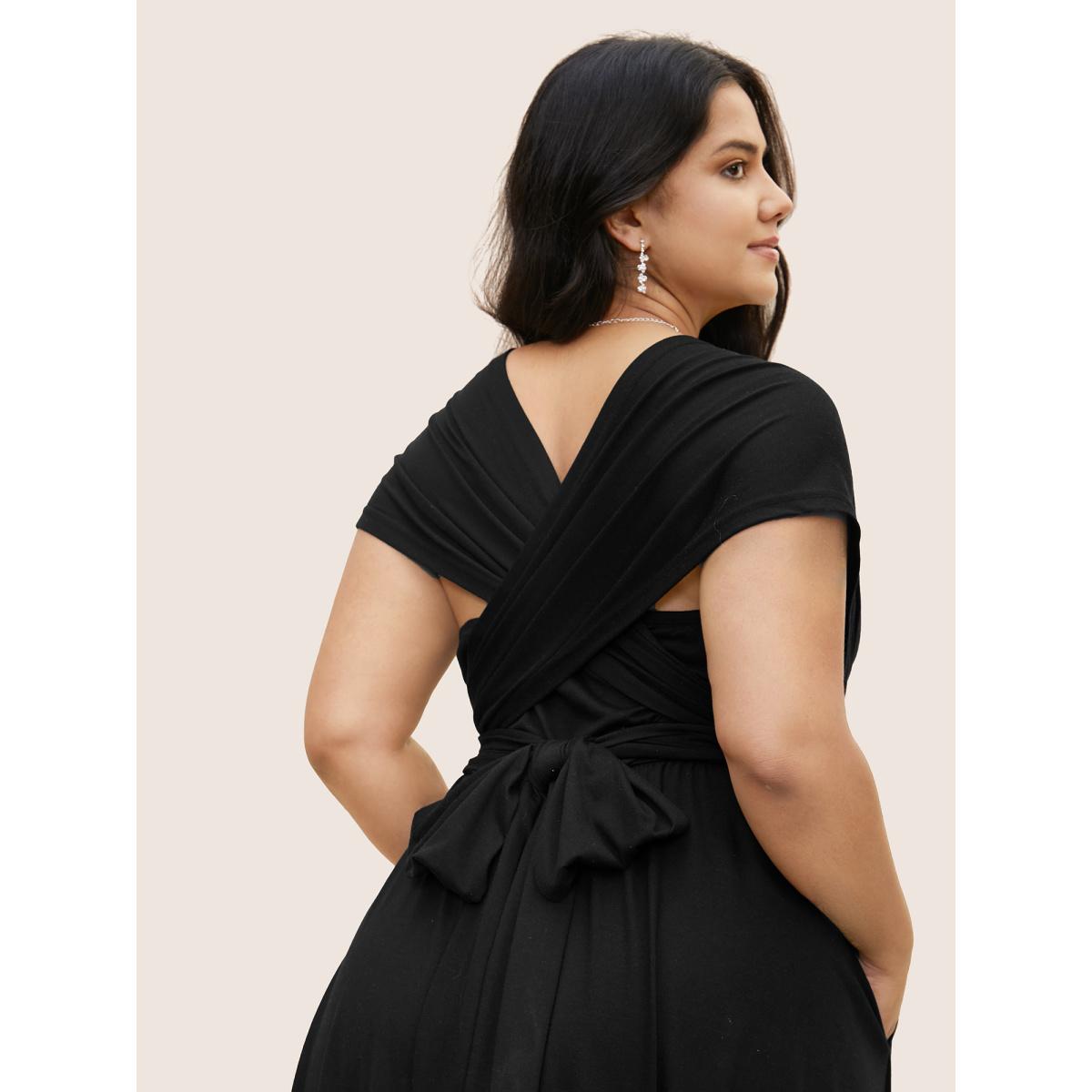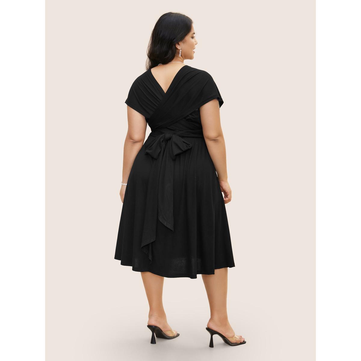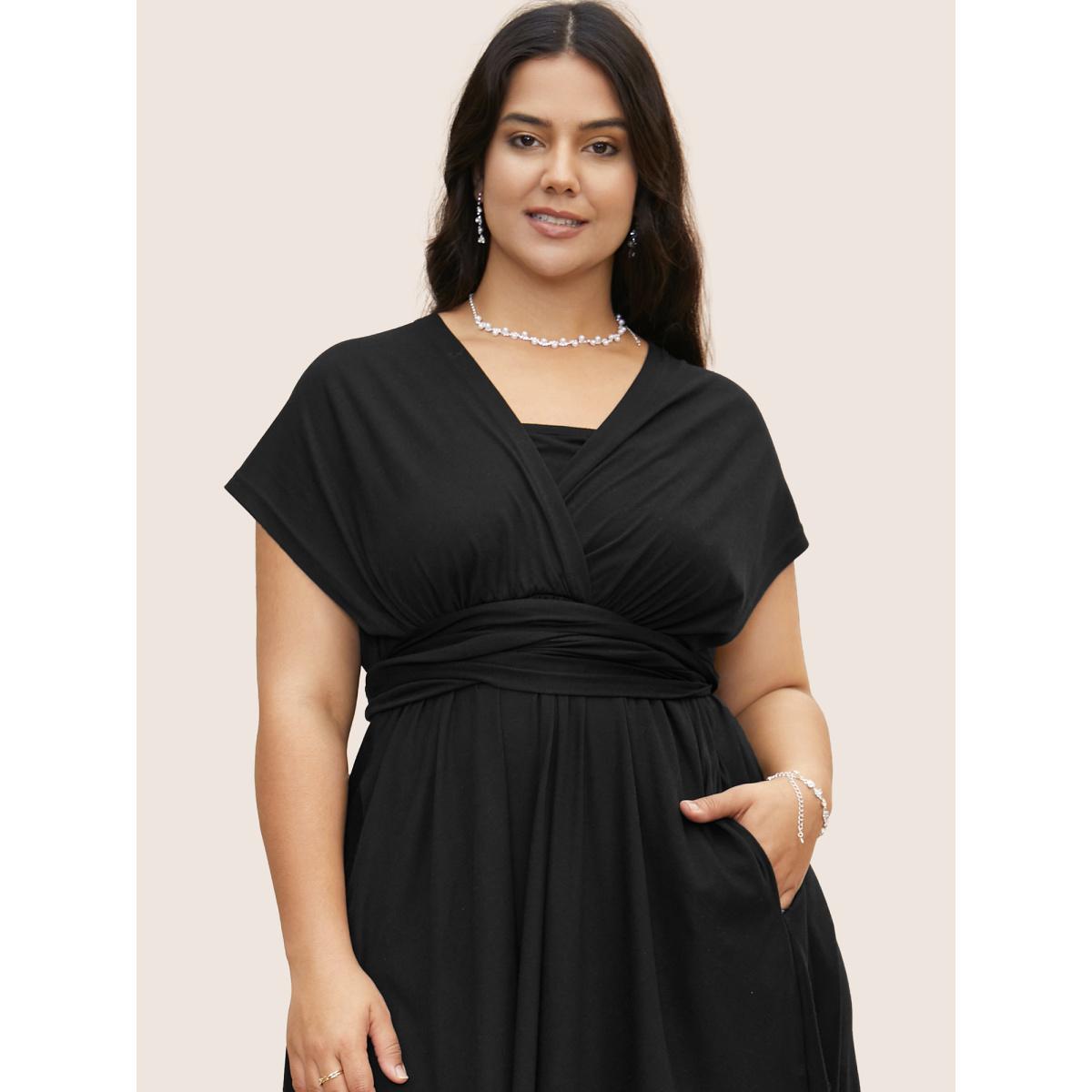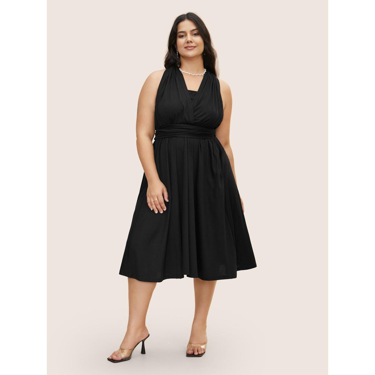 Plus Size Plain Buckle Detail Surplice Neck Tank Dress Black Women Elegant Wrap Overlap Collar Sleeveless Curvy Midi Dress BloomChic 28/5X