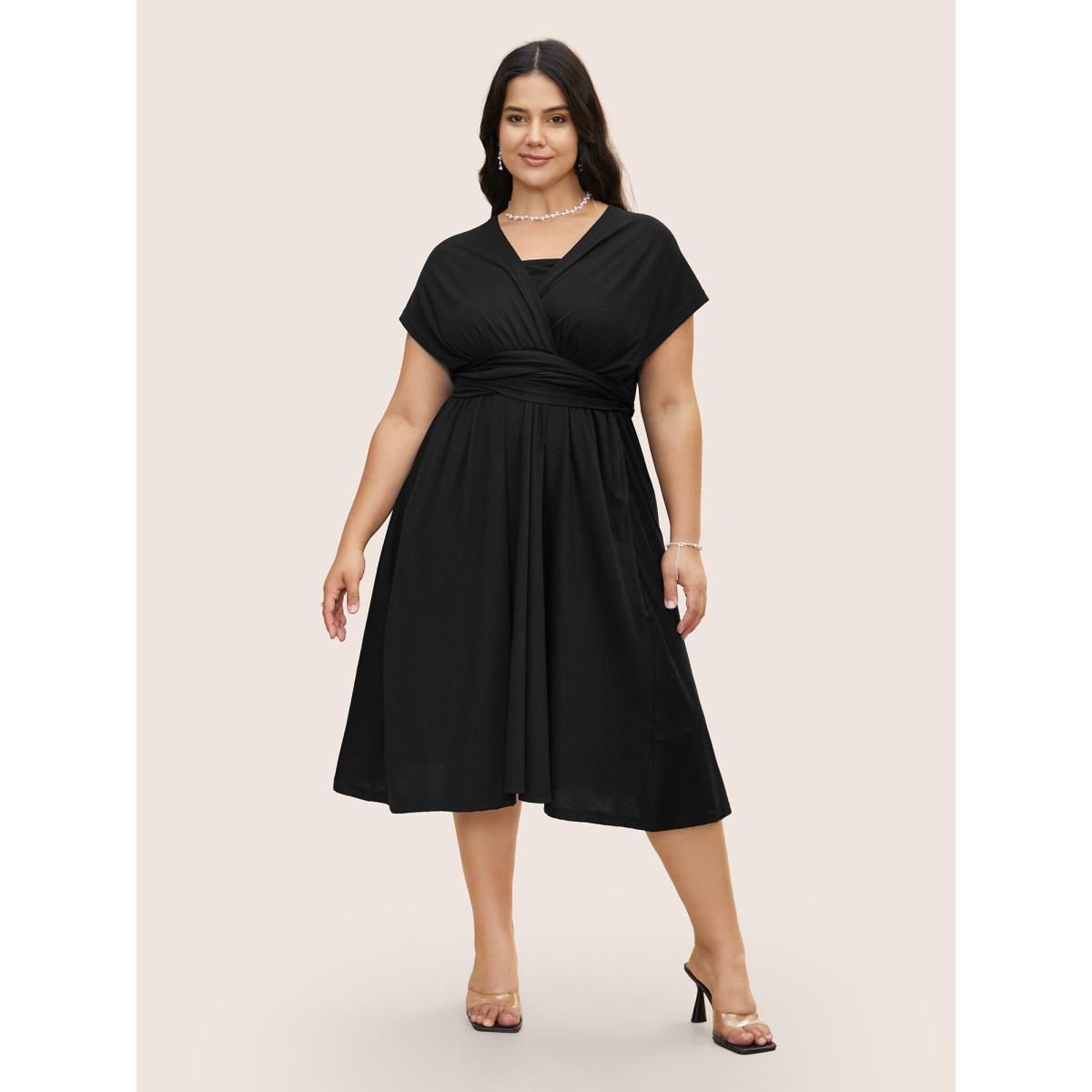 Plus Size Supersoft Essentials Ruched Wrap Pleated Hem Dress Black Women Casual Non Overlap Collar Long Sleeve Curvy Midi Dress BloomChic 22-24/3X