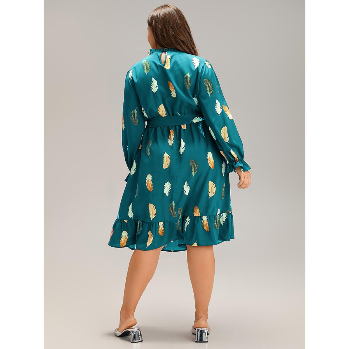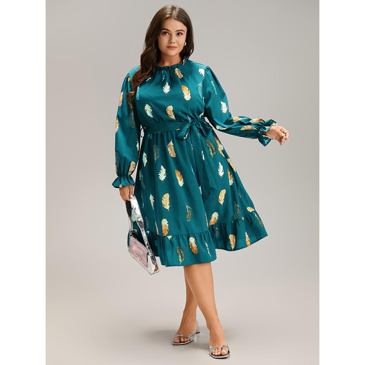 Plus Size Feather Print Frill Trim Belted Ruffle Hem Dress Teal Women At the Office Gathered Stand-up collar Long Sleeve Curvy Knee Dress BloomChic 12/L
