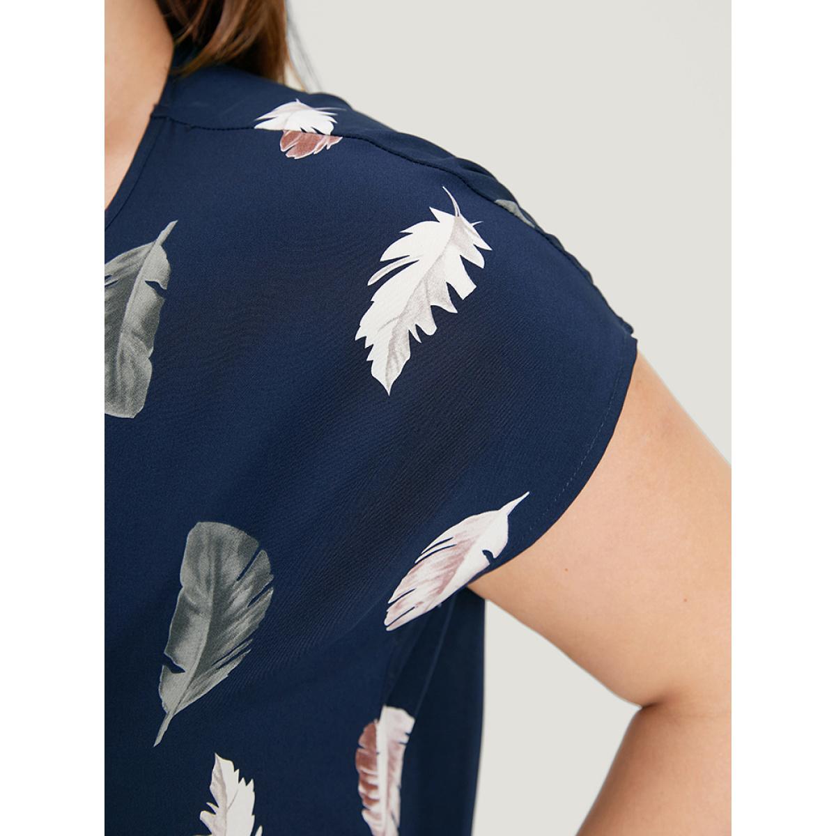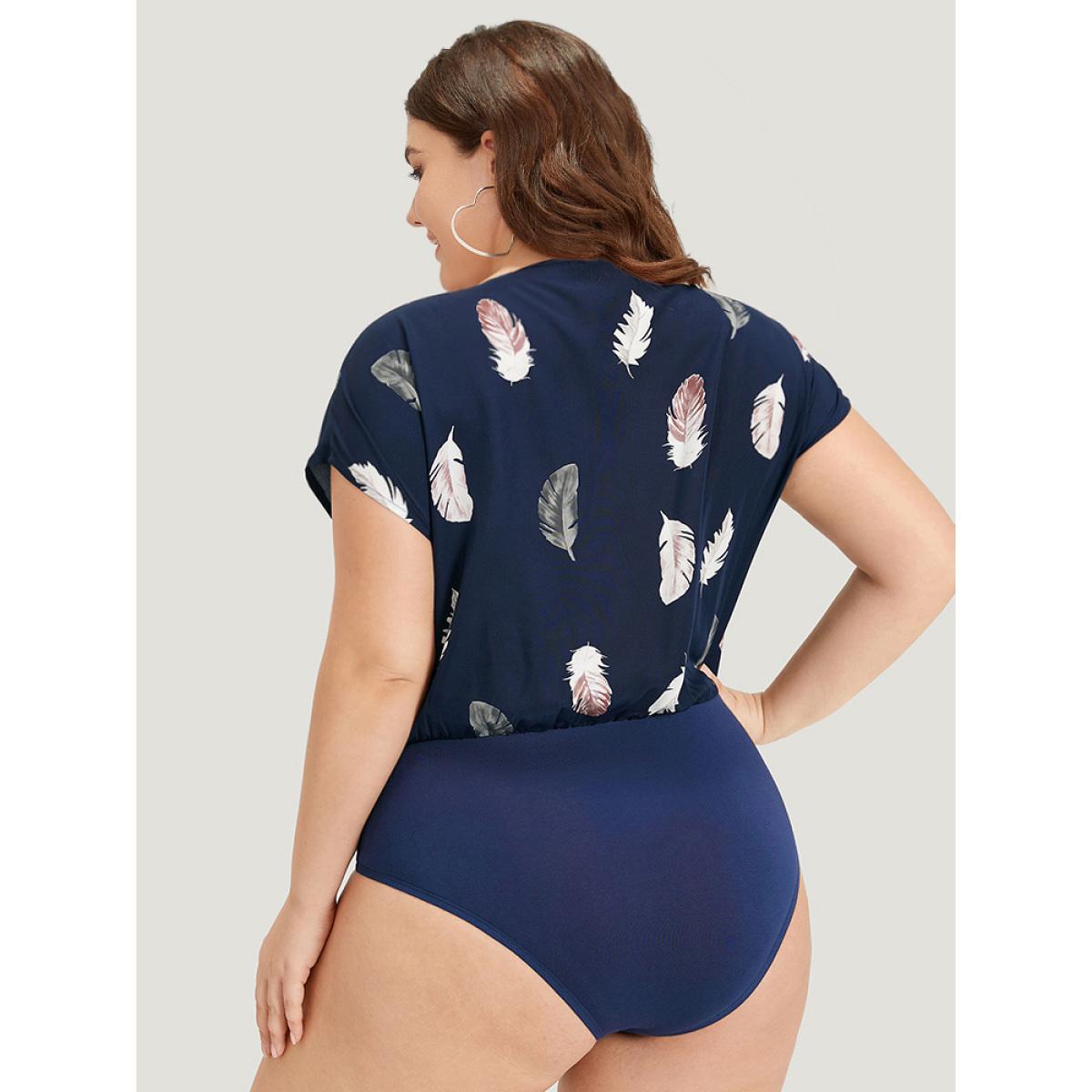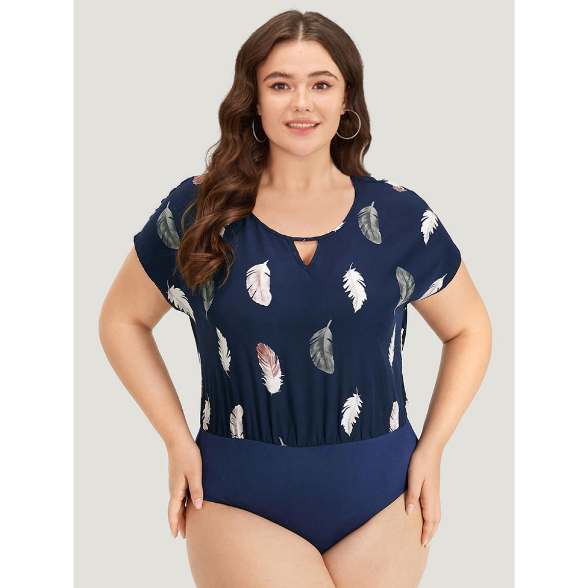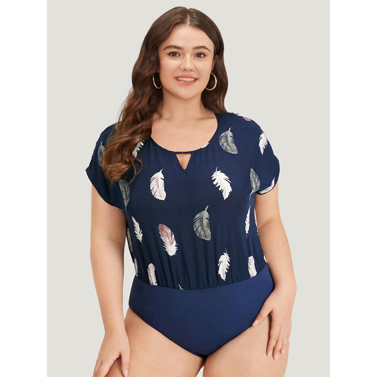 Plus Size Feather Print Keyhole Batwing Sleeve Bodysuit Women DarkBlue Feather Printed Bodysuits BloomChic 12/L