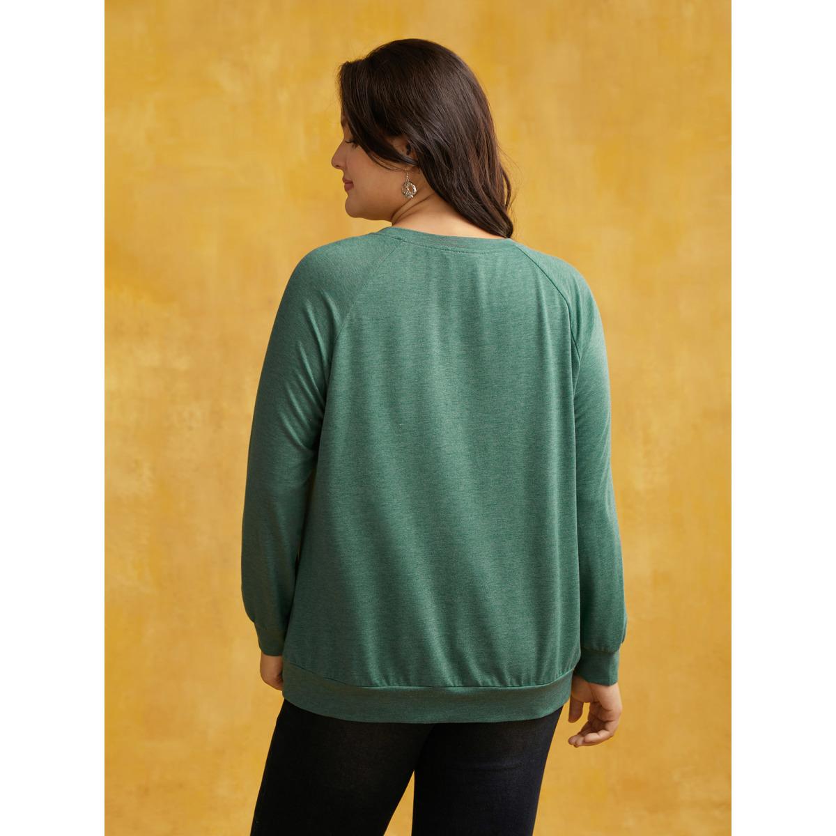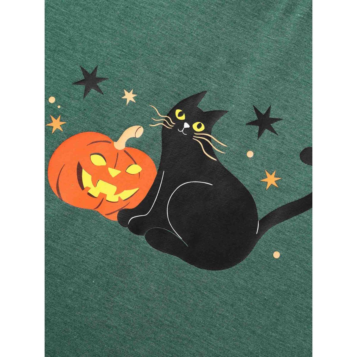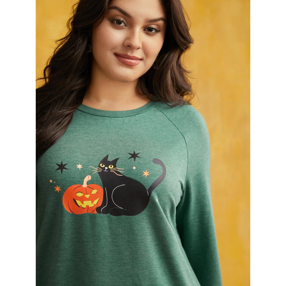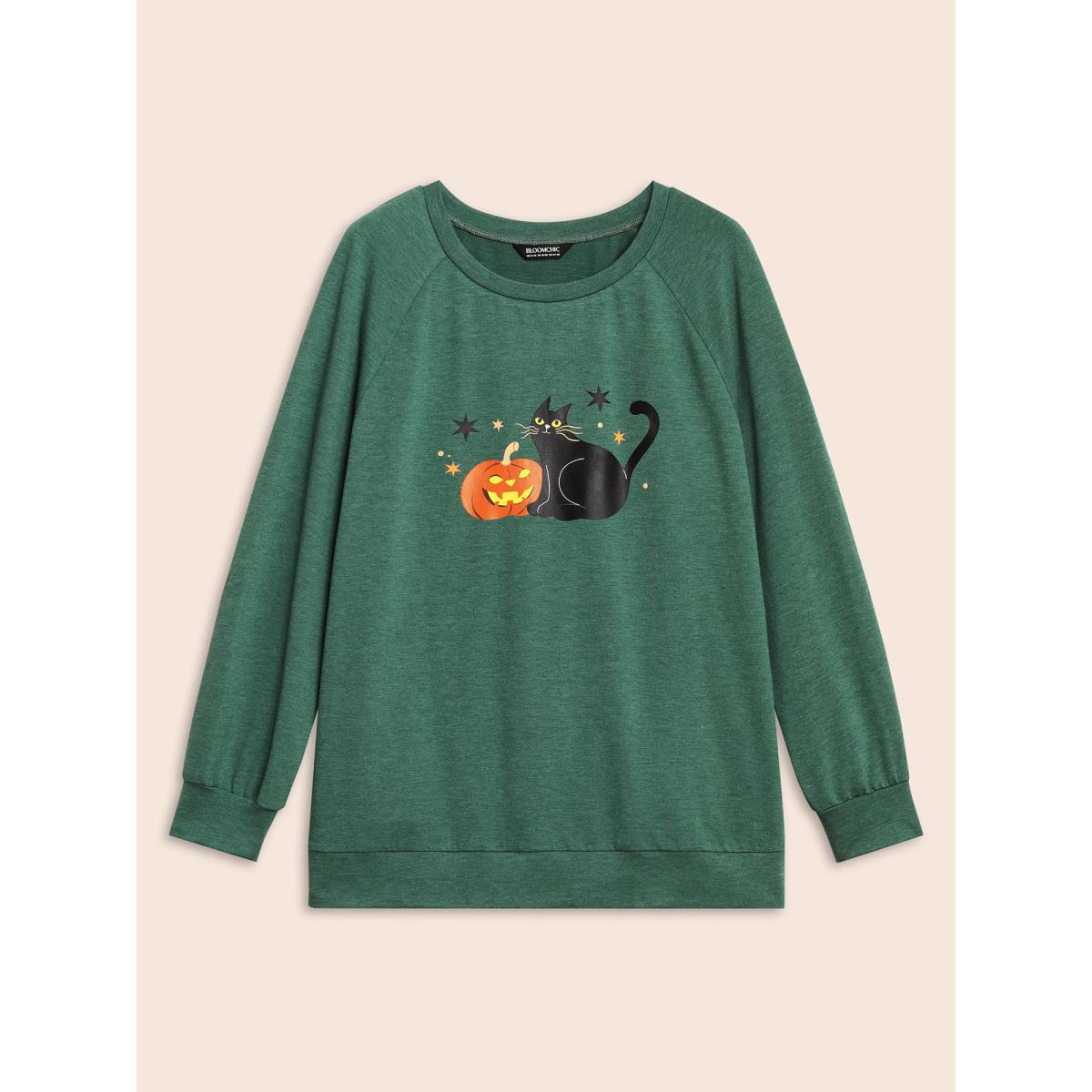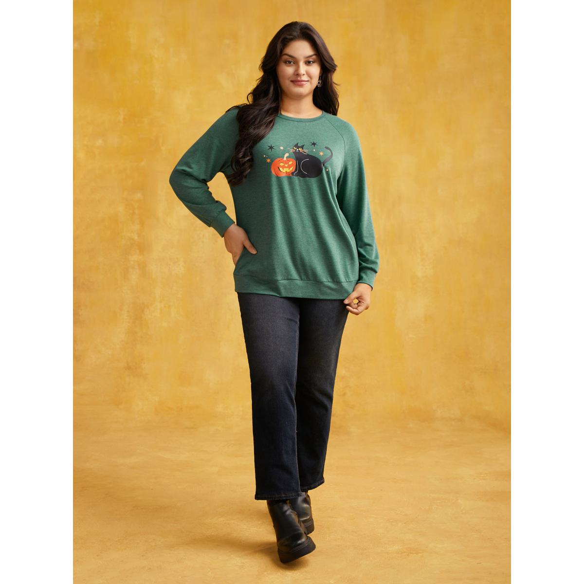 Plus Size Festive Cat And Pumkin Raglan Sweatshirt Women Emerald Casual Non Round Neck Everyday Sweatshirts BloomChic 22-24/3X