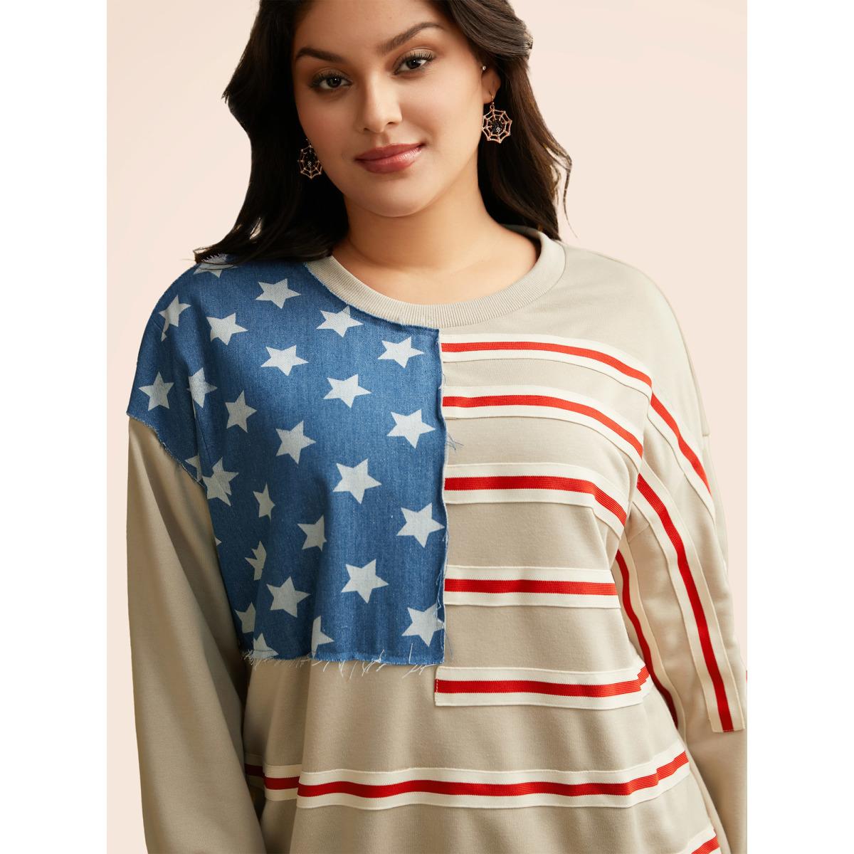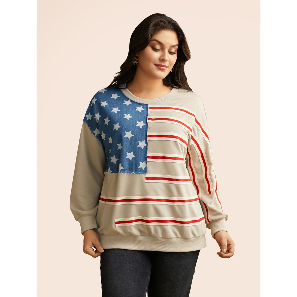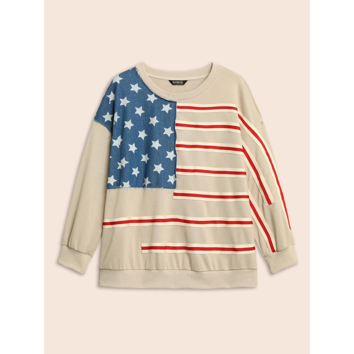 Plus Size Flag And Denim Spliced Crew Neck Sweatshirt Women Champagne Casual Woven ribbon&lace trim Loose Round Neck Everyday Sweatshirts BloomChic 10/M
