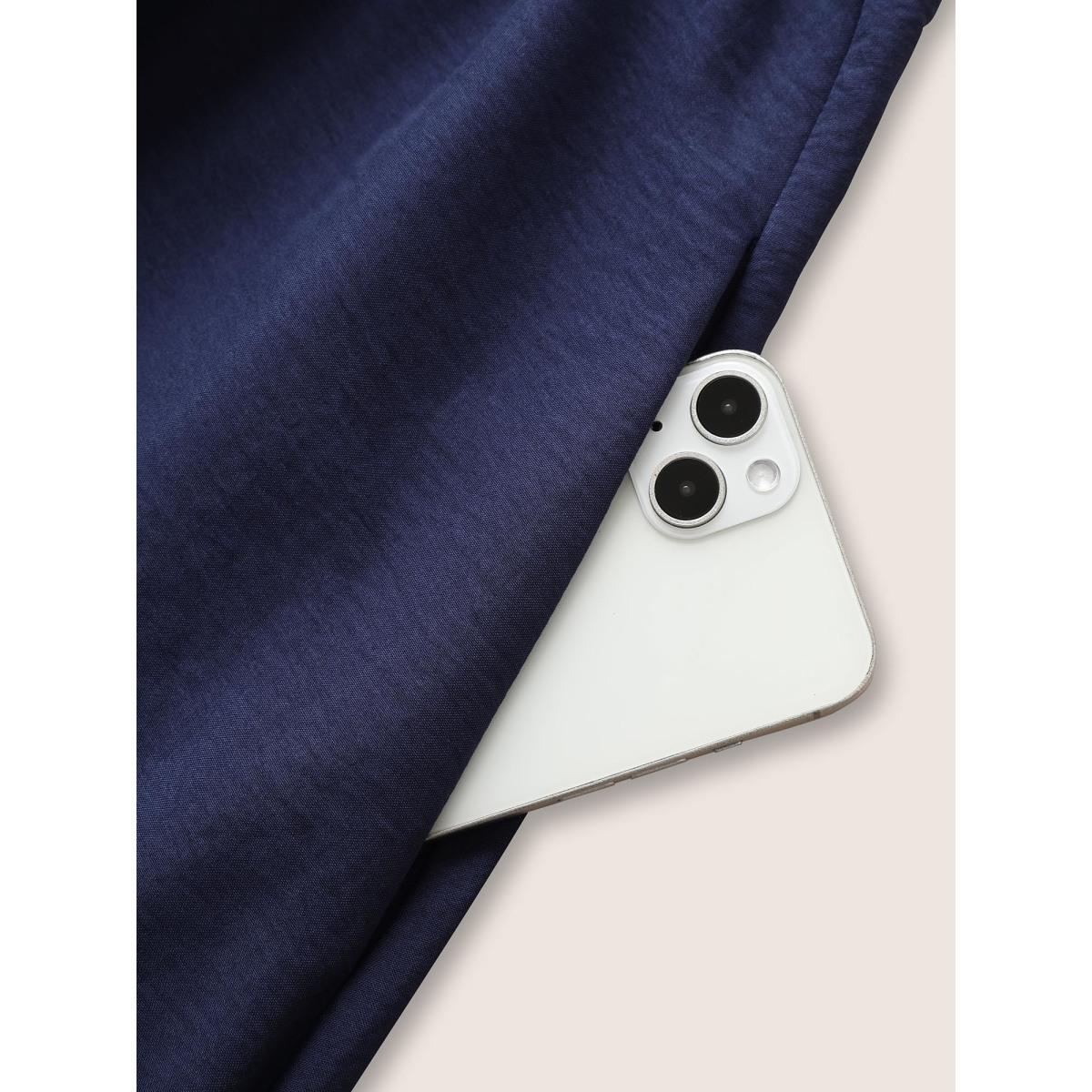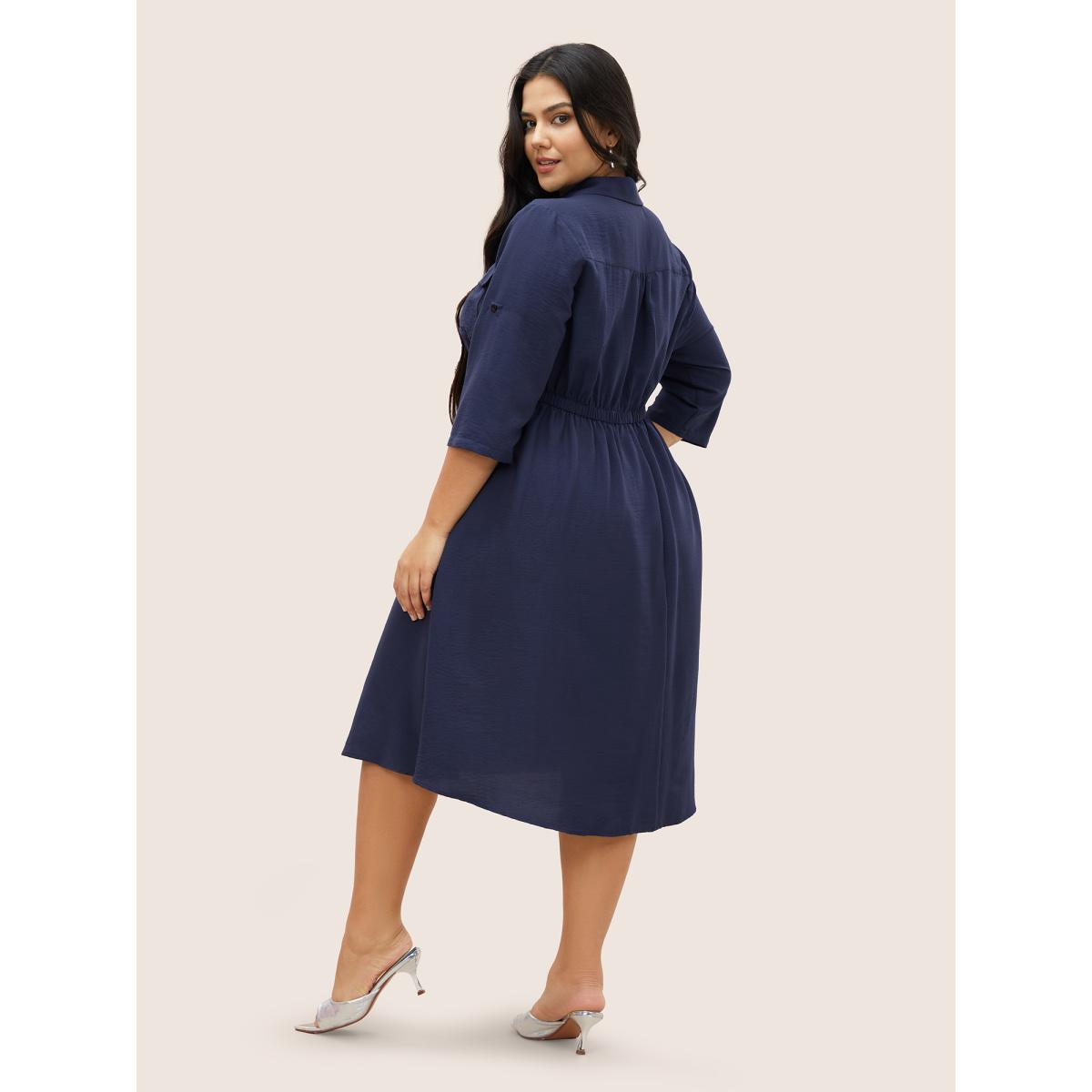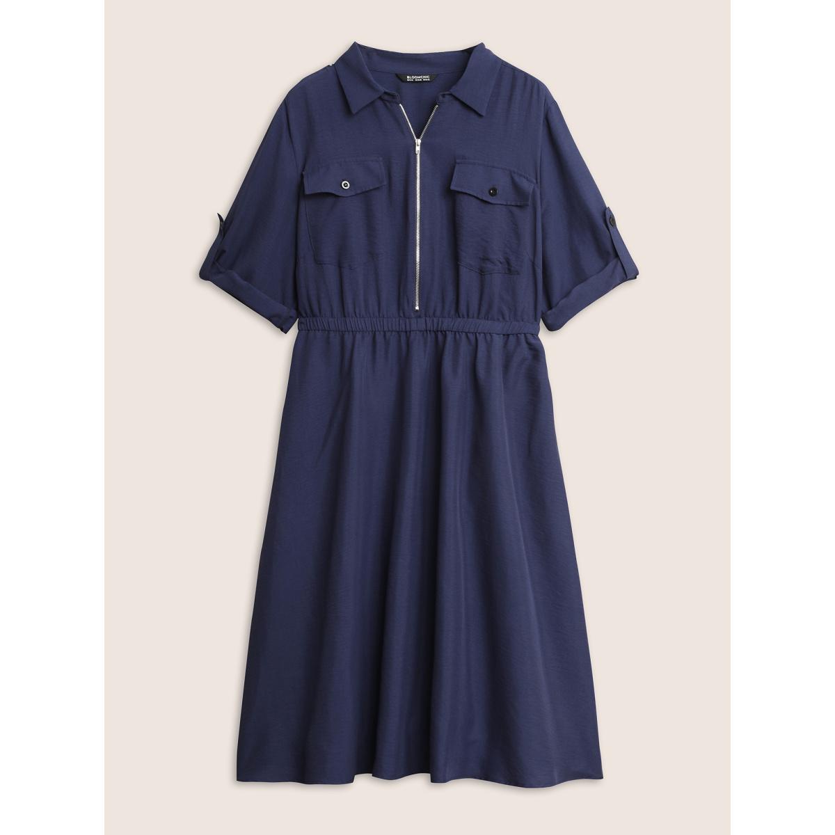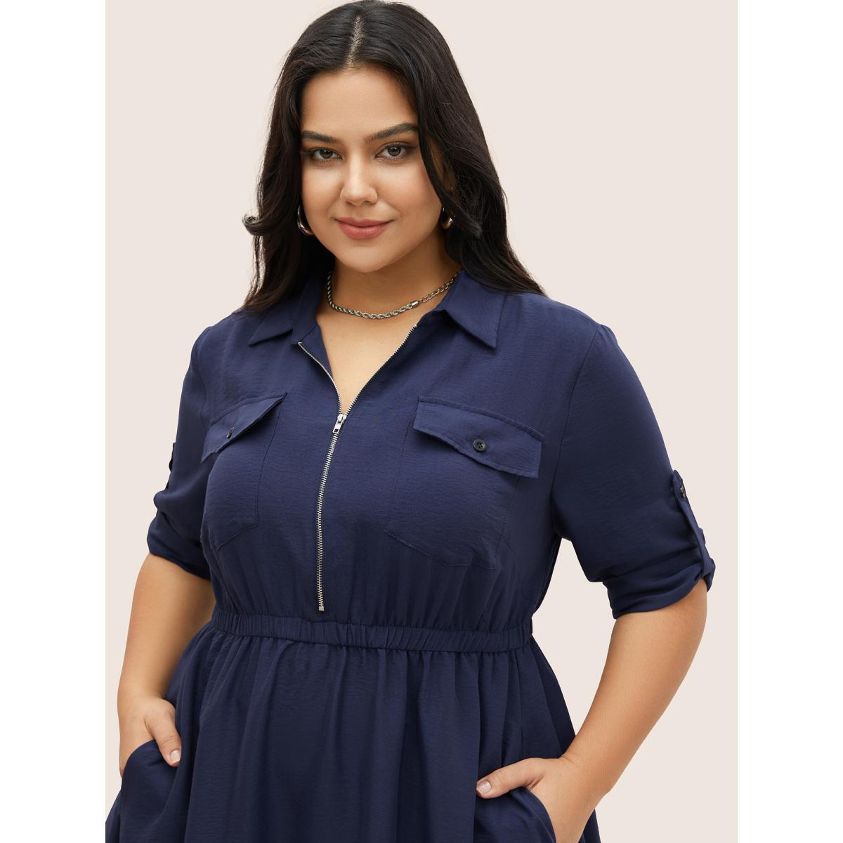 Plus Size Flap Pocket Half Zip Tab Sleeve Dress DarkBlue Women At the Office Gathered Polo Elbow-length sleeve Curvy Midi Dress BloomChic 26/4X