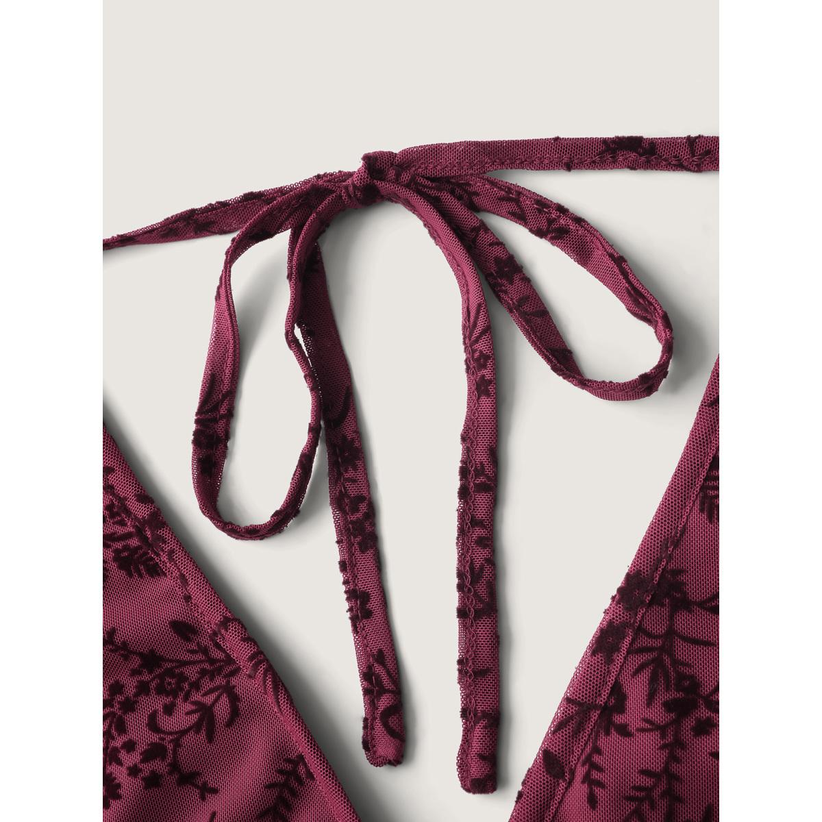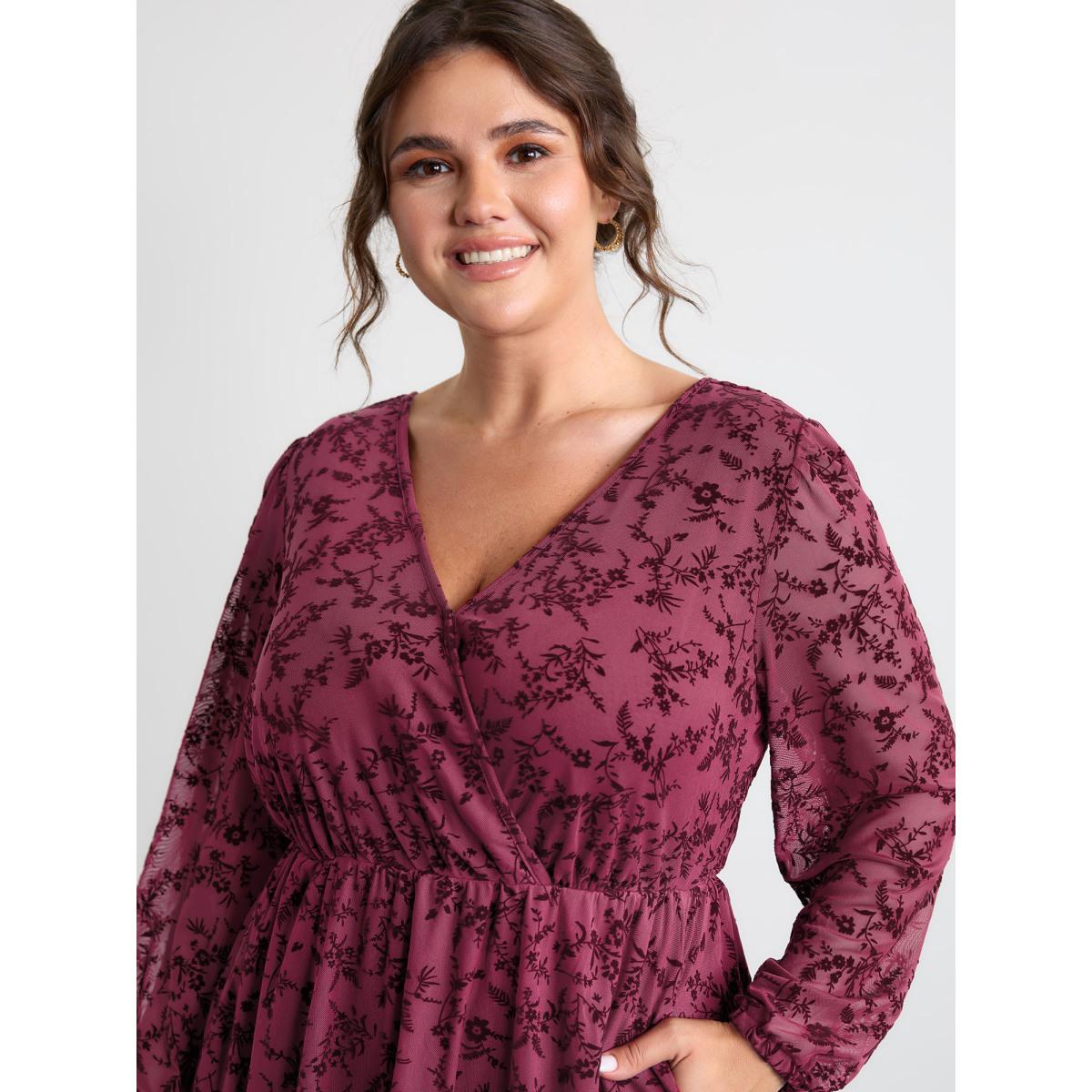 Plus Size Flocked Wrap Backless Tie Pockets Mini Dress Deepred Women Romantic V-neck Long Sleeve Curvy BloomChic 22-24/3X Product Image