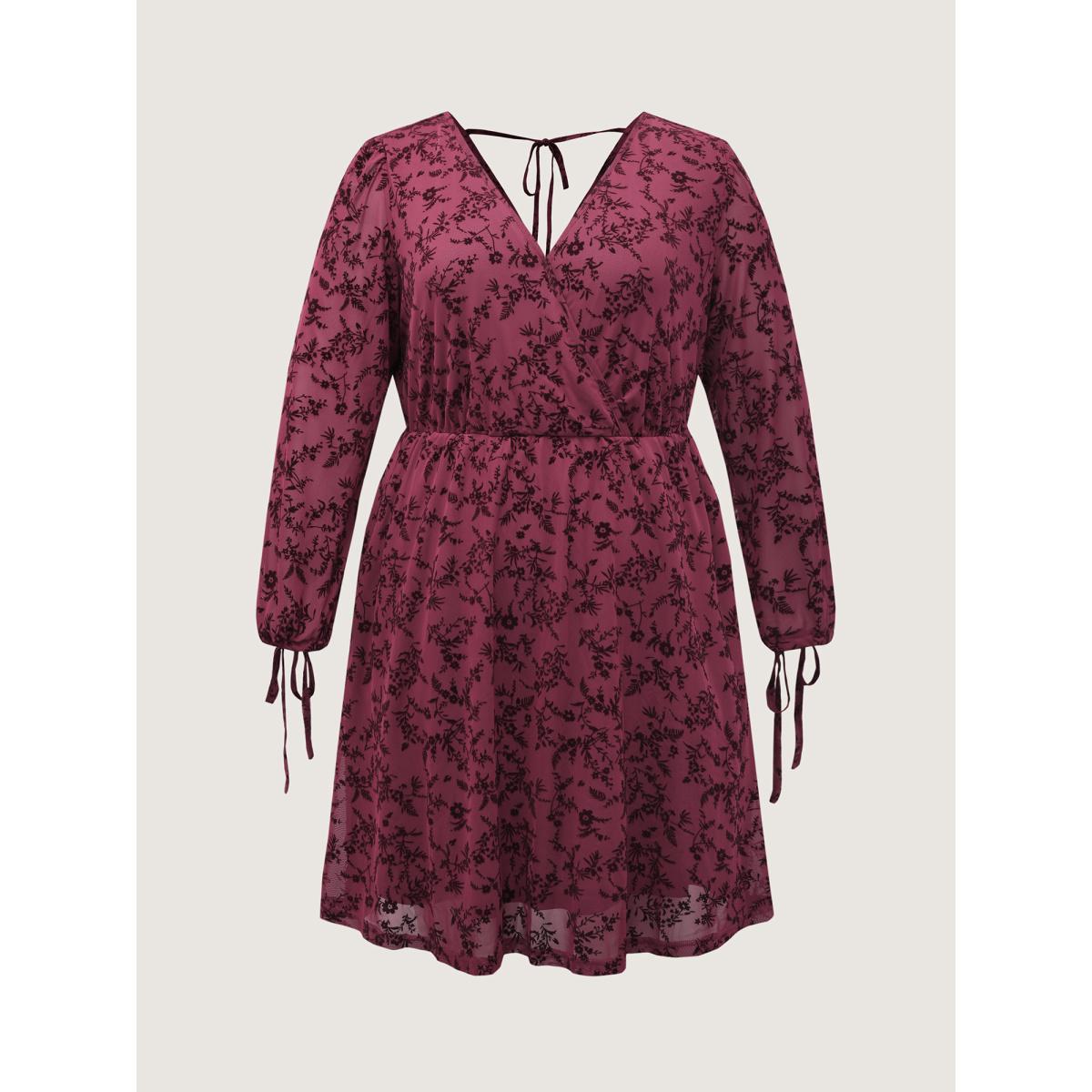 Plus Size Flocked Wrap Backless Tie Pockets Mini Dress Deepred Women Romantic V-neck Long Sleeve Curvy BloomChic 22-24/3X