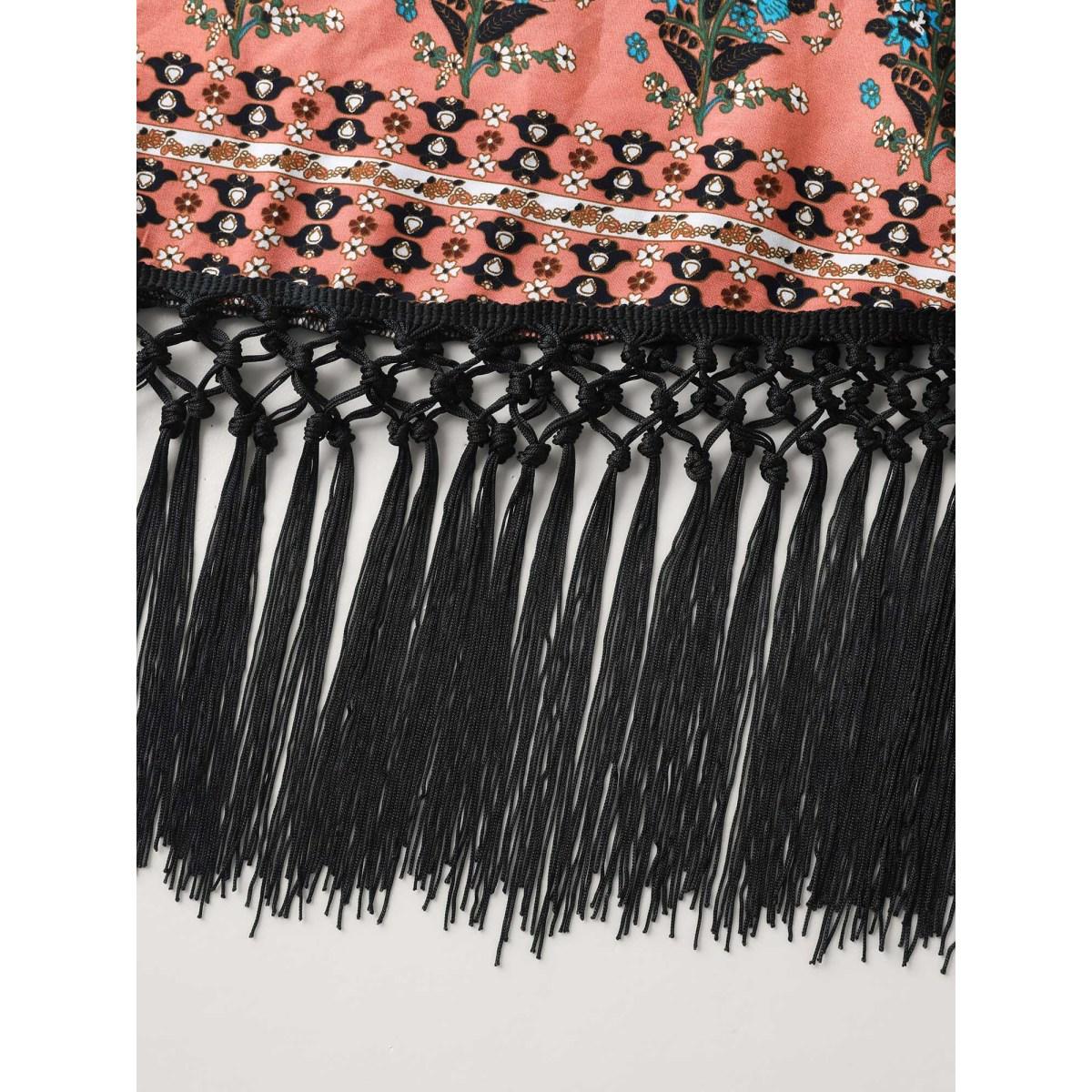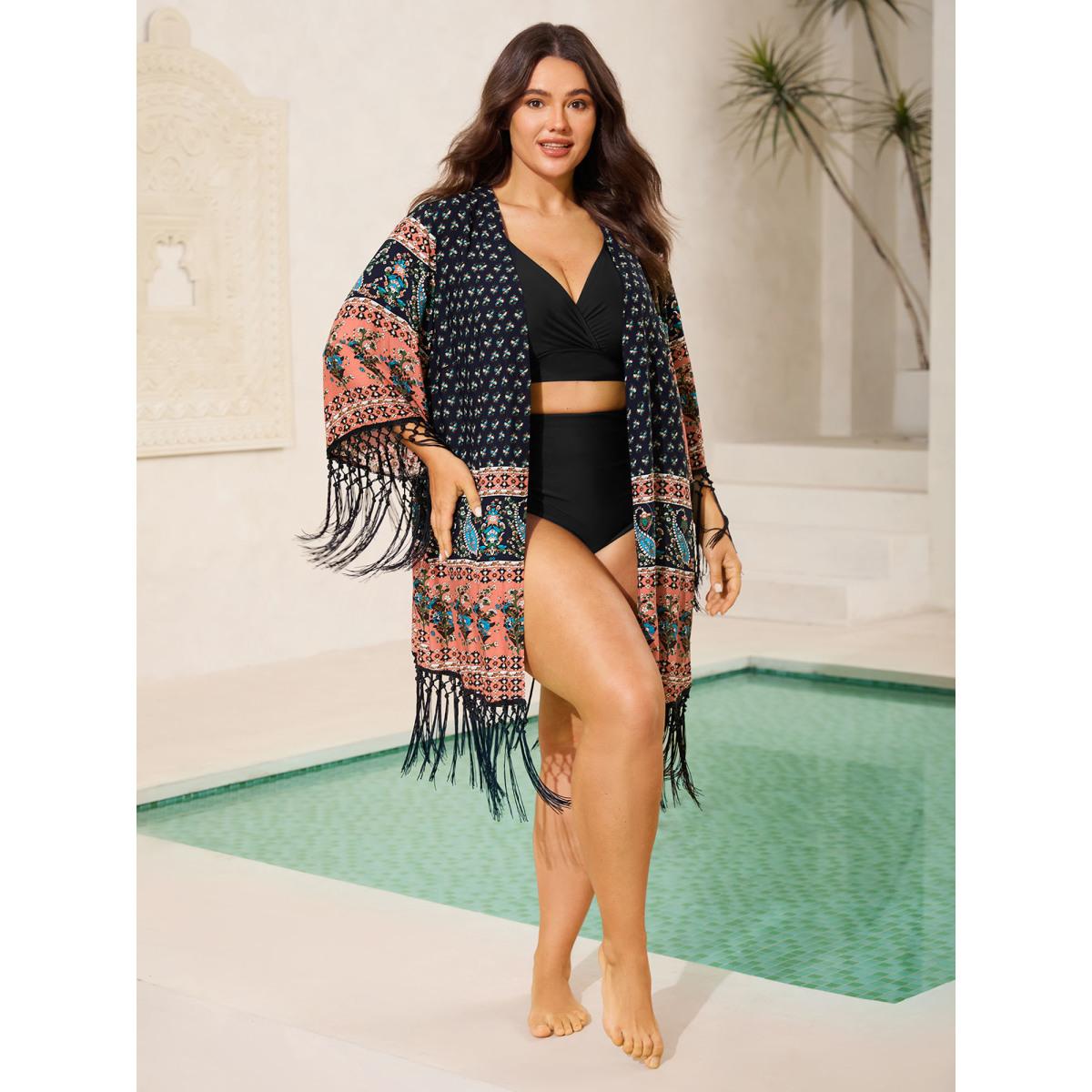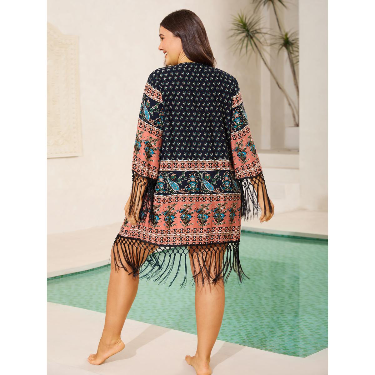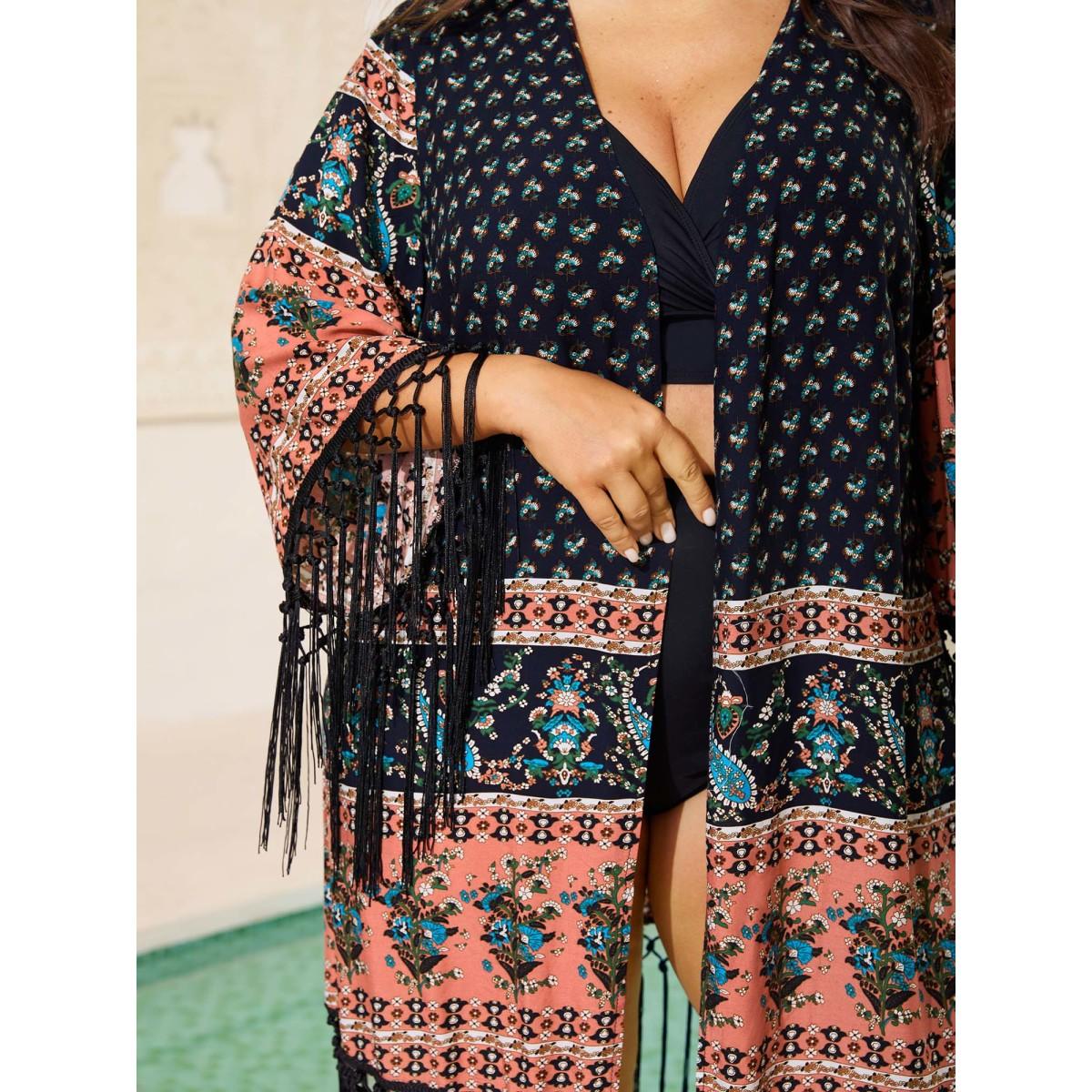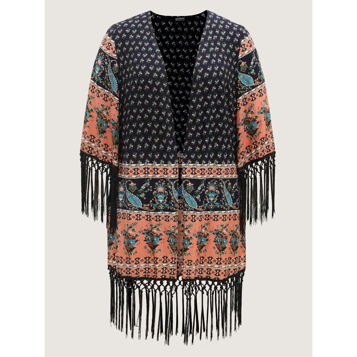 Plus Size Floral Boho Fringe Detail Kimono Women Indigo Tassels Vacation Kimonos BloomChic 22-24/3X