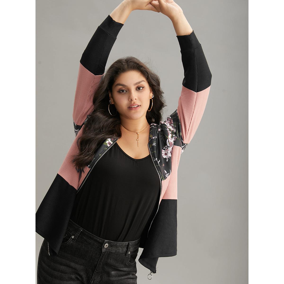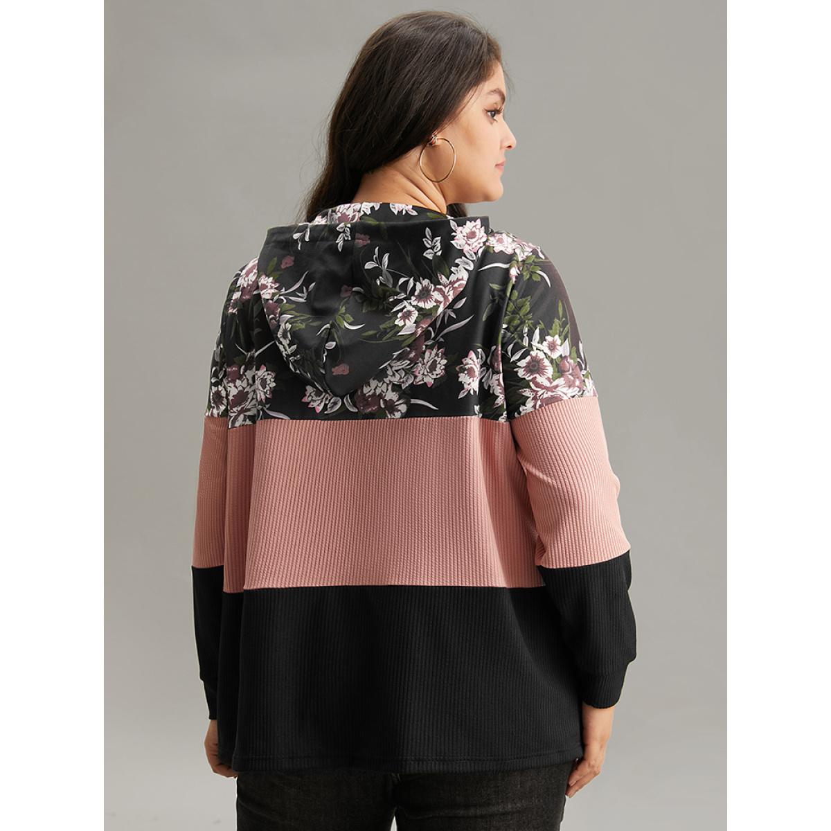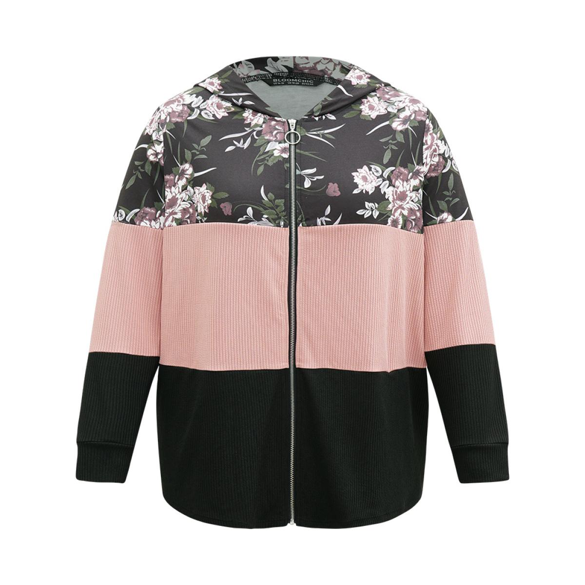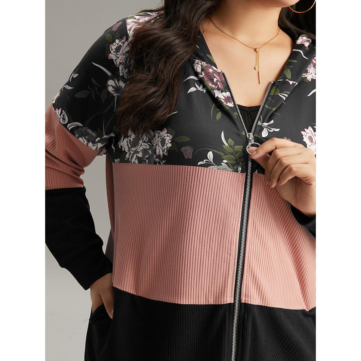Plus Size Floral Colorblock Contrast O Ring Zipper Hooded Sweatshirt Women Black Casual Texture Hooded Dailywear Sweatshirts BloomChic 10/M