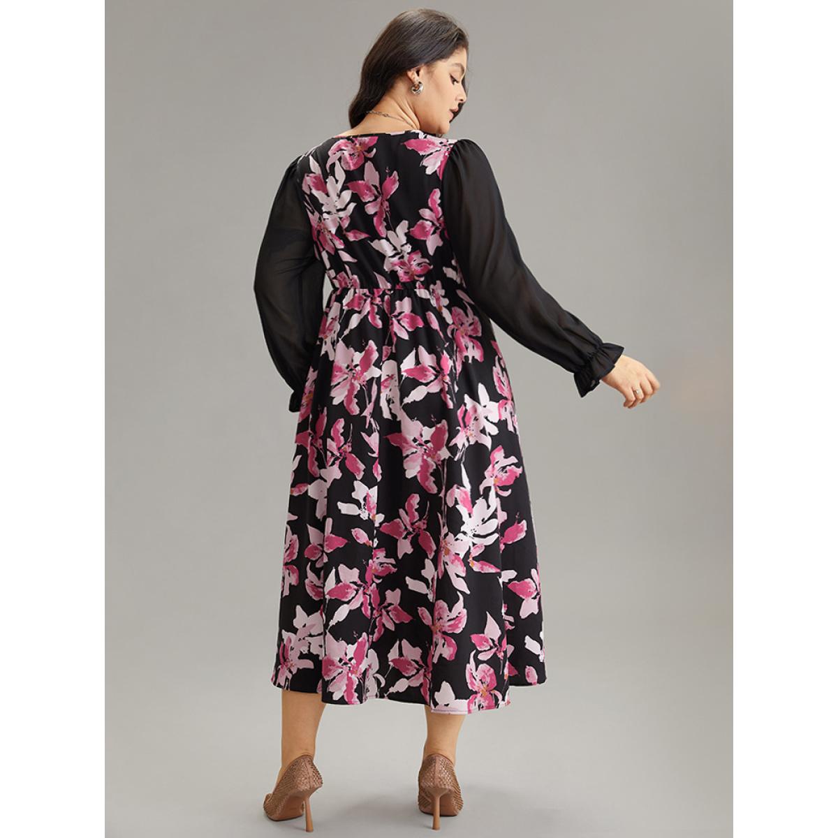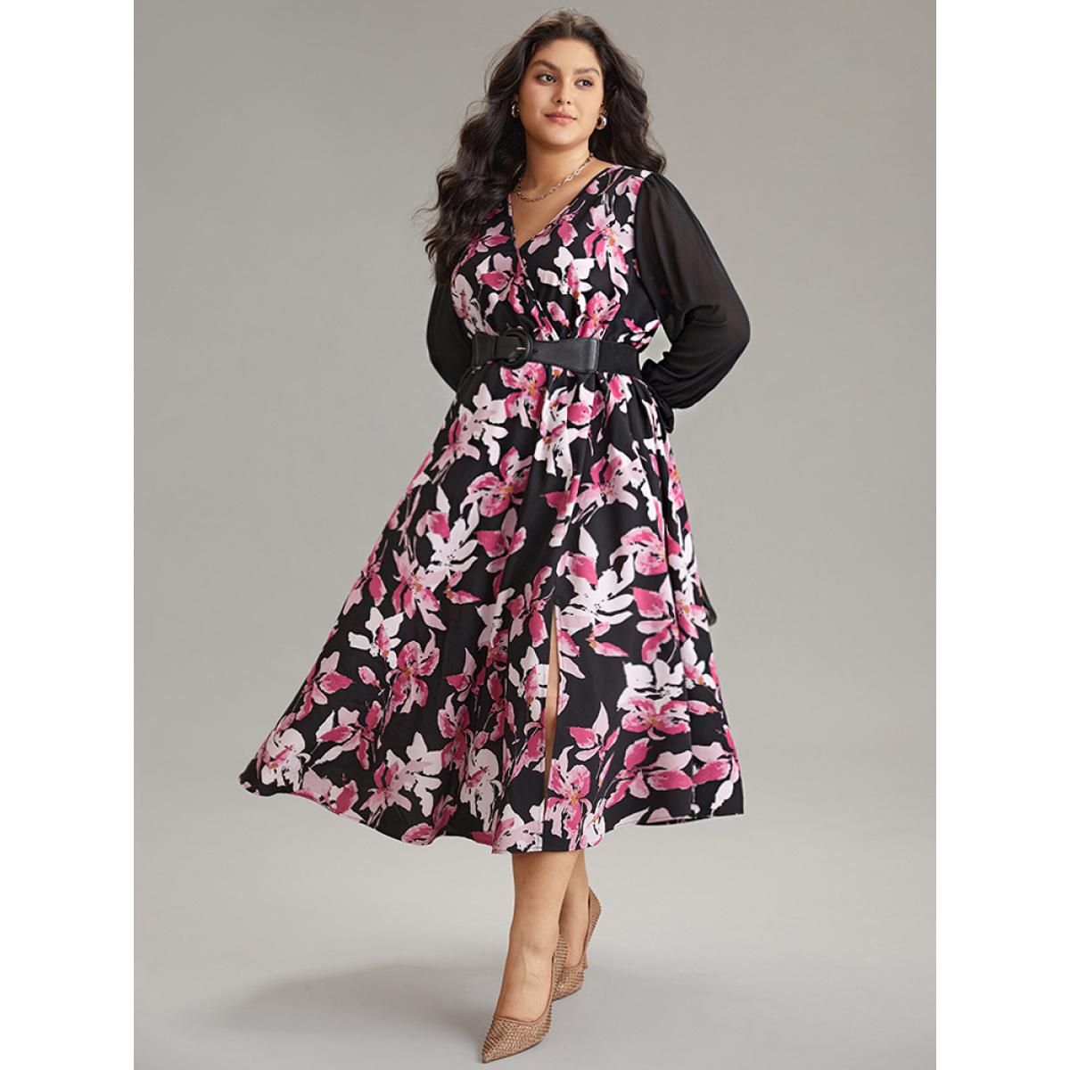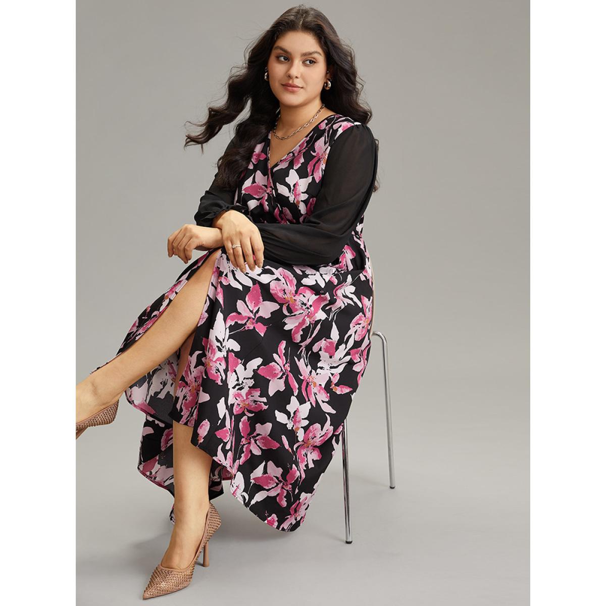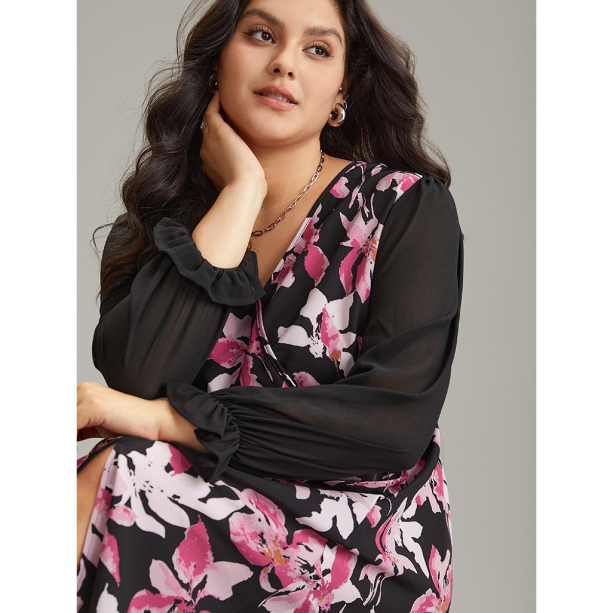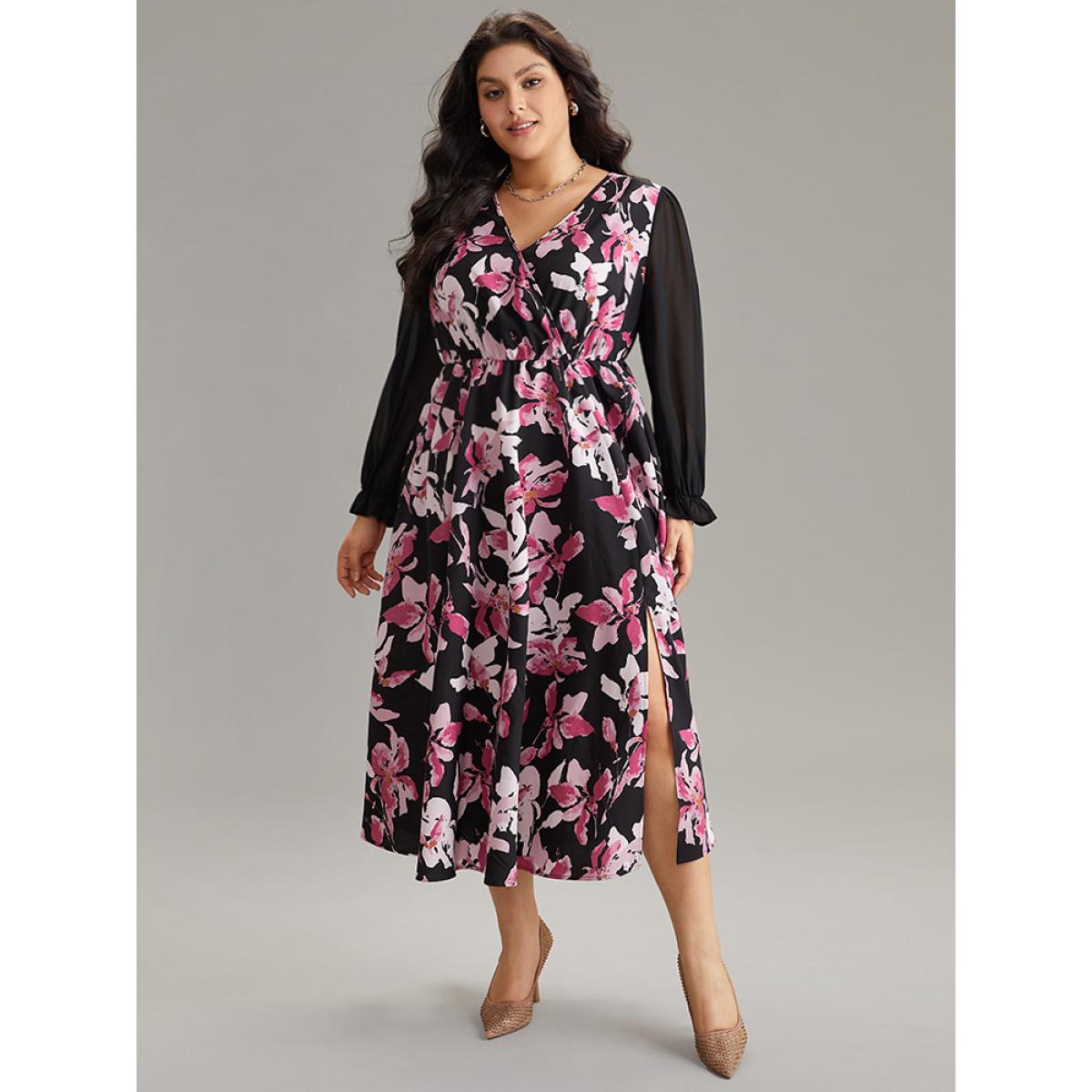 Plus Size Floral Contrast Wrap Chiffon Split Side Dress Black Women Office Wrap Overlap Collar Long Sleeve Curvy Midi Dress BloomChic 14-16/1X