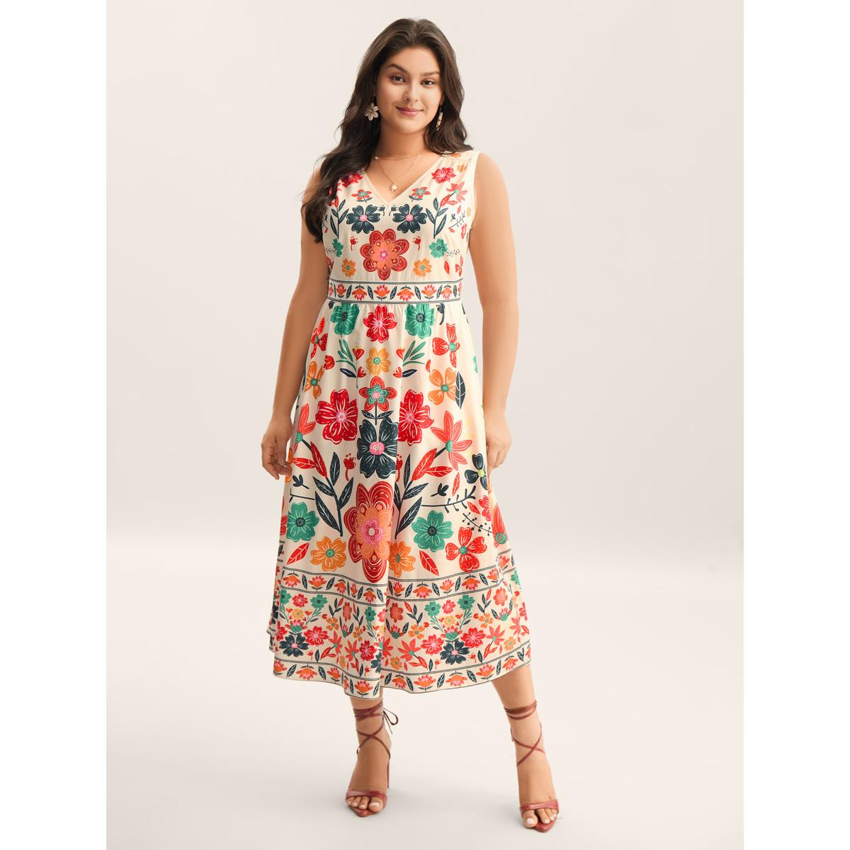 Plus Size Floral Drama Cinched-Waist Maxi Dress Multicolor Women Resort Non V-neck Sleeveless Curvy BloomChic 14-16/1X