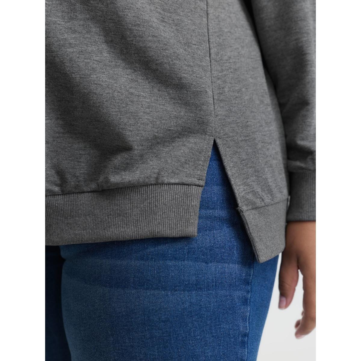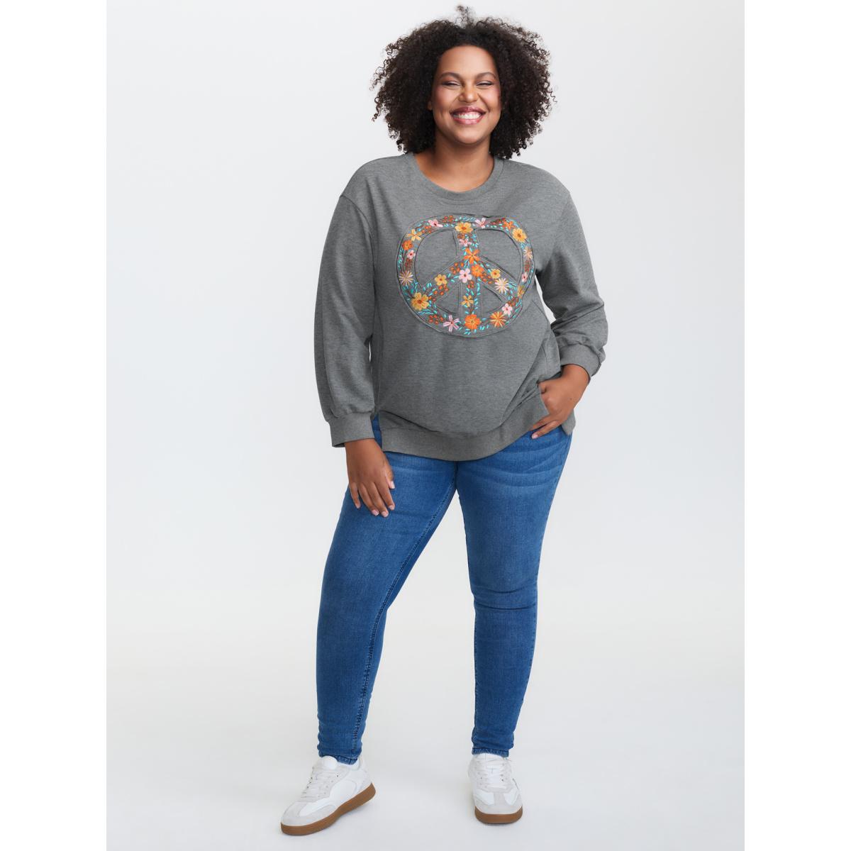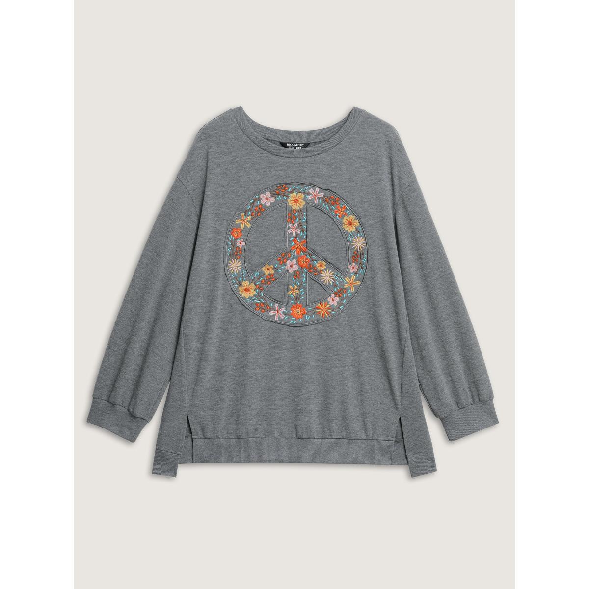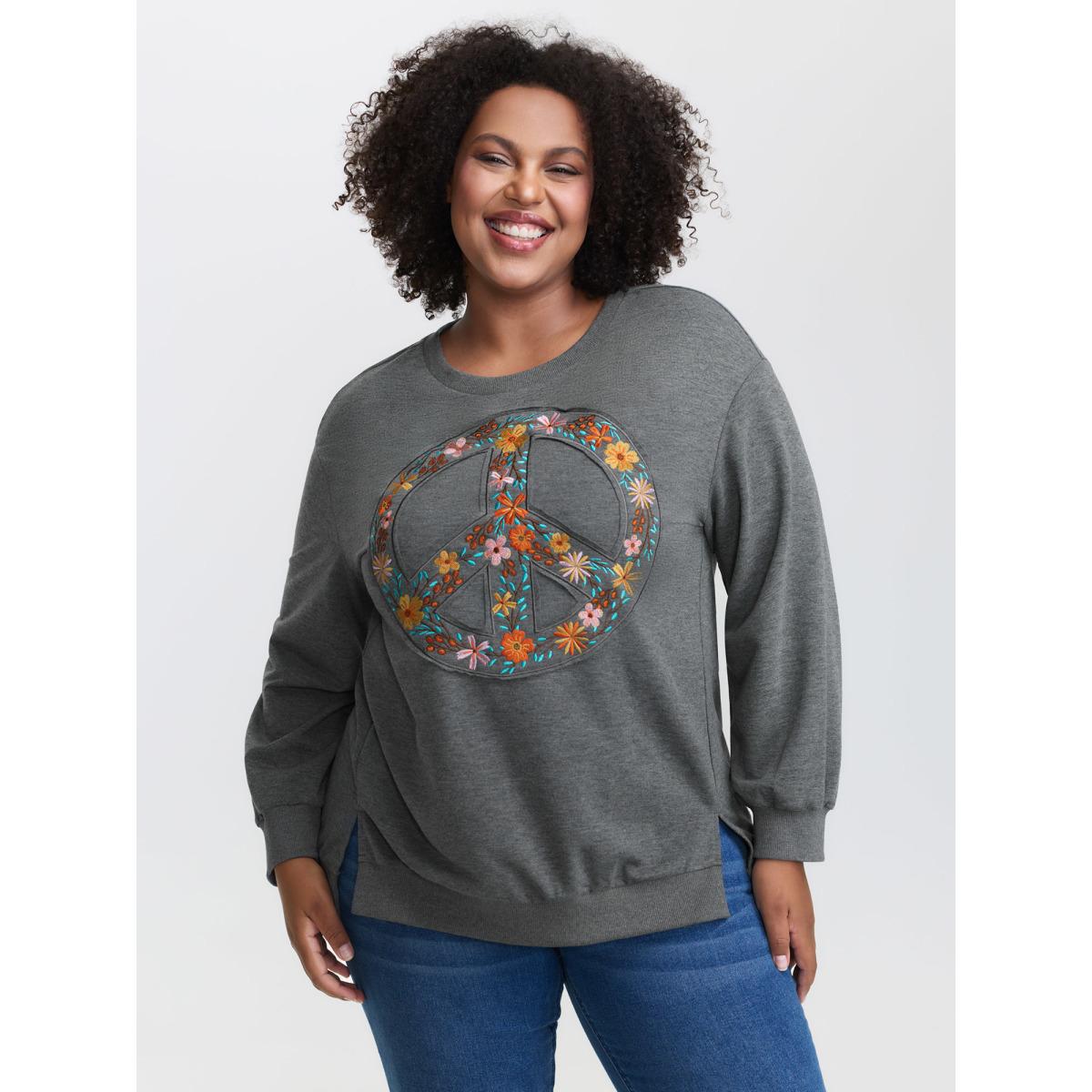 Plus Size Floral Embroidered Applique Slit Sweatshirt Women Mediumgray Leisure Embroidered Round Neck Casual Sweatshirts BloomChic 22-24/3X