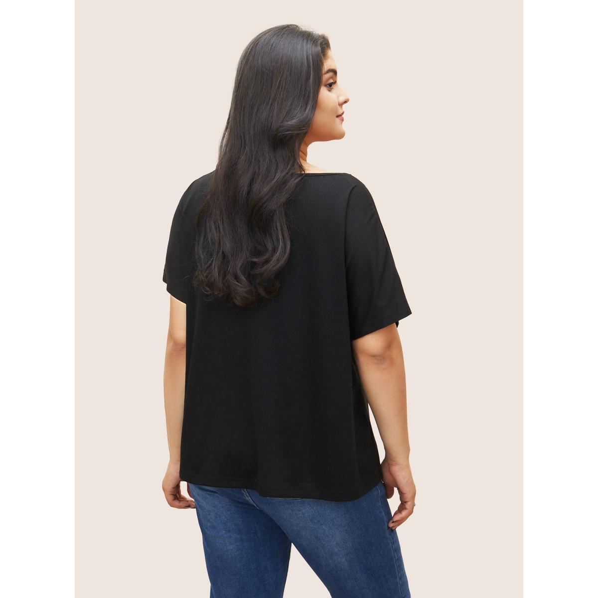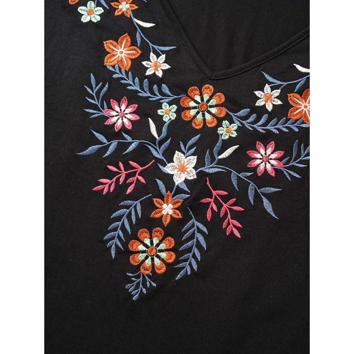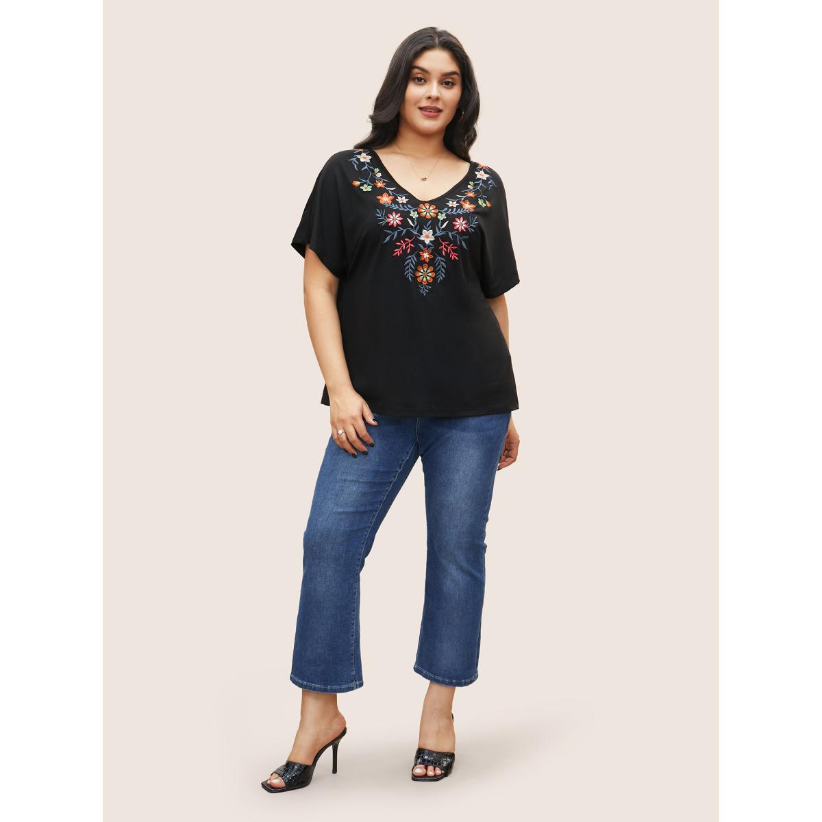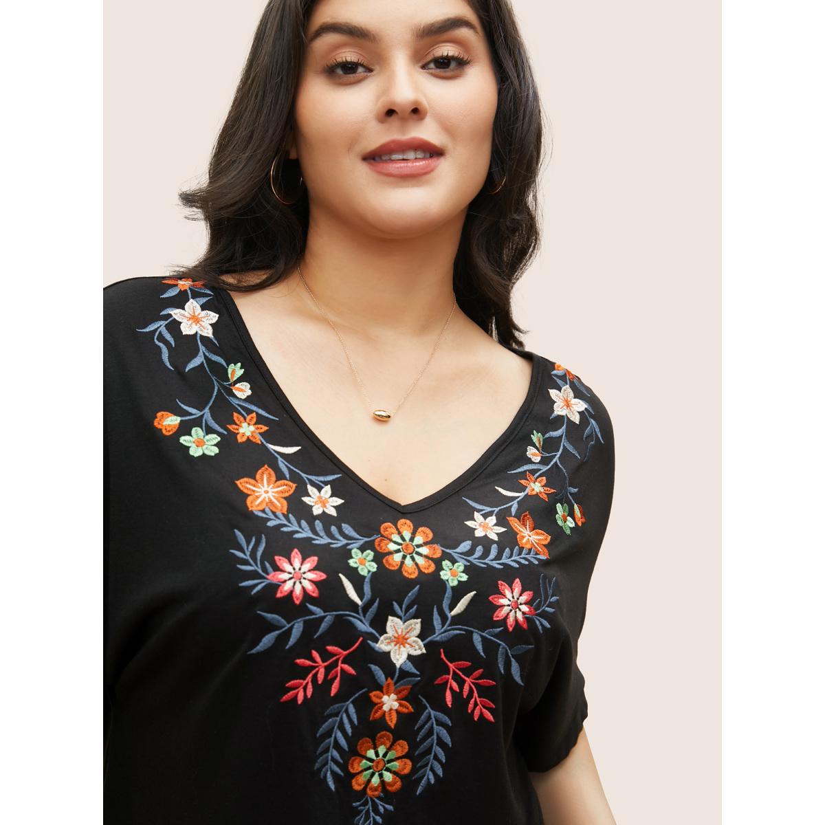Plus Size Floral Embroidered Batwing Sleeve T-shirt Black Women Resort Embroidered Floral V-neck Vacation T-shirts BloomChic 22-24/3X