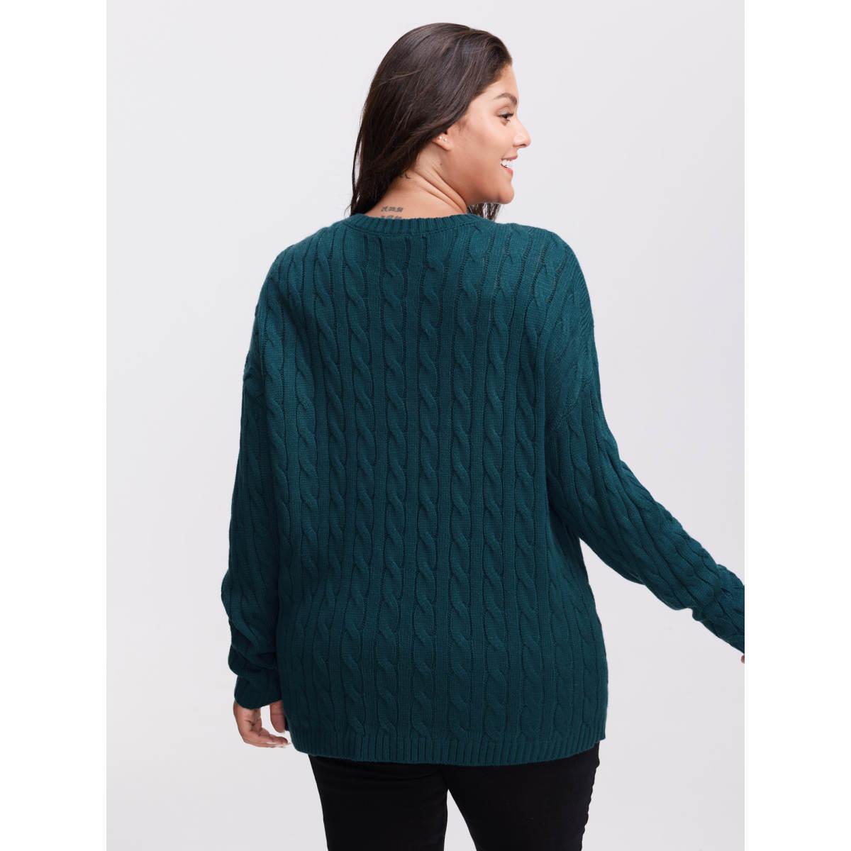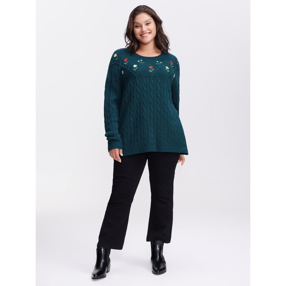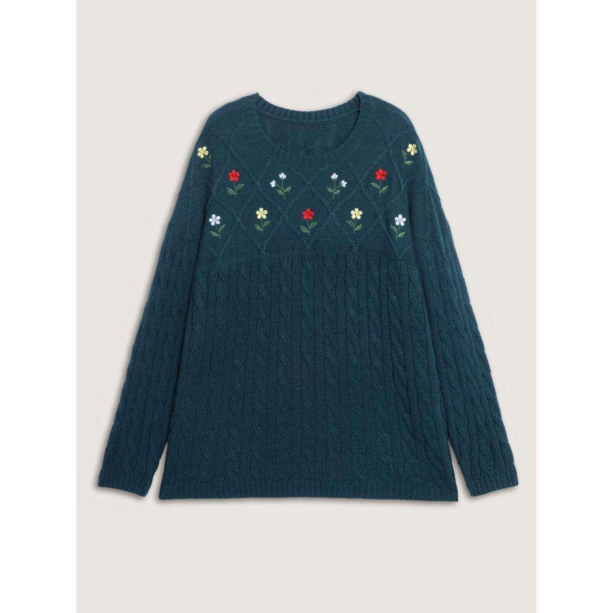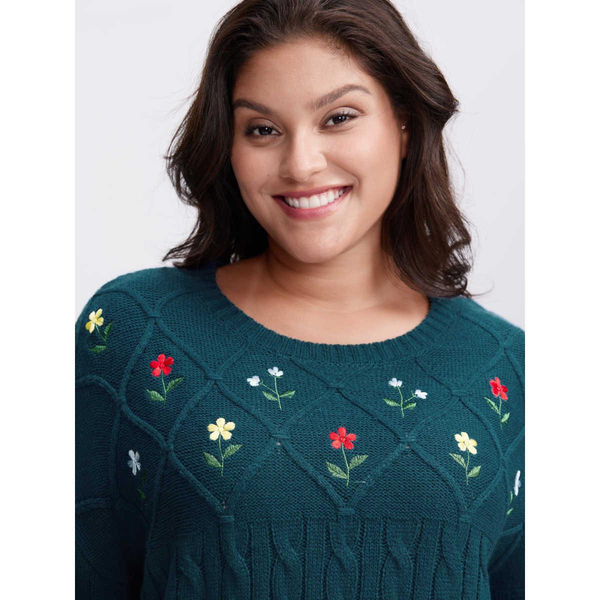 Plus Size Floral Embroidered Cable Knit Pullover Aegean Women Leisure Loose Long Sleeve Round Neck Casual Pullovers BloomChic 26/4X