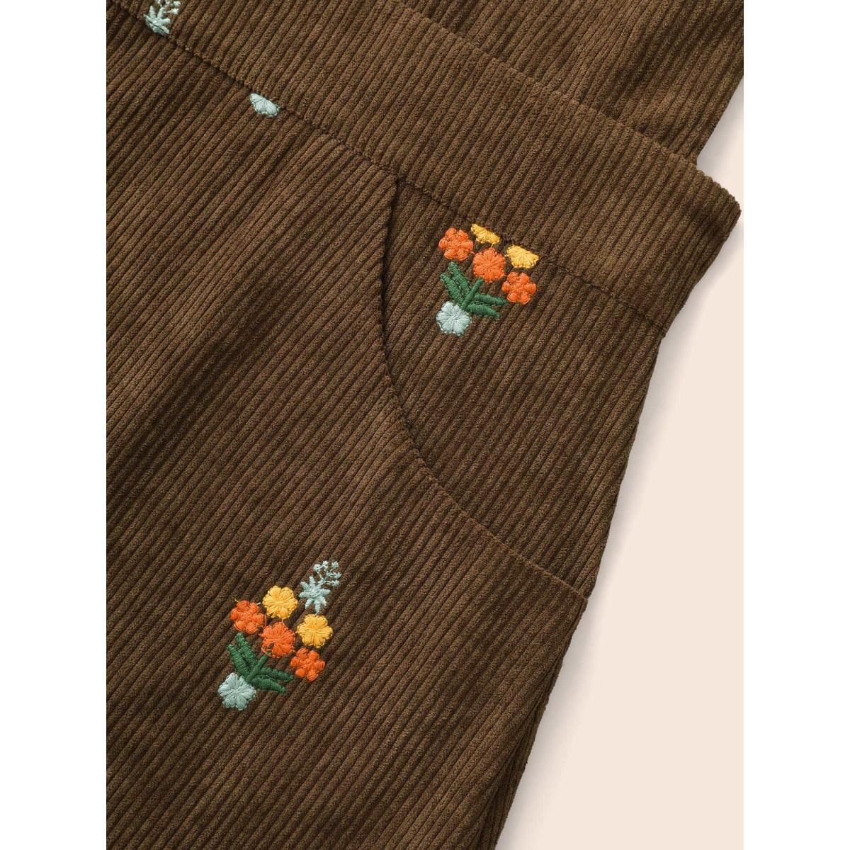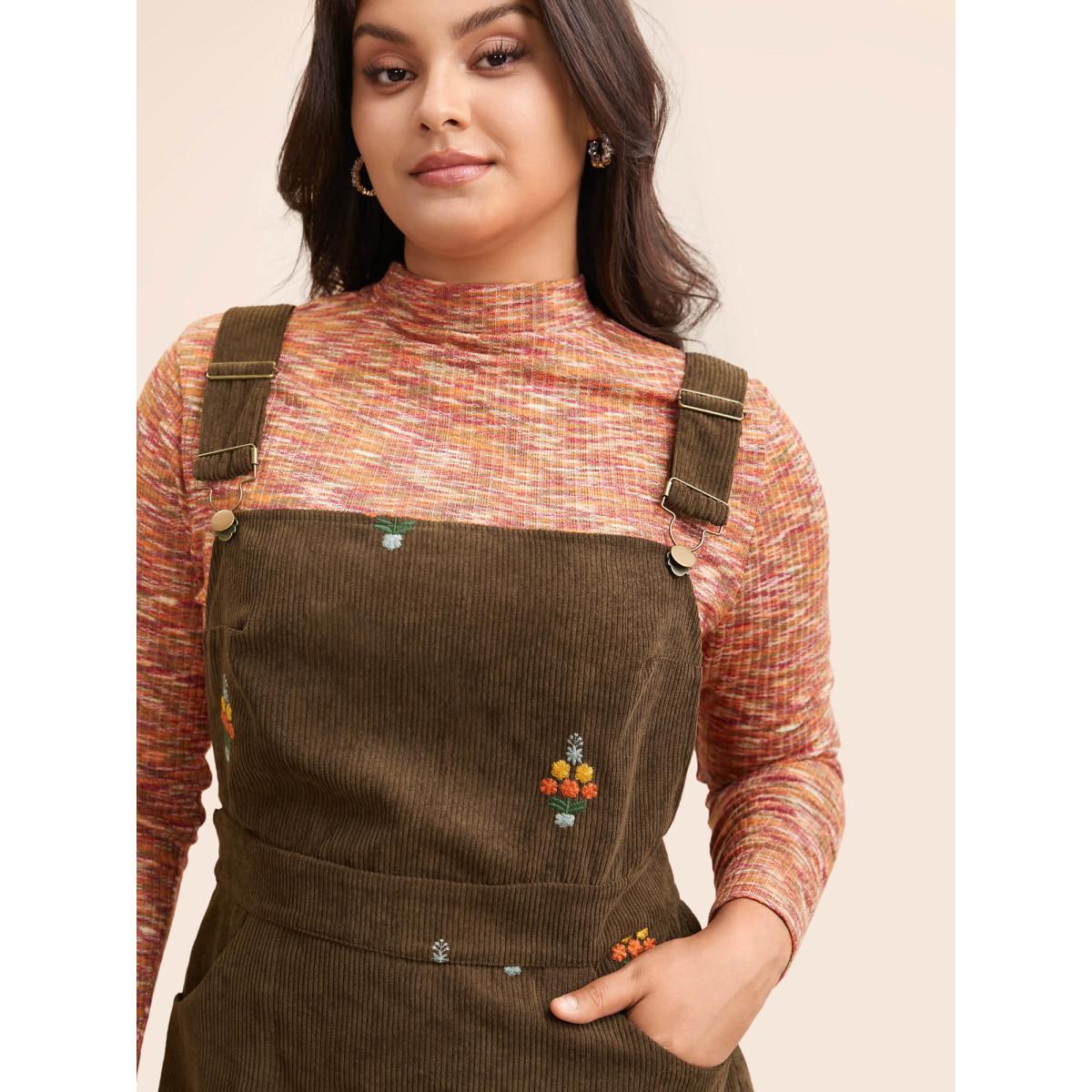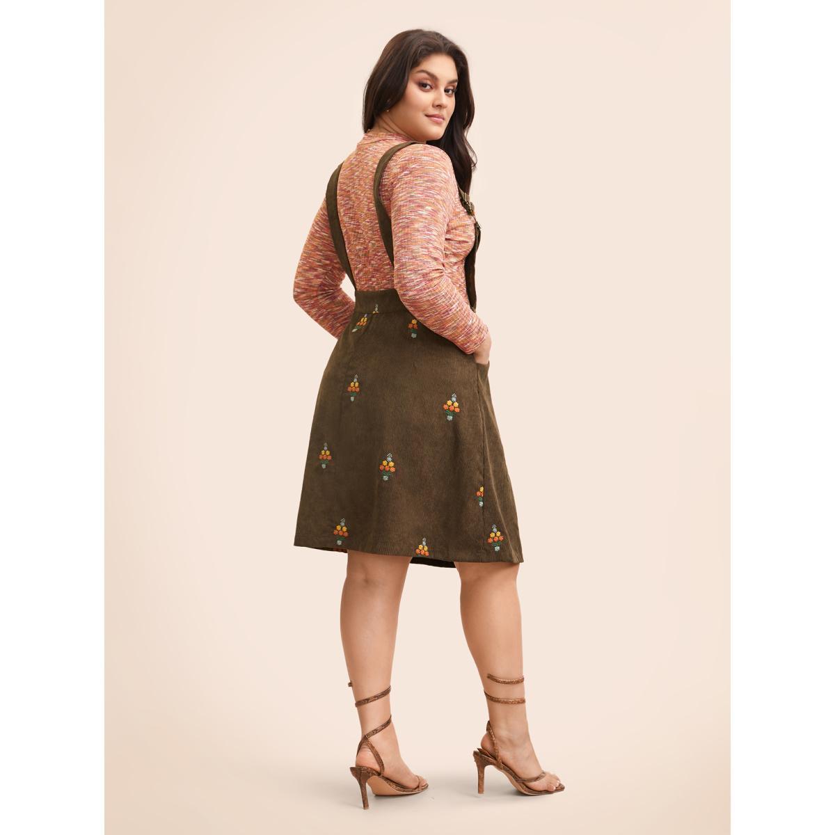 Plus Size Floral Embroidered Corduroy Overall Dress Yellowishbrown Women Elegant Texture Non Sleeveless Curvy BloomChic 22-24/3X