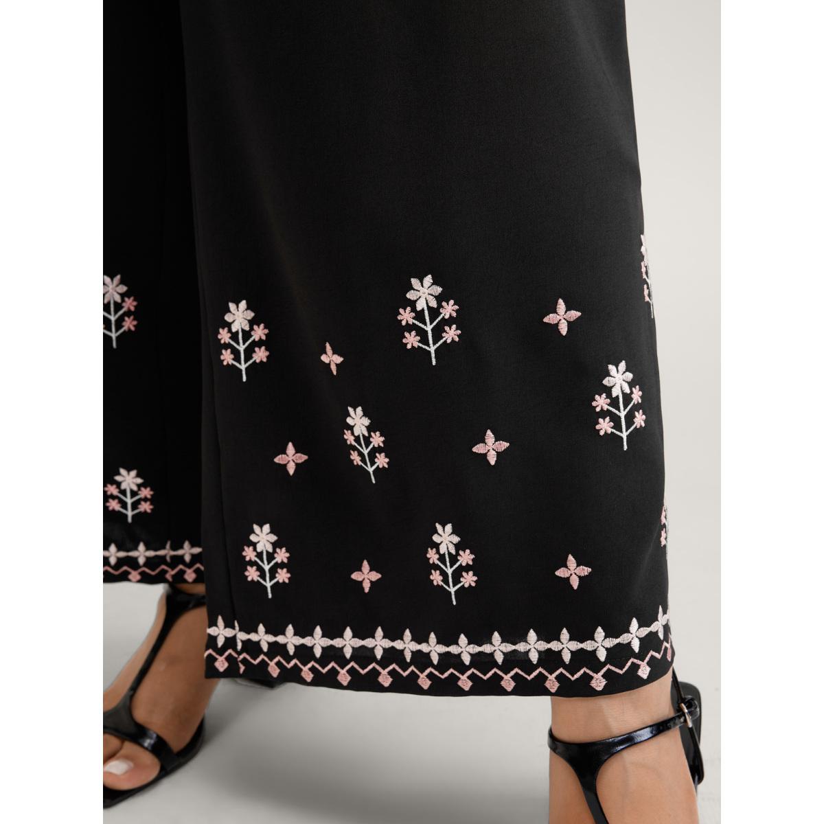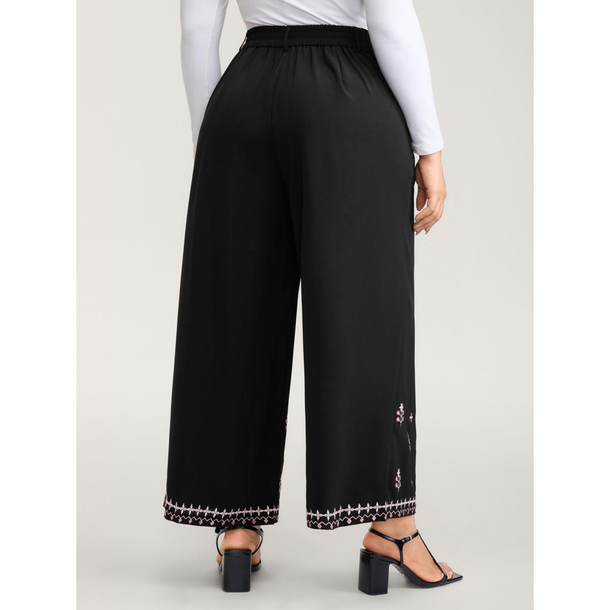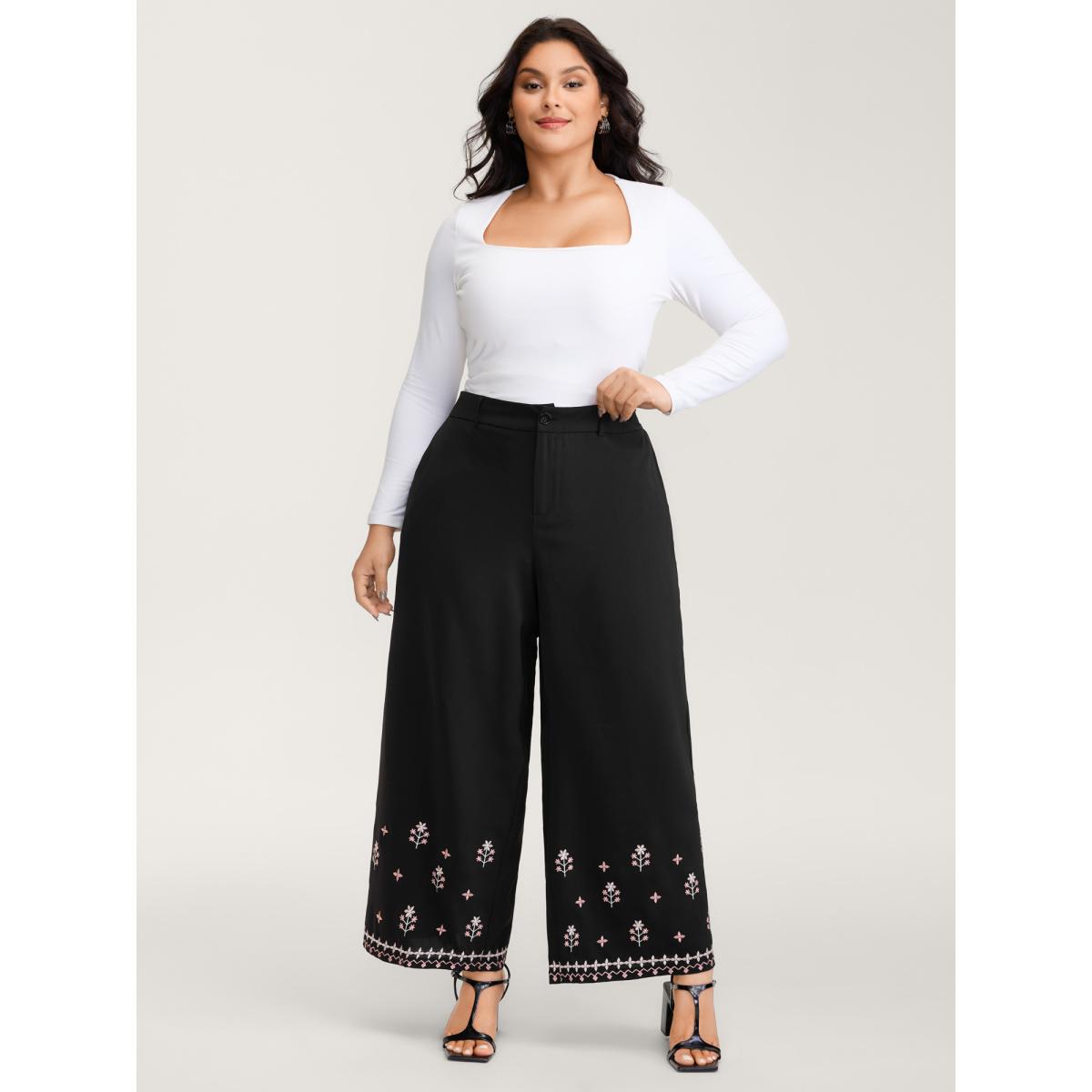 Plus Size Floral Embroidered Hem Wide-Leg Pants Women Black Timeless Wide Leg Mid Rise Elegant Pants BloomChic 26/4X