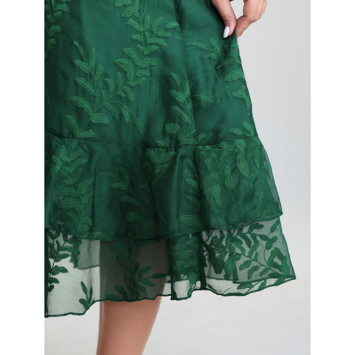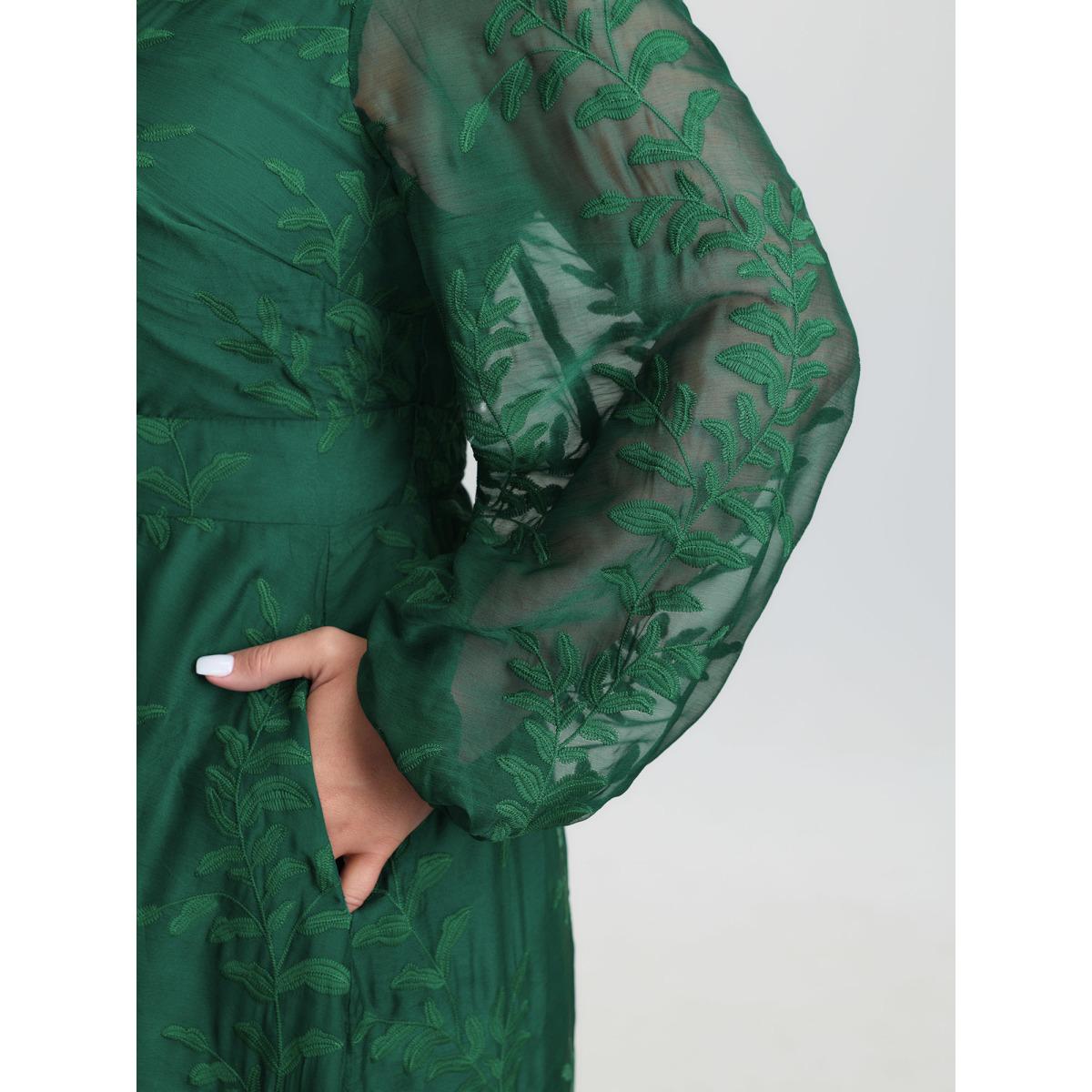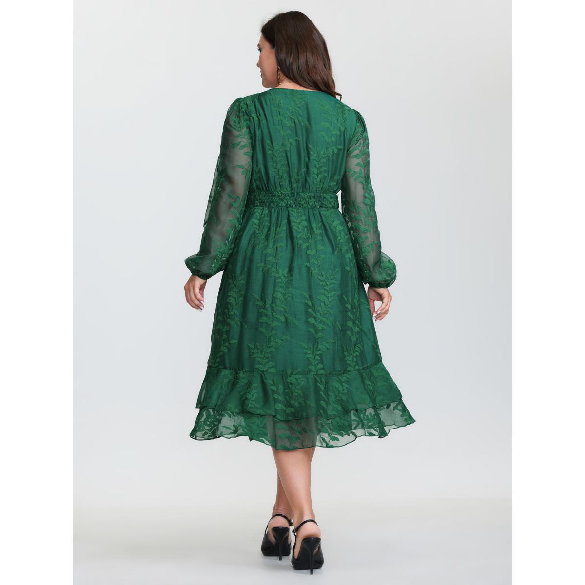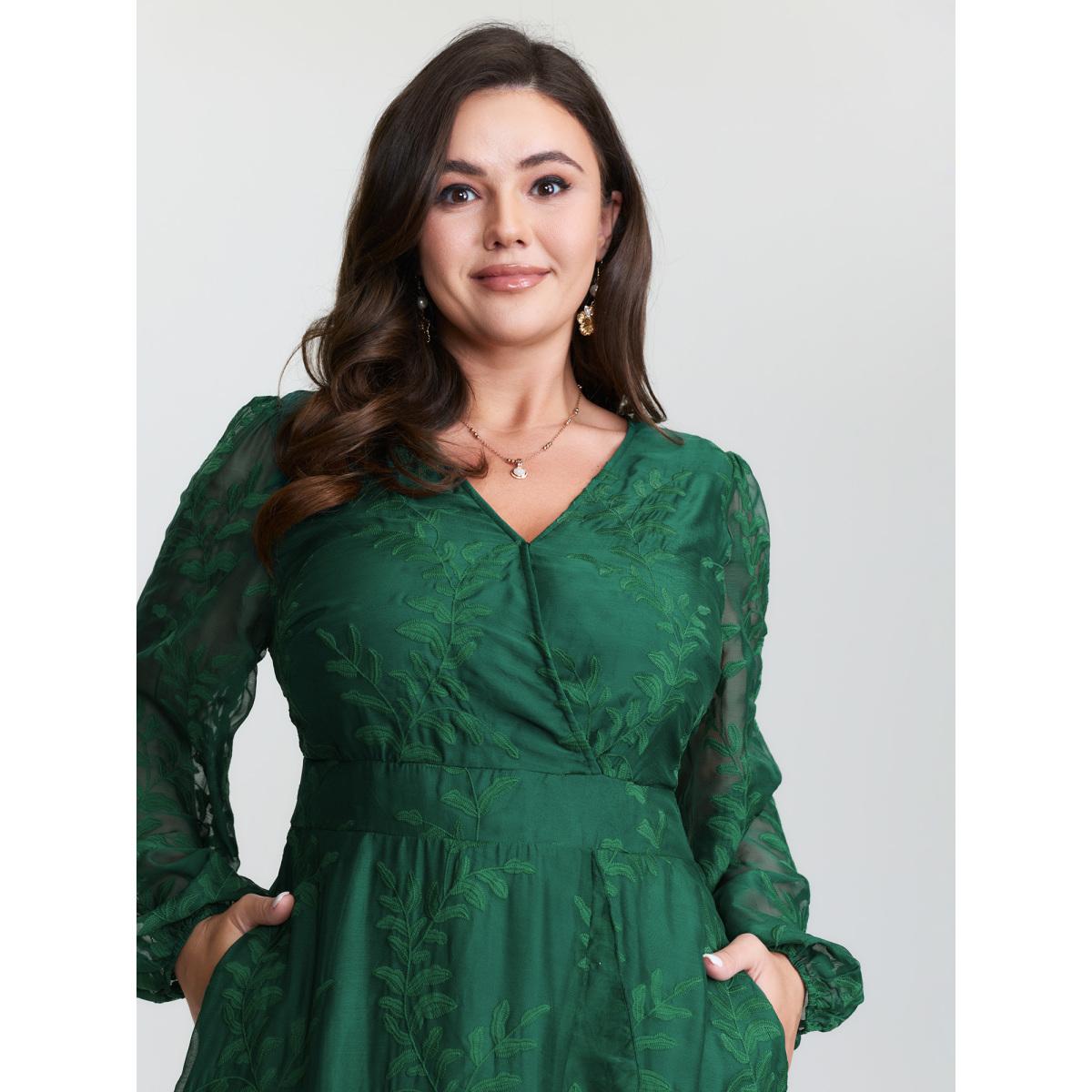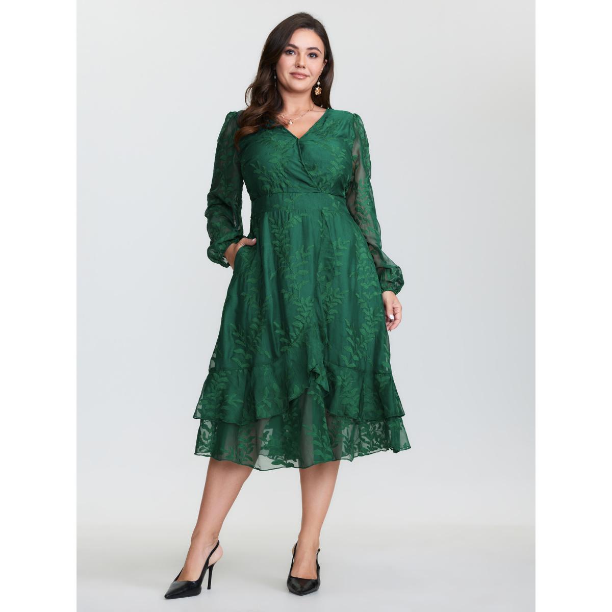 Plus Size Floral Embroidered Layered Hem Midi Dress DarkGreen Women Timeless Overlapping Overlap Collar Extra Long Sleeve Curvy BloomChic 12/L