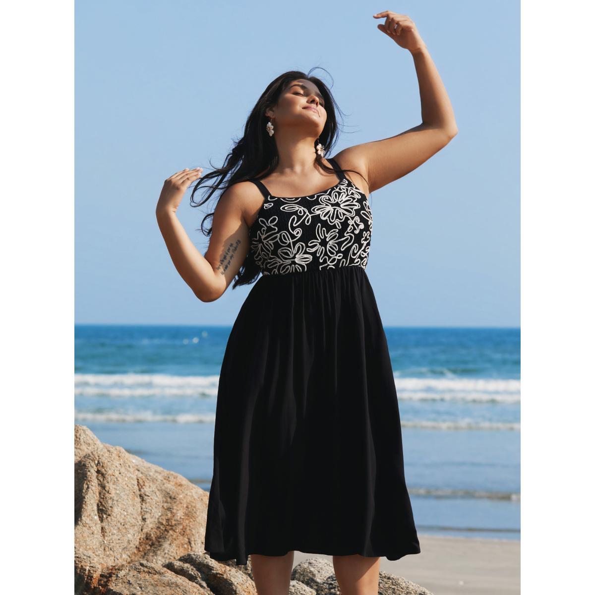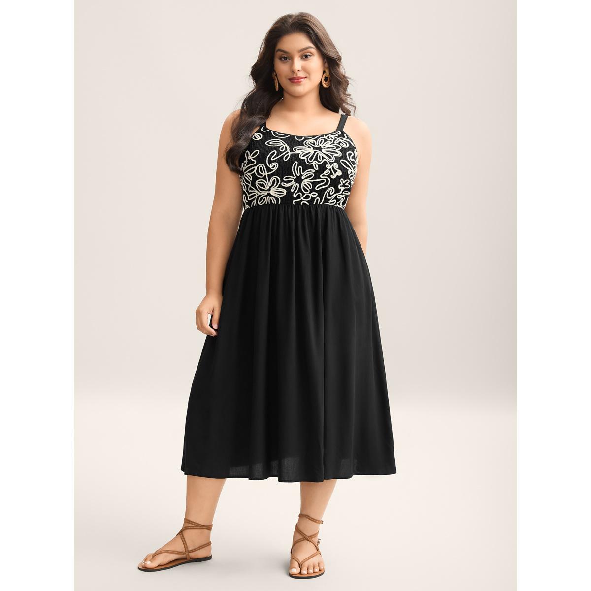 Plus Size Floral Embroidered Pockets Spliced Midi Dress Black Women U-neck Sleeveless Curvy BloomChic 10/M